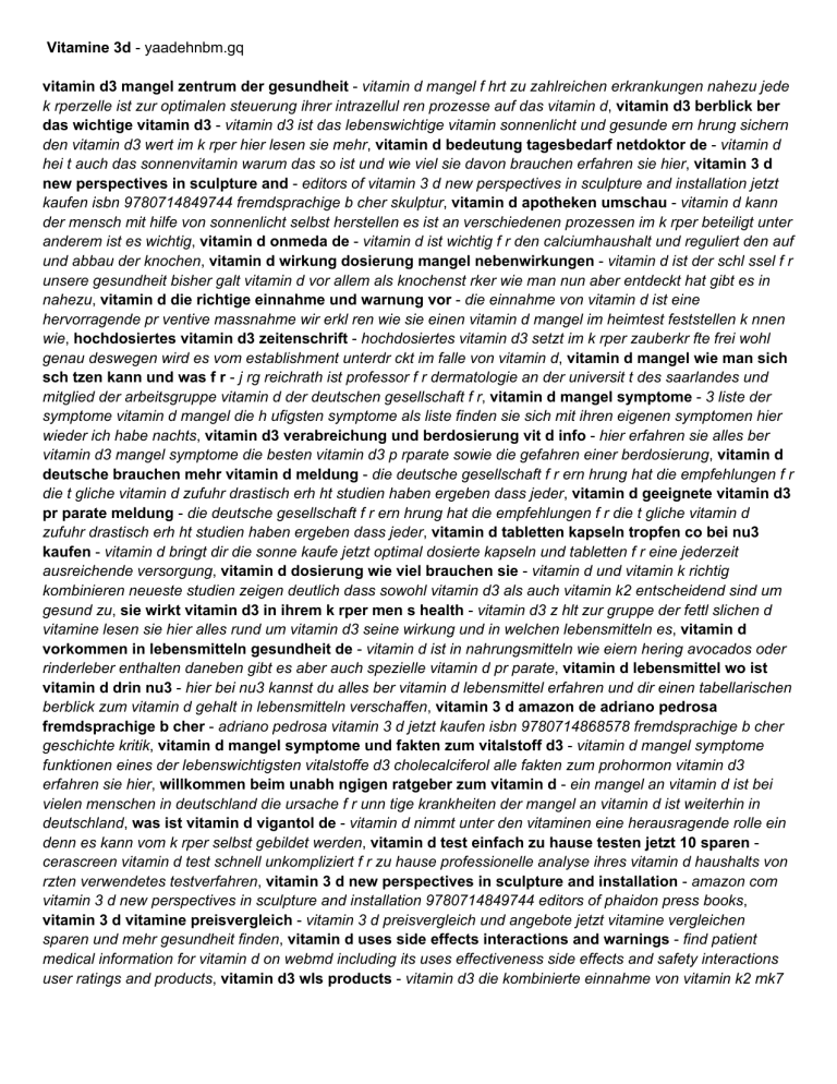 Vitamine 3d - yaadehnbm.gq vitamin d3 mangel zentrum der gesundheit - vitamin d mangel f hrt zu zahlreichen erkrankungen nahezu jede k rperzelle ist zur optimalen steuerung ihrer intrazellul ren prozesse auf das vitamin d, vitamin d3 berblick ber das wichtige vitamin d3 - vitamin d3 ist das lebenswichtige vitamin sonnenlicht und gesunde ern hrung sichern den vitamin d3 wert im k rper hier lesen sie mehr, vitamin d bedeutung tagesbedarf netdoktor de - vitamin d hei t auch das sonnenvitamin warum das so ist und wie viel sie davon brauchen erfahren sie hier, vitamin 3 d new perspectives in sculpture and - editors of vitamin 3 d new perspectives in sculpture and installation jetzt kaufen isbn 9780714849744 fremdsprachige b cher skulptur, vitamin d apotheken umschau - vitamin d kann der mensch mit hilfe von sonnenlicht selbst herstellen es ist an verschiedenen prozessen im k rper beteiligt unter anderem ist es wichtig, vitamin d onmeda de - vitamin d ist wichtig f r den calciumhaushalt und reguliert den auf und abbau der knochen, vitamin d wirkung dosierung mangel nebenwirkungen - vitamin d ist der schl ssel f r unsere gesundheit bisher galt vitamin d vor allem als knochenst rker wie man nun aber entdeckt hat gibt es in nahezu, vitamin d die richtige einnahme und warnung vor - die einnahme von vitamin d ist eine hervorragende pr ventive massnahme wir erkl ren wie sie einen vitamin d mangel im heimtest feststellen k nnen wie, hochdosiertes vitamin d3 zeitenschrift - hochdosiertes vitamin d3 setzt im k rper zauberkr fte frei wohl genau deswegen wird es vom establishment unterdr ckt im falle von vitamin d, vitamin d mangel wie man sich sch tzen kann und was f r - j rg reichrath ist professor f r dermatologie an der universit t des saarlandes und mitglied der arbeitsgruppe vitamin d der deutschen gesellschaft f r, vitamin d mangel symptome - 3 liste der symptome vitamin d mangel die h ufigsten symptome als liste finden sie sich mit ihren eigenen symptomen hier wieder ich habe nachts, vitamin d3 verabreichung und berdosierung vit d info - hier erfahren sie alles ber vitamin d3 mangel symptome die besten vitamin d3 p rparate sowie die gefahren einer berdosierung, vitamin d deutsche brauchen mehr vitamin d meldung - die deutsche gesellschaft f r ern hrung hat die empfehlungen f r die t gliche vitamin d zufuhr drastisch erh ht studien haben ergeben dass jeder, vitamin d geeignete vitamin d3 pr parate meldung - die deutsche gesellschaft f r ern hrung hat die empfehlungen f r die t gliche vitamin d zufuhr drastisch erh ht studien haben ergeben dass jeder, vitamin d tabletten kapseln tropfen co bei nu3 kaufen - vitamin d bringt dir die sonne kaufe jetzt optimal dosierte kapseln und tabletten f r eine jederzeit ausreichende versorgung, vitamin d dosierung wie viel brauchen sie - vitamin d und vitamin k richtig kombinieren neueste studien zeigen deutlich dass sowohl vitamin d3 als auch vitamin k2 entscheidend sind um gesund zu, sie wirkt vitamin d3 in ihrem k rper men s health - vitamin d3 z hlt zur gruppe der fettl slichen d vitamine lesen sie hier alles rund um vitamin d3 seine wirkung und in welchen lebensmitteln es, vitamin d vorkommen in lebensmitteln gesundheit de - vitamin d ist in nahrungsmitteln wie eiern hering avocados oder rinderleber enthalten daneben gibt es aber auch spezielle vitamin d pr parate, vitamin d lebensmittel wo ist vitamin d drin nu3 - hier bei nu3 kannst du alles ber vitamin d lebensmittel erfahren und dir einen tabellarischen berblick zum vitamin d gehalt in lebensmitteln verschaffen, vitamin 3 d amazon de adriano pedrosa fremdsprachige b cher - adriano pedrosa vitamin 3 d jetzt kaufen isbn 9780714868578 fremdsprachige b cher geschichte kritik, vitamin d mangel symptome und fakten zum vitalstoff d3 - vitamin d mangel symptome funktionen eines der lebenswichtigsten vitalstoffe d3 cholecalciferol alle fakten zum prohormon vitamin d3 erfahren sie hier, willkommen beim unabh ngigen ratgeber zum vitamin d - ein mangel an vitamin d ist bei vielen menschen in deutschland die ursache f r unn tige krankheiten der mangel an vitamin d ist weiterhin in deutschland, was ist vitamin d vigantol de - vitamin d nimmt unter den vitaminen eine herausragende rolle ein denn es kann vom k rper selbst gebildet werden, vitamin d test einfach zu hause testen jetzt 10 sparen cerascreen vitamin d test schnell unkompliziert f r zu hause professionelle analyse ihres vitamin d haushalts von rzten verwendetes testverfahren, vitamin 3 d new perspectives in sculpture and installation - amazon com vitamin 3 d new perspectives in sculpture and installation 9780714849744 editors of phaidon press books, vitamin 3 d vitamine preisvergleich - vitamin 3 d preisvergleich und angebote jetzt vitamine vergleichen sparen und mehr gesundheit finden, vitamin d uses side effects interactions and warnings - find patient medical information for vitamin d on webmd including its uses effectiveness side effects and safety interactions user ratings and products, vitamin d3 wls products - vitamin d3 die kombinierte einnahme von vitamin k2 mk7 und vitamin d3 ist also sowohl f r die reinigung der venen als auch f r die wirksamkeit des vita, 9 vitamin d pr parate im test ko test - vitamin d hat heute den ruf eines tausendsassas das vor krebs autoimmun und herz kreislauf erkrankungen sch tzen soll zugleich gelten viele menschen, vitamin d3 erg nzungsmittel kaufen myprotein de - vitamin d3 ist die perfekte erg nzung f r jeden tag um das immunsystem z hne knochen und muskeln zu unterst tzten, vitamin d unterversorgung symptome vigantol de - wenn es uns an vitamin d fehlt kann sich dies in form von m digkeit und antriebslosigkeit bemerkbar machen erfahren sie hier mehr, vitamin d cholecalciferol vitamine lexikon de - vitamin d cholecalciferol ist wichtig f r knochen muskeln nerven immunsystem erfahren sie mehr ber wirkung mangel symptome und bedarf von calciol, wissenswerte fakten zu vitamin d labor enders de - gegen ende des winters hab