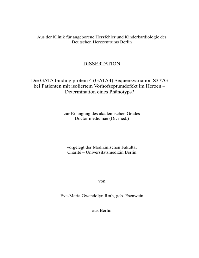Aus der Klinik für angeborene Herzfehler und Kinderkardiologie des Deutschen Herzzentrums Berlin DISSERTATION Die GATA binding protein 4 (GATA4) Sequenzvariation S377G bei Patienten mit isoliertem Vorhofseptumdefekt im Herzen – Determination eines Phänotyps? zur Erlangung des akademischen Grades Doctor medicinae (Dr. med.) vorgelegt der Medizinischen Fakultät Charité – Universitätsmedizin Berlin von Eva-Maria Gwendolyn Roth, geb. Esenwein aus Berlin Gutachter: 1. Prof. Dr. med. F. Berger 2. Prof. Dr. med. K. Brockmeier 3. Prof. Dr. med. Ch. Bührer Datum der Promotion: 29. Januar 2010 Inhaltsverzeichnis 1. 2. Einleitung............................................................................................................................ 1 1.1. Embryologie ................................................................................................................ 2 1.2. Herzentwicklung und GATA4 .................................................................................... 5 1.3. GATA4 und ASDII ..................................................................................................... 6 1.4. Zielsetzung .................................................................................................................. 8 Methodik............................................................................................................................. 9 2.1. Studienvorbereitung .................................................................................................... 9 2.1.1. Einschlusskriterien............................................................................................. 9 2.1.2. Ausschlusskriterien.......................................................................................... 10 2.1.3. Patientenkollektiv ............................................................................................ 10 2.1.4. Einteilung in Studiengruppen .......................................................................... 11 2.2. Patientenrekrutierung und Probengewinnung ........................................................... 11 2.2.1. Rekrutierung der Patienten .............................................................................. 11 2.2.2. Einverständnis der Patienten............................................................................ 11 2.2.3. Probengewinnung ............................................................................................ 12 2.3. Datenerhebung........................................................................................................... 12 2.3.1. Charakterisierung der Patienten....................................................................... 12 2.3.1.1. Körperbezogene Kenndaten ............................................................... 13 2.3.1.2. Art des Septumdefektes...................................................................... 13 2.3.1.3. Blockbild ............................................................................................ 13 2.3.2. Anamneseerhebung.......................................................................................... 14 2.3.2.1. Alter bei Erstdiagnose ........................................................................ 14 2.3.2.2. Symptome bei Erstdiagnose ............................................................... 14 2.3.2.3. Migräne .............................................................................................. 14 2.3.2.4. Familienanamnese.............................................................................. 15 2.3.3. Körperliche Untersuchungsbefunde ................................................................ 15 2.3.4. Elektrokardiogramm ........................................................................................ 16 2.3.5. Transthorakale Echokardiografie..................................................................... 17 2.3.5.1. Zweidimensionale Darstellung der Herzhöhlen ................................. 17 2.3.5.2. Defektbeschreibung............................................................................ 17 2.3.5.3. Herzklappen ....................................................................................... 18 2.3.5.4. Ventrikuläre Ausflusstrakte und Lebervenenstauung ........................ 18 2.3.5.5. Größe der Herzhöhlen ........................................................................ 19 2.3.5.6. Linksventrikuläre Ejektionsfraktion und Verkürzungsfraktion ......... 19 2.3.6. Transösophageale Echokardiografie................................................................ 19 2.3.7. Herzkatheteruntersuchung ............................................................................... 20 2.3.7.1. Sättigungsanalyse ............................................................................... 20 2.3.7.2. Angiografische Druckmessungen ...................................................... 20 2.3.8. Katheterinterventioneller Defektverschluss..................................................... 20 2.3.9. Operativer Defektverschluss............................................................................ 21 2.4. Datenbank.................................................................................................................. 21 2.4.1. Entwicklung der Datenbankstruktur ................................................................ 21 2.4.2. Erstellung der Datenbank ................................................................................ 22 2.5. Genetisches Screening............................................................................................... 23 2.5.1. DNA-Extraktion .............................................................................................. 23 2.5.2. PCR von Exon 5 des GATA4 Gens................................................................. 24 2.5.3. Genotypisierung (SSCP).................................................................................. 24 2.6. Sta
