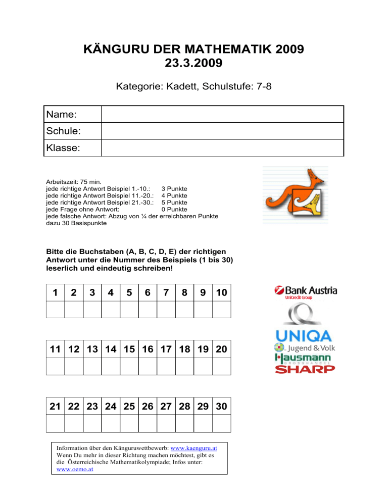KÄNGURU DER MATHEMATIK 2009 23.3.2009 Kategorie: Kadett, Schulstufe: 7-8 Name: Schule: Klasse: Arbeitszeit: 75 min. jede richtige Antwort Beispiel 1.-10.: 3 Punkte jede richtige Antwort Beispiel 11.-20.: 4 Punkte jede richtige Antwort Beispiel 21.-30.: 5 Punkte jede Frage ohne Antwort: 0 Punkte jede falsche Antwort: Abzug von ¼ der erreichbaren Punkte dazu 30 Basispunkte Bitte die Buchstaben (A, B, C, D, E) der richtigen Antwort unter die Nummer des Beispiels (1 bis 30) leserlich und eindeutig schreiben! 1 2 3 4 5 6 7 8 9 10 11 12 13 14 15 16 17 18 19 20 21 22 23 24 25 26 27 28 29 30 Information über den Känguruwettbewerb: www.kaenguru.at Wenn Du mehr in dieser Richtung machen möchtest, gibt es die Österreichische Mathematikolympiade; Infos unter: www.oemo.at Känguru der Mathematik 2009 Gruppe Kadett (7. und 8. Schulstufe) Österreich - 23.3.2009 9) In einen Lift passen entweder 12 Erwachsene oder 20 Kinder. Wie viele Kinder können höchstens gleichzeitig mit 9 Erwachsenen im Lift fahren? A) 3 B) 4 C) 5 D) 6 E) 8 - 3 Punkte Beispiele - 1) Welche der folgenden Zahlen ist gerade? A) 2009 B) 2 + 0 + 0 + 9 C) 200 – 9 D) 200 × 9 E) 200 + 9 2) Bei einer Party waren 4 Burschen und 4 Mädchen. Burschen haben nur mit Mädchen getanzt und Mädchen nur mit Burschen. Am Schluss wurde jeder befragt, wie viele Tanzpartner er oder sie am Abend hatte. Die Burschen nannten die Zahlen 3, 1, 2, 2 und drei der Mädchen sagten jeweils 2. Welche Zahl hat das vierte Mädchen angegeben? A) 0 B) 1 C) 2 D) 3 E) 4 3) Der abgebildete Stern ist aus 12 kongruenten gleichseitigen Dreiecken zusammengesetzt. Der Umfang des Sterns beträgt 36 cm. Wie groß ist der Umfang des grauen Sechsecks? A) 6 cm B) 12 cm C) 18 cm D) 24 cm E) 30 cm 4) Harry trägt in der Long Street Zeitungen aus. Er muss an jedes Haus mit ungerader Hausnummer eine Zeitung liefern. Das erste Haus hat die Nummer 15 und das letzte die Nummer 53. Wie viele Häuser muss Harry beliefern? A) 19 B) 20 C) 27 D) 38 E) 53 5) Der Flächeninhalt des großen Quadrats beträgt 1. Wie groß ist der Flächeninhalt des kleinen schwarzen Quadrats? A) 1 100 B) 1 300 C) 1 600 D) 1 900 E) 1 1000 6) Das Produkt von vier verschiedenen natürlichen Zahlen ist 100. Wie groß ist die Summe dieser vier Zahlen? A) 10 B) 12 C) 15 D) 18 E) 20 7) In einem Raum befinden sich Katzen und Hunde. Die Anzahl der Katzenpfoten ist doppelt so groß wie die Anzahl der Hundeschnauzen. Die Anzahl der Katzen ist …… ??? ……. wie die Anzahl der Hunde. A) doppelt so groß B) halb so groß C) gleich groß D) ein Viertel so groß E) ein Sechstel so groß 8) In der Abbildung ist QSR eine gerade Linie. Es gilt ∠ QPS = 12° und PQ = PS = RS. Wie groß ist ∠ QPR? A) 36° B) 42° C) 54° D) 60° E) 84° 10) Welche der folgenden Verbindungen besteht aus mehr als einer Schnur? A) I, III, IV und V B) I, III und V C) III, IV und V D) alle E) eine andere Antwort - 4 Punkte Beispiele - 11) Für wie viele positive ganze Zahlen a haben a² und a³ gleich viele Ziffern? A) 0 B) 3 C) 4 D) 9 E) unendlich viele 12) Wie viele Punkte müssen in dieser Figur mindestens entfernt werden, sodass keine drei verbleibenden Punkte auf einer Geraden liegen? A) 1 B) 2 C) 3 D) 4 E) 7 13) Nick misst alle 6 Winkel in zwei Dreiecken, wovon eines spitzwinkelig und eines stumpfwinkelig ist. Er merkt sich vier dieser Winkel: 120°, 80°, 55° und 10°. Wie groß ist der kleinste Winkel des spitzwinkeligen Dreiecks? A) 45° B) 10° C) 5° D) 55° E) Man kann es nicht feststellen. 14) Welcher Anteil des größten Quadrats ist grau? A) 1 4 B) 1 5 C) 2 5 D) 3 8 E) 1 3 15) Auf der Insel der Edlen und der Lügner stehen 25 Personen in einer Schlange. Die Person an erster Stelle behauptet, dass alle hinter ihm Stehenden Lügner seien. Jeder der anderen behauptet, dass die Person vor ihm ein Lügner ist. Wie viel Lügner stehen tatsächlich in der Schlange? (Edle sagen immer die Wahrheit und Lügner lügen immer.) A) 0 B) 12 C) 13 D) 24 E) Es kann nicht festgestellt werden. 16) In nebenstehender Figur sehen wir ein Objekt mit 6 dreieckigen Seitenflächen. In jedem Eckpunkt steht eine Zahl, wovon 2 bereits eingezeichnet sind. Die Summe der Zahlen in den drei Eckpunkten jeder Seitenfläche ist immer gleich. Bestimme die Summe aller fünf Eckpunktszahlen. A) 9 B) 12 C) 17 D) 18 E) 24 17) In der Gleichung E ⋅ I ⋅G ⋅ H ⋅T = T ⋅ W ⋅ O stehen verschiedene Buchstaben für F ⋅ O ⋅U ⋅ R verschiedene Ziffern und gleiche Buchstaben für gleiche Ziffern. Wie viele verschiedene Werte kann der Ausdruck T ⋅ H ⋅ R ⋅ E ⋅ E annehmen? A) 1 B) 2 C) 3 D) 4 E) 5 18) Wir wollen die Felder im Raster mit den Farben P, Q, R und S so anmalen, dass angrenzende Felder immer verschiedene Farben haben. (Auch Felder mit einem gemeinsamen Eckpunkt gelten als angrenzend.) Einige Felder sind schon angemalt. Welche Farbe kann das graue Feld haben? A) nur Q B) nur R C) nur S D) entweder R oder S E) Es ist unmöglich. 19) In nebenstehender Figur sehen wir ein regelmäßiges Neuneck. Wie groß ist der markierte Winkel in X? A) 40° B) 45° C) 50° D) 55° E) 60° 20) Aus weißen quadratischen Fliesen werden Muster gelegt. Wir sehen die ersten drei aus dieser Folge. Wie viele Fliesen werden für das zehnte Muster benötigt? A) 76 B) 80 C) 84 D) 92 23) Die Brüche 13 und 15 werden wie abgebildet auf der Zahlengeraden eingezeichnet. Wo befindet sich der Bruch 14 ? A) a B) b C) c D) d E) e 24) Ein Würfel wird durch drei flächenparallele Schnitte wie abgebildet in acht Quader zerschnitten. Wie groß ist das Verhältnis der Gesamtoberfläche aller acht Quader zur Oberfläche des Ausgangswürfels? A) 1:1 B) 4:3 C) 3:2 D) 2:1 E) 4:1 25) Alle Teiler einer Zahl N (mit Ausnahme von 1 und N selbst) werden hintereinander angeschrieben. Es stellt sich heraus, dass die größte Zahl in der Reihe genau 45 Mal so groß wie die kleinste Zahl in der Reihe ist. Wie viele Zahlen N erfüllen diese Bedingung? A) 0 B) 1 C) 2 D) mehr als 2 E) Es kann nicht