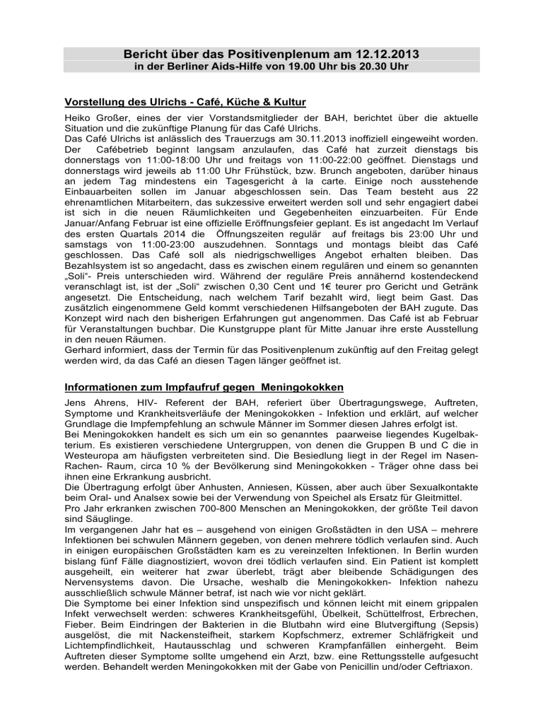 Bericht über das Positivenplenum am 12.12.2013 in der Berliner Aids-Hilfe von 19.00 Uhr bis 20.30 Uhr Vorstellung des Ulrichs - Café, Küche & Kultur Heiko Großer, eines der vier Vorstandsmitglieder der BAH, berichtet über die aktuelle Situation und die zukünftige Planung für das Café Ulrichs. Das Café Ulrichs ist anlässlich des Trauerzugs am 30.11.2013 inoffiziell eingeweiht worden. Der Cafébetrieb beginnt langsam anzulaufen, das Café hat zurzeit dienstags bis donnerstags von 11:00-18:00 Uhr und freitags von 11:00-22:00 geöffnet. Dienstags und donnerstags wird jeweils ab 11:00 Uhr Frühstück, bzw. Brunch angeboten, darüber hinaus an jedem Tag mindestens ein Tagesgericht à la carte. Einige noch ausstehende Einbauarbeiten sollen im Januar abgeschlossen sein. Das Team besteht aus 22 ehrenamtlichen Mitarbeitern, das sukzessive erweitert werden soll und sehr engagiert dabei ist sich in die neuen Räumlichkeiten und Gegebenheiten einzuarbeiten. Für Ende Januar/Anfang Februar ist eine offizielle Eröffnungsfeier geplant. Es ist angedacht Im Verlauf des ersten Quartals 2014 die Öffnungszeiten regulär auf freitags bis 23:00 Uhr und samstags von 11:00-23:00 auszudehnen. Sonntags und montags bleibt das Café geschlossen. Das Café soll als niedrigschwelliges Angebot erhalten bleiben. Das Bezahlsystem ist so angedacht, dass es zwischen einem regulären und einem so genannten „Soli“- Preis unterschieden wird. Während der reguläre Preis annähernd kostendeckend veranschlagt ist, ist der „Soli“ zwischen 0,30 Cent und 1€ teurer pro Gericht und Getränk angesetzt. Die Entscheidung, nach welchem Tarif bezahlt wird, liegt beim Gast. Das zusätzlich eingenommene Geld kommt verschiedenen Hilfsangeboten der BAH zugute. Das Konzept wird nach den bisherigen Erfahrungen gut angenommen. Das Café ist ab Februar für Veranstaltungen buchbar. Die Kunstgruppe plant für Mitte Januar ihre erste Ausstellung in den neuen Räumen. Gerhard informiert, dass der Termin für das Positivenplenum zukünftig auf den Freitag gelegt werden wird, da das Café an diesen Tagen länger geöffnet ist. Informationen zum Impfaufruf gegen Meningokokken Jens Ahrens, HIV- Referent der BAH, referiert über Übertragungswege, Auftreten, Symptome und Krankheitsverläufe der Meningokokken - Infektion und erklärt, auf welcher Grundlage die Impfempfehlung an schwule Männer im Sommer diesen Jahres erfolgt ist. Bei Meningokokken handelt es sich um ein so genanntes paarweise liegendes Kugelbakterium. Es existieren verschiedene Untergruppen, von denen die Gruppen B und C die in Westeuropa am häufigsten verbreiteten sind. Die Besiedlung liegt in der Regel im NasenRachen- Raum, circa 10 % der Bevölkerung sind Meningokokken - Träger ohne dass bei ihnen eine Erkrankung ausbricht. Die Übertragung erfolgt über Anhusten, Anniesen, Küssen, aber auch über Sexualkontakte beim Oral- und Analsex sowie bei der Verwendung von Speichel als Ersatz für Gleitmittel. Pro Jahr erkranken zwischen 700-800 Menschen an Meningokokken, der größte Teil davon sind Säuglinge. Im vergangenen Jahr hat es – ausgehend von einigen Großstädten in den USA – mehrere Infektionen bei schwulen Männern gegeben, von denen mehrere tödlich verlaufen sind. Auch in einigen europäischen Großstädten kam es zu vereinzelten Infektionen. In Berlin wurden bislang fünf Fälle diagnostiziert, wovon drei tödlich verlaufen sind. Ein Patient ist komplett ausgeheilt, ein weiterer hat zwar überlebt, trägt aber bleibende Schädigungen des Nervensystems davon. Die Ursache, weshalb die Meningokokken- Infektion nahezu ausschließlich schwule Männer betraf, ist nach wie vor nicht geklärt. Die Symptome bei einer Infektion sind unspezifisch und können leicht mit einem grippalen Infekt verwechselt werden: schweres Krankheitsgefühl, Übelkeit, Schüttelfrost, Erbrechen, Fieber. Beim Eindringen der Bakterien in die Blutbahn wird eine Blutvergiftung (Sepsis) ausgelöst, die mit Nackensteifheit, starkem Kopfschmerz, extremer Schläfrigkeit und Lichtempfindlichkeit, Hautausschlag und schweren Krampfanfällen einhergeht. Beim Auftreten dieser Symptome sollte umgehend ein Arzt, bzw. eine Rettungsstelle aufgesucht werden. Behandelt werden Meningokokken mit der Gabe von Penicillin und/oder Ceftriaxon. Aufgrund der in Berlin und einigen anderen deutschen Großstädten aufgetretenen Fälle sprach der nationale Impfbeirat im Sommer diesen Jahres eine Impfempfehlung für schwule und bisexuelle Männer gegen Meningokokken aus, dem sich die Aidshilfe- Projekte anschlossen. Die Impfempfehlung besteht weiter bis zum 31.01.2014. Nach Rücksprache mit Berliner Schwerpunktpraxen, in denen die Impfung durchgeführt wurde, ergab sich, dass im dritten Quartal 2013 3711 HIV-positive und 741 HIV-negative, bzw. nicht getestete schwule Männer der Impfempfehlung gefolgt sind. Die Impfung wird in der Regel gut vertragen, abgesehen von gelegentlich auftretenden Nebenwirkungen wie Kopfweh, leichtem Temperaturanstieg, Hautrötung etc. Nach erfolgreich verlaufener Impfung ist der Betreffende nicht mehr infektiös. Bislang sind keine weiteren Meningokokken- Infektionen bei schwulen Männern aufgetreten. Vorstellung der Website positiv-in-berlin.de Gerhard Grühn stellt die von ihm konzipierte Website positiv-in-berlin.de vor, auf der sämtliche in Berlin zur Verfügung stehenden Angebote zum Thema HIV/Aids auf einer Seite gebündelt erscheinen. Momentan gibt es zwischen 130-150 Angebote, die von circa 20 unterschiedlichen Organisationen bereit gestellt werden. Auf positiv-in-berlin wurden diese Angebote zusammengetragen und sowohl in Oberkategorien (etwa 30) als auch in Organisationen unterteilt, aufgelistet. Die Bedienung ist einfach und übersichtlich. Gerhard hat die Betreuung der Website im Rahmen seines Ehrenamts übernommen. Das verwendete Drupal - CMS kann es den einzelnen Institutionen in Zukunft wenn erforderlich auch ermöglichen, Änderungen und Ergänzungen eigenständig v