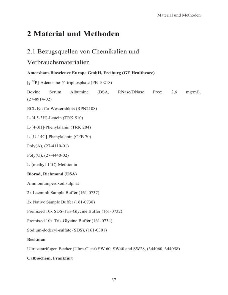 Material und Methoden 2 Material und Methoden 2.1 Bezugsquellen von Chemikalien und Verbrauchsmaterialien Amersham-Bioscience Europe GmbH, Freiburg (GE Healthcare) [J 32P]-Adenosine-5’-triphosphate (PB 10218) Bovine Serum Albumine (BSA, RNase/DNase Free; 2,6 (27-8914-02) ECL Kit für Westernblots (RPN2108) L-[4,5-3H]-Leucin (TRK 510) L-[4-3H]-Phenylalanin (TRK 204) L-[U-14C]-Phenylalanin (CFB 70) Poly(A), (27-4110-01) Poly(U), (27-4440-02) L-(methyl-14C)-Methionin Biorad, Richmond (USA) Ammoniumperoxodisulphat 2x Laemmli Sample Buffer (161-0737) 2x Native Sample Buffer (161-0738) Premixed 10x SDS-Tris-Glycine Buffer (161-0732) Premixed 10x Tris-Glycine Buffer (161-0734) Sodium-dodecyl-sulfate (SDS), (161-0301) Beckman Ultrazentrifugen Becher (Ultra-Clear) SW 60, SW40 and SW28, (344060, 344058) Calbiochem, Frankfurt 37 mg/ml), Material und Methoden HEPES (N-(2-Hydroxyethyl)-piperazin-N`-(2-ethansulfonsäure), Free Acid, ULTROL® Grade (391338) Difco, Detroit (USA) Bacto agar£ Bacto tryptone£ Yeast extract Fermentas GmbH, St. Leon-Rot Desoxy-Adenosin-5’triphosphat Desoxy-Cytidin-5’-triphosphat Desoxy-Guanosin-5’-triphosphat Desoxy-Thymidin-5’-triphosphat Didesoxy-Adenosin-5’triphosphat Didesoxy-Cytidin-5’-triphosphat Didesoxy-Guanosin-5’-triphosphat Didesoxy-Thymidin-5’-triphosphat AMV Reverse Transkriptase MMLV Reverse Transkriptase Polynukleotid-Kinase (aus E. coli) Polynucleotid-Kinase (aus T4 Phage) 2x Loading Dye Solution for RNA electrophoresis (#R 0641) 6x Loading Dye Solution (#R 0611) GeneRuler™ 100bp DNA Ladder RNA ladder (#SM 0241) GeneRuler™ 1kb DNA Ladder (#SM 0311) RNA Ladder, Low Range (#SM 0411) T4 DNA Ligase, (#EL 0015) Fluka, Neu-Ulm Spermidin 38 Material und Methoden Spermin Harnstoff (Fluka 02493, 2,5 kg, Sequenziergrad) Gibco-BRL, Eggenstein Agarose (Ultra pure) Urea (Ultrapure) Saccharose (Ultrapure) TEMED (NNN`N`-Tetramethylethylendiamin Invitrogen GmbH, Karlsruhe Topo TA cloning£ kit Quick change£ site directed mutageneses kit Merck, Darmstadt Alle Chemikalien, die im Labor benutzt wurden und nicht gesondert aufgeführt sind stammen von Merck, z.B. Bromphenolblau, Ethidiumbromid (1%), Tris ((Tris-hydroxymethyl)aminomethan), Xylencyanol… Millipore Filters 0,45 μm (HAW02500) Packard, Frankfurt Filter Count (Szintillations-Flüssigkeit) Promega DualGloTM Luciferase Assay System SteadyGlo TM Luciferase Assay System Qiagen, Hilden Qiagen Maxi Prep£ Tip 500 Qiagen Midi Prep£ Tip 100 Qiagen Mini Prep£ QIAquick£ PCR Purification kit QIAquick£ Nucleotide Removal kit 39 Material und Methoden QIAquick£Gel Extraction Kit Ni-NTA Agarose (100 ml), (30 230) Roche Pharmaceuticals 1,4-Dithiothreitol (DTT) (1 583 786) DNase I, RNase-free (10 776 785 001) dNTPs für PCR: dATP, dCTP, dGTP, dUTP (1 051 440, 1 051 458, 1 051 466, 1 420 470) Phosphatase, alkaline (AP) from calf intestine (713 023) Polynucleotide kinase (174 645) Pyruvate kinase (PK), (109 045) Rapid Translation System 100, RTS 100 E. coli HY Kit (3 186 156) tRNAbulk from E. coli MRE 600 (RNase negative), (109 550) Roth, Karlsruhe 1,4-Dithioerythritol (DTE), (8814.1) Ampicillin (K029.2) Isopropylthiogalaktosid IPTG 25g (2316.4) Phenol (0040.2) Roti-Mark STANDARD 1 ml (T851.1) Rotiphorese® Gel 30 (37,5:1), (3029.1) Rotiphorese® Gel 40 (19:1), (3030.1) Trichloroacetic acid (TCA), (8789.1) Sartorius, Göttingen Nitrozellulose Filter (Nr. 11306) Schleicher and Schüll Glass Fibre Filters 23 mm (10 370 021) Faltenfilter 595 ½ (10311647) )=185 mm Serva 40 Material und Methoden Aluminiumoxid Alcoa A-305 (12293) Coomassie® Brilliant Blue G-250 (17524) Coomassie® Brilliant Blue R-250 (17525) Sigma, Deisenhofen Albumin, bovine (A-7906) Ficol 400 (F-4375) Formaldehyde (F-8775) Lithium potassium acetyl phosphate (A 0262) Lysozyme (L-6876) ReadyMix™ Taq PCR Reaction Mix with MgCl2 (P-4600) 2.2 Bakterienstämme und Plasmide 2.2.1 Bakterienstämme MRE 600 Der E. coli Stamm MRE600 ist ein prototropher „wildtype“ Stamm, der aus südafrikanischen Bodenproben isoliert wurde. Dieser Stamm zeichnet sich durch eine extrem reduzierte RNaseI Aktivität (0,2% von wt K12) aus (Vanatalu et al., 1993). CAN20-12E Dieser Stamm ist ein Rnase defizientes K12 Derivat (RNase BN, II, D , I) (Zaniewski et al., 1984). Er wird standardmäßig zur Isolierung von Ribosomen eingesetzt. Dieser Stamm trägt eine Tetrazyklin Resistenz. DH5D DH5D ist ein Rekombinations-defizienter E. coli-Stamm, der durch die Mutation im lacZ-Gen die D-Komplementation mit Plasmid-kodiertem D-Fragment (LacZ`; N-terminales EGalaktosidasefragment) erlaubt. Bei Transformation mit Plasmiden, die eine blau/weißSelektion ermöglichen, lassen sich Klone mit re-ligierten Vektoren von Klonen unterscheiden, die Vektoren mit Insertionen enthalten. HB101 41 Material und Methoden Ein E. coli-Hybridstamm aus den Stämmen K12 und B. Dieser Rekombinations-defiziente Laborstamm eignet sich für die Plasmidpropagierung und für die Gewinnung großer Mengen Plasmid-DNA. Durch eine Mutation im ribosomalen Protein S12(rpsL20) weist dieser Stamm eine Streptomycin-Resistenz auf. XL1-Blue XL1-Blue ist ein Rekombinations-defizienter E. coli-Stamm, der durch die Mutation im lacZGen die D-Komplementation mit Plasmid-kodiertem D-Fragment (lacZ`; N-terminales EGalaktosidasefragment) erlaubt. Bei Transformation mit Plasmiden, die eine blau/weißSelektion ermöglichen, lassen sich Klone mit re-ligierten Vektoren von Klonen unterscheiden, die Vektoren mit Insertionen enthalten. BL21(DE3) Expressionsstamm für T7 Promotor basierende Expressionssysteme. Dieser Stamm zeichnet sich durch reduzierte Proteaseaktivität aus (F- ompT hsdSB (rB-mB-) gal bcm (DE3). CL5 CL5 ist ein temperatursensitiver E. coli-Stamm, der durch die Insertion einer Tetrazyklinresistenz-Kassette in das Gen für RF3 (prfC) die Fähigkeit verloren hat, bei niedrigeren Temperaturen (20-30 °C) zu wachsen (Pavlov et al., 1997a). FTP4993 Der Stamm FTP4993 ist der Kontrollstamm zu CL5. Die Stämme CL5 und 