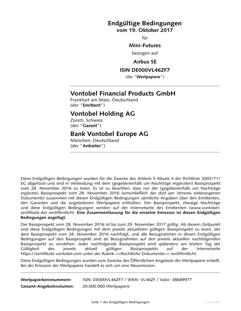 Endgültige Bedingungen vom 19. Oktober 2017 für Mini-Futures bezogen auf Airbus SE ISIN DE000VL46ZF7 (die "Wertpapiere") Vontobel Financial Products GmbH Frankfurt am Main, Deutschland (der "Emittent") Vontobel Holding AG Zürich, Schweiz (der "Garant") Bank Vontobel Europe AG München, Deutschland (der "Anbieter") Diese Endgültigen Bedingungen wurden für die Zwecke des Artikels 5 Absatz 4 der Richtlinie 2003/71/ EG abgefasst und sind in Verbindung mit dem (gegebenenfalls um Nachträge ergänzten) Basisprospekt vom 28. November 2016 zu lesen. Es ist zu beachten, dass nur der (gegebenenfalls um Nachträge ergänzte) Basisprospekt vom 28. November 2016 (einschließlich der dort per Verweis einbezogenen Dokumente) zusammen mit diesen Endgültigen Bedingungen sämtliche Angaben über den Emittenten, den Garanten und die angebotenen Wertpapiere enthalten. Der Basisprospekt, etwaige Nachträge und diese Endgültigen Bedingungen werden auf der Internetseite des Emittenten (www.vontobelzertifikate.de) veröffentlicht. Eine Zusammenfassung für die einzelne Emission ist diesen Endgültigen Bedingungen angefügt. Der Basisprospekt vom 28. November 2016 ist bis zum 29. November 2017 gültig. Ab diesem Zeitpunkt sind diese Endgültigen Bedingungen mit dem jeweils aktuellsten gültigen Basisprospekt zu lesen, der dem Basisprospekt vom 28. November 2016 nachfolgt, und alle Bezugnahmen in diesen Endgültigen Bedingungen auf den Basisprospekt sind als Bezugnahmen auf den jeweils aktuellen nachfolgenden Basisprospekt zu verstehen. Jeder nachfolgende Basisprospekt wird spätestens am letzten Tag der Gültigkeit des jeweils aktuell gültigen Basisprospekts auf der Internetseite https://zertifikate.vontobel.com unter der Rubrik <<Rechtliche Dokumente>> veröffentlicht. Diese Endgültigen Bedingungen wurden zum Zwecke des Öffentlichen Angebots der Wertpapiere erstellt. Bei der Emission der Wertpapiere handelt es sich um eine Neuemission. Wertpapierkennnummern: ISIN: DE000VL46ZF7 / WKN: VL46ZF / Valor: 38689977 Gesamt-Angebotsvolumen: 20.000.000 Wertpapiere Seite 1 der Endgültigen Bedingungen ID-252714976 I. EMISSIONSBEDINGUNGEN Auf die Wertpapiere sind die Allgemeinen Emissionsbedingungen aus dem Basisprospekt vom 28. November 2016 (Abschnitt VII.1) sowie die entsprechenden Produktbedingungen für (X-)Mini-Futures anwendbar. Ausgabetag 19. Oktober 2017 Stückzahl (bis zu) 20.000.000 Wertpapiere Optionstyp Long Basiswert Airbus SE Typ: ISIN Basiswert: Bloomberg Symbol: Referenzstelle: Terminbörse: Währung: Anfangsreferenzkurs Inhaberaktie NL0000235190 AIR FP Equity Euronext Paris Eurex EUR EUR 80,99 Basispreis am Ausgabetag EUR 76,12 Anpassungstag ist jeder Tag von Montag bis Freitag beginnend mit dem Ausgabetag. Aktueller Basispreis Der Aktuelle Basispreis entspricht am Ausgabetag dem Basispreis am Ausgabetag. Der Aktuelle Basispreis wird von der Berechnungsstelle am Ende eines jeden Anpassungstages angepasst. Anpassung des Aktuellen Basispreises Die Anpassung des Aktuellen Basispreises erfolgt gemäß folgender Formel: FLn = FLa + (r + FS) ⋅ FLa ⋅ n 360 − DivF ⋅ Div wobei: FLn: Basispreis nach der Anpassung = Aktueller Basispreis. FLa: Basispreis vor der Anpassung. r: Referenzzinssatz: der von der Berechnungsstelle bestimmte aktuelle Money Market Zinssatz für Overnight Deposits in der Währung des Basiswerts. FS: Maßgeblicher Finanzierungsspread (wie nachfolgend definiert) für den aktuellen Anpassungstag. n: Anzahl der Kalendertage zwischen dem aktuellen Anpassungstag (exklusive) und dem nächsten Anpassungstag (inklusive). Seite 2 der Endgültigen Bedingungen ID-252714976 DivF: Dividendenfaktor für eine etwaige Dividendenzahlung. Der "Dividendenfaktor" entspricht einem Wert zwischen null (0) und eins (1), der auf Grundlage der an diesem Tag auf den entsprechenden Basiswert ausgeschütteten Dividenden oder Dividenden gleichstehenden Barausschüttungen von der Berechnungsstelle oder mit ihr verbundenen Unternehmen zu zahlenden Steuern oder Abgaben von der Berechnungsstelle nach billigem Ermessen (§§ 315, 317 BGB) berechnet wird. Div: bezeichnet den Dividendeneinfluss. Der "Dividendeneinfluss" entspricht einem Betrag, der von der Berechnungsstelle nach billigem Ermessen (§§ 315, 317 BGB) auf Grundlage der an einem Dividendentag auf den Basiswert ausgeschütteten Dividenden oder Dividenden gleichstehenden Barausschüttungen berechnet wird. "Dividendentag" ist ein Tag, an dem der Basiswert, auf den Dividenden oder Dividenden gleichstehende Barbeträge ausgeschüttet werden sollen, an ihrer Heimatbörse "ex Dividende" gehandelt werden. Das Ergebnis der Berechnung wird einer Aufrundung zum nächsten Vielfachen der Rundung des Basispreises unterzogen. Die Rundung des Basispreises ist 0,01. Finanzierungsspread Der Finanzierungsspread am Ausgabetag beträgt 3,50%. Die Berechnungsstelle ist berechtigt, den Finanzierungsspread an jedem Anpassungstag nach ihrem billigem Ermessen (§§ 315, 317 BGB) im Bereich zwischen null (0) und dem Limit des Finanzierungsspreads unter Berücksichtigung der jeweiligen Marktbedingungen (einschließlich Marktzinsniveau, Zinserwartungen des Marktes und Marginerwartungen) neu festzulegen. Der Finanzierungsspread wird für jeden Anpassungstag gemäß § 12 der Allgemeinen Emissionsbedingungen veröffentlicht. Limit des Finanzierungsspreads Das Limit des Finanzierungsspreads am Ausgabetag beträgt 5,00%. Bezugsverhältnis 0,1 Auszahlungsbetrag Der Auszahlungsbetrag (§ 3 der Allgemeinen Emissionsbedingungen) entspricht der in der Währung des Basiswerts ausgedrückten Differenz, um die der maßgebliche Bewertungskurs den Aktuellen Basispreis überschreitet, multipliziert mit dem Bezugsverhältnis, d. h. Die Berechnungsstelle ist berechtigt, das Limit des Finanzierungsspreads nach ihrem billigem Ermessen (§§ 315, 317 BGB) innerhalb einer Bandbreite von +10 Prozentpunkten neu festzulegen. Von diesem Recht wird die Berechnungsstelle in der Regel nur im Fall von beson