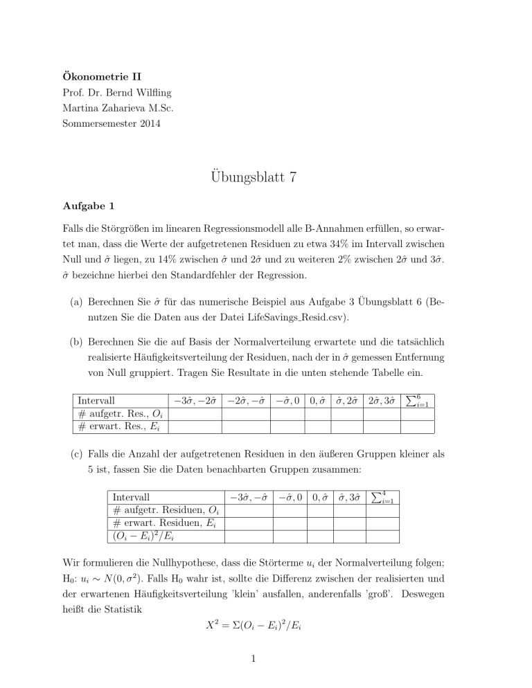 Ökonometrie II Prof. Dr. Bernd Wilfling Martina Zaharieva M.Sc. Sommersemester 2014 Übungsblatt 7 Aufgabe 1 Falls die Störgrößen im linearen Regressionsmodell alle B-Annahmen erfüllen, so erwartet man, dass die Werte der aufgetretenen Residuen zu etwa 34% im Intervall zwischen Null und σ̂ liegen, zu 14% zwischen σ̂ und 2σ̂ und zu weiteren 2% zwischen 2σ̂ und 3σ̂. σ̂ bezeichne hierbei den Standardfehler der Regression. (a) Berechnen Sie σ̂ für das numerische Beispiel aus Aufgabe 3 Übungsblatt 6 (Benutzen Sie die Daten aus der Datei LifeSavings Resid.csv). (b) Berechnen Sie die auf Basis der Normalverteilung erwartete und die tatsächlich realisierte Häufigkeitsverteilung der Residuen, nach der in σ̂ gemessen Entfernung von Null gruppiert. Tragen Sie Resultate in die unten stehende Tabelle ein. Intervall # aufgetr. Res., Oi # erwart. Res., Ei −3σ̂, −2σ̂ −2σ̂, −σ̂ −σ̂, 0 0, σ̂ σ̂, 2σ̂ 2σ̂, 3σ̂ P6 i=1 (c) Falls die Anzahl der aufgetretenen Residuen in den äußeren Gruppen kleiner als 5 ist, fassen Sie die Daten benachbarten Gruppen zusammen: Intervall # aufgetr. Residuen, Oi # erwart. Residuen, Ei (Oi − Ei )2 /Ei −3σ̂, −σ̂ −σ̂, 0 0, σ̂ σ̂, 3σ̂ P4 i=1 Wir formulieren die Nullhypothese, dass die Störterme ui der Normalverteilung folgen; H0 : ui ∼ N (0, σ 2 ). Falls H0 wahr ist, sollte die Differenz zwischen der realisierten und der erwartenen Häufigkeitsverteilung ’klein’ ausfallen, anderenfalls ’groß’. Deswegen heißt die Statistik X 2 = Σ(Oi − Ei )2 /Ei 1 Goodness-of-Fit-Measure, weil sie erklärt, wie gut eine hypothetische Verteilung (im unserem Fall die Normalverteilung) an die Daten angepasst werden kann. Unter H0 ist die X 2 -Statistik χ2 -verteilt mit T − K − 2 Freiheitsgraden. (d) Testen Sie zum Signifikanzniveau α = 5%, ob die Daten mit der Normalverteilungsannahme vereinbar sind. Aufgabe 2 Die monatlichen Verkaufpreise xt (in Euro) und Absatzmengen yt (in 1000 Stück) eines Filterherstellers wurden für den Zeitraum von Januar 2003 bis Dezember 2004 aufgezeichnet. (Betrachten Sie die Daten aus der Datei filter.csv) Um die Preisabsatzfunktion des Filterherstellers zu schätzen, wird folgendes Modell aufgestellt: yt = α + βxt + ut (a) Führen Sie eine KQ-Schätzung durch und geben Sie das 90%-Konfidenzintervall der geschätzten Koeffizienten an. (b) Stellen Sie die Residuenpaare (ût−1 , ût ) als eine Punktwolke grafisch dar. Lässt grafische Analyse positive, negative oder keine Autokorrelation in den Störgrößen vermuten? (c) Ermitteln Sie ρ̂ aus den Residuenpaaren (ût−1 , ût ). (d) Überprüfen Sie Ihre Vermutung aus (b) für die Autokorrelation der Störgrößen mit dem Durbin-Watson Test zum Signifikanzniveau α = 0.05. (e) Vergleichen Sie die in (d) verwendete Teststatistik für den Durbin-Watson Test mit der approximativen Formel d ≈ 2(1 − ρ̂). Wodurch ergibt sich der Unterschied? (f) Transformieren Sie das Modell so, dass die Autokorrelation in den Residuen bereinigt wird und geben Sie das transformierte Modell in Matrixnotation an. (g) Schätzen Sie das Modell nach dem Verfahren von Hildreth/Lu. (h) Schätzen Sie das Modell nach dem Verfahren von Cochrane/Orcrutt (mit zwei Iterationen). Geben Sie das 90%-Intervall der geschätzten Koeffizienten an. (i) Schätzen Sie die Varianz-Kovarianzmatrix nach Newey/West. 2