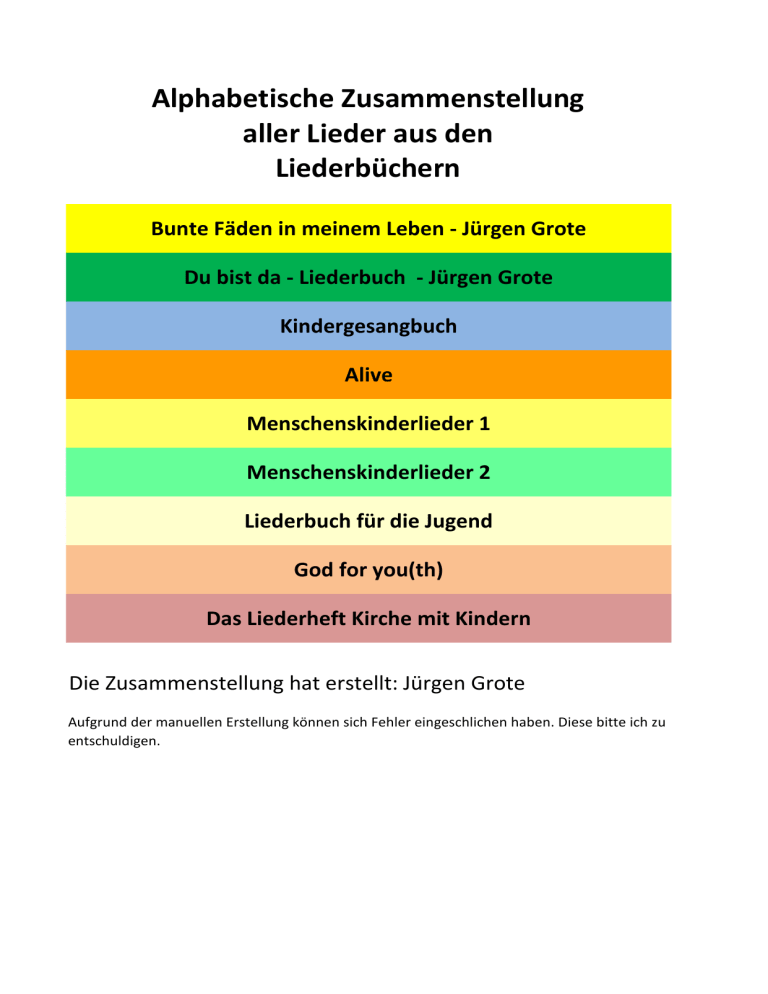 Alphabetische Zusammenstellung aller Lieder aus den Liederbüchern Bunte Fäden in meinem Leben - Jürgen Grote Du bist da - Liederbuch - Jürgen Grote Kindergesangbuch Alive Menschenskinderlieder 1 Menschenskinderlieder 2 Liederbuch für die Jugend God for you(th) Das Liederheft Kirche mit Kindern Die Zusammenstellung hat erstellt: Jürgen Grote Aufgrund der manuellen Erstellung können sich Fehler eingeschlichen haben. Diese bitte ich zu entschuldigen. BF Dbd KG Alive MKL 1 MKL 2 LfdJ GfY Abendschatten 160 Abraham, Abraham, verlass dein Land 11 Ach, du meine Güte 1 Ach, heute ist auch gar nichts los Ach, ich kann nicht mehr 32 472 Ach, ist das schön / Hinne ma tov (K) 237 108 Adoramus te Domine All das wünsch ich dir 685 715 664 All die Fülle ist in Dir, o Herr 114 116 All eure Sorgen heute und morgen All eure Sorgen II 2 38 9 All Morgen ist ganz frisch (EG 440) 249 177 All my life 3 Alle Gaben, die wir haben 320 321 Alle guten Gaben (1) Alle guten Gaben (2) 269 140 126 78 Alle guten Gaben (EG 463) Alle Kinder dieser Erde Alle Knospen springen auf 63 112 472 Alle meine Quellen entspringen Alle Menschen höret 187 Allein Gott in der Höh (EG 179) 421 661 122 123 358 448 Allein können wir nicht leben Alles auf Erden hat seine Zeit (W 605) 91 Alles Gute, Gottes Segen 173 Alles ist möglich 1 155 135 46 Alles kommt von dir Alles muß klein beginnen 474 619 Alles, was atmet 80 Alles, was mich bedrückt 476 Alles, was Odem hat (B 621; Rh 693) 436 Als Du einst vorbeigingst 38 Als ich bei meinen Schafen wacht 23 4 543 Als ich hungrig war 436 320 168 Als Israel in Ägypten war (Ö 607;W 604) Als Jesus auf die Erde kam (ThB 549) Als Jesus durch die Lande zog 27 258 Als Jesus gestorben war 111 Als Jesus in der Wüste war 50 Als Jesus kam nach Jericho 113 136 1111 Als Jesus, gestorben war Am Anfang, bevor die Welt Am hellen Tag kam Jesu Geist (B 569;ThB 566) 106 Amazing grace 342 5 201 Amen 175 174 173 Amen! Amen! Amen!(m) Amen, amen (m) Amen, ja Lob und Ehre sei Dir (Kanon) 6 Amos aus Tekoa 126 Anderes Osterlied 244 Anders als du Angst Another Day in Paradise KmK 280 1 89 140 BF Dbd KG Anvertraut Alive MKL 1 MKL 2 LfdJ 83 GfY 586 461 456 Atem des Lebens Atem Gottes (m) Atme in uns, Heiliger Geist 72 Atmen wir den frischen Wind 462 Auf dem Weg nach Jericho 567 Auf der Suche 242 Auf der Suche nach Zeichen 264 Auf und macht die Herzen weit (EG 454) 266 Auf Wegen des Glaubens 86 Auf, auf, mein Herz, mit Freuden (EG 112) 226 Aufschwingen, getragen 7 Aufstehn vom Tod 64 Augen für das Kleine haben Aus deiner Güte schöpfen wir 16 547 Aus Deiner Liebe, Herr 44 94 Aus den Dörfern und Städten Aus der Tiefe rufe ich zu dir (NB 597;ThB 629) 8 Aus Gottes guten Händen (W 646) 359 478 84 386 Aus großer Tiefe (zu Psalm 130) 252 Aus meines Herzens Grunde (EG 443) 728 Aus Staub sind wir genommen (m) 80 Aus tiefer Not schrei ich zu dir 9 Aus Traum und Tränen 2 184 Ausgang und Eingang (K) (EG 175) 119 489 487 483 Ave Maria - Gegen alle Macht Ave Maria (Du auf Gott hin öffne) (m) Ave Maria, du bist voll der Gnade 10 32 Bani ngyeti Bartimäus-Lied 207 Befiehl du deine Wege (EG 361) 77 34 136 Beginne Du all meine Tage (m) Behüte mich, Gott (m) Behutsam will ich dir begegnen 290 359 718 695 11 Bei Dir 178 Bei dir ist die Quelle Bei dir ist die Quelle des Lebens KmK L 51 108 Bei dir, Gott, berge ich mich 687 293 294 401 Bei Gott bin ich geborgen (m) Benediktus I (Gepriesen sei der Herrl Benediktus ll (Herr,Du hast Dein Volk erlöst) (m) Bereitet, bereitet den Weg 284 117 Bevor die Sonne sinkt (EG 491) 213 Bewahre uns, Gott (EG 171) 260 272 138 Bingo 480 Bist du ein Haus aus dicken Steinen 220 236 Bist zu uns wie ein Vater 81 Blätter, wenn sie gelb geworden 723 278 265 Bleib bei uns, hilf uns tragen Bleib mit Deiner Gnade bei uns (m) Bleibe, Herr, jetzt bei uns 2 BF Dbd Bleibet hier und Wachet mit mir (H 789; N 789; NB 789; Ö 789; Rh 585; ThB 700) KG Alive MKL 1 MKL 2 LfdJ GfY 58 467 431 673 109 549 261 227 Bless the Lord, my soul (m) Bonum est confidere in Domino (m) Brandstifter 65 Brich mit den Hungrigen dein Brot (EG 420) 232 120 Brot und Wein der Welt 10 Brot, Brot, danke für das Brot 228 154 177 Brot, das die Hoffnung nährt Build your house in glory 139 Bumm bi di bum 70 103 Burden Down Lord By the rivers of Babylon 110 101 188 Caminando va (m) Candle in the Wind Cantai ao Senhor / Singt Gott, unserm Herrn 12 566 13 540 Carpe Diem 127 Christ ist erstanden 115 Christ ist erstanden 76 134 Christ ist erstanden (EG 99) Christe, du Lamm Gottes (EG 190.2) Christe, Du Lamm Gottes (Kanon) 211 Christe, Du Lamm Gottes (Schmitz) Christus ist auferstanden (B 564; NB 550; Rh 571;ThB 555;W 549) 221 332 481 Christus ist unser Friede (K) 576 219 111 689 672 254 Christus, Dein licht (m) Christus, Gottes Lamm Christus, hör uns an Come and worship Come, now is the time to worship Confitemini Domino (m) 141 Da berühren sich Himmel und Erde 132 27 14 Da war die Nacht, da kam das Licht 112 Da wohnt ein Sehnen L 39 482 73 Dank für die Sonne 171 Dank für die Sonne, Dank für den Wind 483 Dank sei dir, Gott! 250 Dank sei Dir, ja Dank sei Dir (m) 213 Dank sei dir, Vater 39 175 Danke ür diesen guten Morgen (EG 334) Danke, Herr! Ich will dir danken (Rh 687) 192 Danket dem Herrn! (EG 333) Danket dem Herrn, rufet an seinen Namen L 36 L 54 Danket dem Herrn, wir danken dem Herrn Danket, danket dem Herrn 193 360 3 Danket dem Herrn Danket dem Herrn, denn er ist freundlich 211 197 Da pacem Domine Dafür danken wir dir Damit aus Fremden Freunde werden (B 612; H 639; NB 619; Ö 644; Rh 674;ThB 657;W 657) KmK 3 212 211 195 247 BF Dbd KG Danket, danket dem Herrn (K) (EG 336) Alive MKL 1 MKL 2 LfdJ 4 248 726 Dankt dem Herrn, sagt es laut Dann wird ein Fest sein 1 39 49 Das Festmahl Das Flummilied 4 Das ist das Fest 9 Das ist ungerecht 1 Das kleine, bunte Trampeltier 126 Das könnte den Herren der Welt 67 Das Leben wächst heimlich 316 Das Licht einer Kerze 241 32 221 Das Lied von den Gefühlen Das muss ein Engel Das Senfkorn 140 486