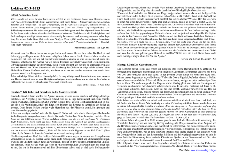 Ungläubigen bewegen, damit auch sie sein Werk in ihrer Umgebung fortsetzen. Viele empfangen den Heiligen Geist, und der Weg wird nicht mehr durch lustlose Gleichgültigkeit blockiert sein. Warum ist die Geschichte des Wirkens der Jünger aufgezeichnet worden, als sie mit heiligem Eifer und belebt durch den Heiligen Geist gearbeitet haben? Ist es nicht deshalb, damit heute das Volk des Herrn durch diesen Bericht inspiriert wird, ernsthaft für ihn zu arbeiten? Was der Herr für sein Volk in jener Zeit getan hat, ist wichtig, heute aber noch wichtiger, dass er es für sein Volk tut. Alles, was die Apostel taten, muss heute jedes Gemeindeglied tun. Und wir sollten mit so viel mehr Eifer arbeiten, damit der Heilige Geist uns beisteht und wir von ihm ein so viel größeres Maß seines Geistes erhalten, wie die Bosheit zugenommen hat und einen entschiedenen Ruf zur Umkehr verlangt. Jeder, auf den das Licht der gegenwärtigen Wahrheit scheint, wird aufgerüttelt von Mitgefühl für diejenigen, die in der Finsternis sind. Von allen Gläubigen soll das Licht in klaren, deutlichen Strahlen reflektiert werden. Ein Werk, ähnlich dem, das der Herr durch seine ausgesandten Boten nach Pfingsten wirkte, will Gott heute tun. In der heutigen Zeit, wenn das Ende aller Dinge vor der Tür steht, sollte dann nicht der Eifer der Gemeinde sogar den Einsatz der Urgemeinde übertreffen? Eifer für die Ehre Gottes bewegte die Jünger dazu, mit ganzer Macht die Wahrheit zu bezeugen. Sollte nicht dieser Eifer unsere Herzen mit einer Sehnsucht entzünden, die Geschichte der erlösenden Liebe Christi und von ihm als dem gekreuzigtem Heiland zu erzählen? Sollte sich die Kraft Gottes heute nicht noch mächtiger zeigen als in der Zeit der Apostel? Review and Herald, 13. Januar 1903 Lektion 02-3-2013 Sabbat Nachmittag, 6. Juli Wäre es nicht gut, wenn ihr den Herrn suchen würdet, so wie die Jünger ihn vor dem Pfingsttag suchten? Nach der Himmelfahrt Christi versammelten sich seine Jünger – Männer mit unterschiedlichen Talenten und Fähigkeiten – in dem Obergemach, um die Gabe des Heiligen Geistes zu erbitten. In diesem Raum blieben „alle fortgesetzt einmütig im Gebet und Flehen“ (Apostelgeschichte 1,14 Schlachter) zusammen. Sie haben von ganzem Herzen Buße getan und ihre eigenen Sünden bekannt. Es fiel ihnen nicht schwer, einander die Sünden zu bekennen. Nachdem sie alle Uneinigkeiten und Entfremdungen beseitigt hatten, waren sie einmütig beisammen und beteten gemeinsam zehn Tage lang, bis sie am Ende dieser Zeit „alle vom Heiligen Geist erfüllt wurden und anfingen, in anderen Sprachen zu reden, wie der Geist es ihnen auszusprechen gab.“ (Apostelgeschichte 2,4 – Satzstellung leicht verändert). Manuscript Releases, vol. 5, p. 368 Wenn wir uns den Herrn immer vor Augen halten und unsere Herzen ihm voller Dankbarkeit und Lob entgegenschlagen, dann bleibt unser religiöses Leben immer frisch. Unsere Gebete werden zu Gesprächen mit Gott, wie wir mit einem Freund sprechen würden; er wird uns persönlich seine Geheimnisse offenbaren. Oft werden wir ein süßes, freudiges Gefühl der Gegenwart Jesu empfinden. Oft werden unsere Herzen in uns brennen, wenn er sich uns naht, um mit uns zu kommunizieren, wie er es mit Henoch tat. Wenn dies wirklich die Erfahrung des Christen ist, zeigt sich in seinem Leben Einfachheit, Demut, Sanftmut, und alle, mit denen er zu tun hat, werden erkennen, dass er mit Jesus gewesen ist und von ihm gelernt hat. Jedes aufrichtige Gebet wird im Himmel gehört. Es mag nicht gewandt formuliert sein, aber wenn es von Herzen kommt, wird es zum Heiligtum aufsteigen, wo Jesus dient, und er wird es dem Vater in lieblichster Art als ein wohlriechender Weihrauch präsentieren. Signs of the Times, 18. Juni 1902 Montag, 8. Juli: Das Gebetsleben Jesu Die Rabbiner hielten es für das Wesen der Religion, stets regste Betriebsamkeit zu entfalten. Sie bewiesen ihre überlegene Frömmigkeit durch äußerliche Leistungen. Sie trennten dadurch ihre Seele von Gott und vertrauten allein sich selbst. In der gleichen Gefahr stehen wir Menschen heute noch. Nimmt unsere Regsamkeit zu, verläuft unser Wirken für Gott erfolgreich, befinden wir uns in Gefahr, uns auf unsere menschlichen Pläne und Methoden zu verlassen, weniger zu beten und weniger Glauben zu üben. Wir verlieren gleich den Jüngern unsere Abhängigkeit von Gott aus den Augen und versuchen durch unsere Betriebsamkeit erfolgreich zu sein. Es ist nötig, beständig auf Jesus zu blicken, um zu erkennen, dass es seine Kraft ist, die alles schafft. Während wir eifrig für das Heil der Verlorenen wirken sollen, müssen wir uns Zeit lassen, um nachzudenken, um zu beten und das Wort Gottes zu betrachten; denn nur die unter anhaltendem Gebet ausgeführte und durch das Verdienst Christi geheiligte Arbeit wird am Ende zum Guten wirken. Kein Leben war mehr erfüllt von Arbeit und Verantwortlichkeit als das Leben Jesu. Und doch, wie oft finden wir ihn im Gebet! Wie beständig war seine Verbindung mit Gott! Immer wieder lesen wir in seiner Lebensgeschichte Berichte wie diese: „Und des Morgens vor Tage stand er auf und ging hinaus. Und er ging an eine einsame Stätte und betete daselbst.“ (Markus 1,35.) „Es kam viel Volks zusammen, dass sie hörten und durch ihn gesund würden von ihren Krankheiten, er aber entwich in die Wüste und betete.“ (Lukas 5,15.16.) „Es begab sich aber zu der Zeit, dass er auf einen Berg ging, zu beten; und er blieb über Nacht im Gebet zu Gott.“ (Lukas 6,12.) In seinem Leben, das ganz dem Wohl anderer geweiht war, hielt der Heiland es für notwendig, den Trubel der Reisewege und die ihm Tag für Tag nachfolgende Menge zu meiden, seine Aufgabe und die Berührung mit der menschlichen Not manchmal zu unterbrechen, die Zurückgezogenheit zu suchen und eine ungestörte Gemeinschaft mit dem Vater zu pflegen. Eins mit uns, als Teilhaber unserer Nöte und Schwachheiten, war er ganz von Gott abhängig und suchte überall