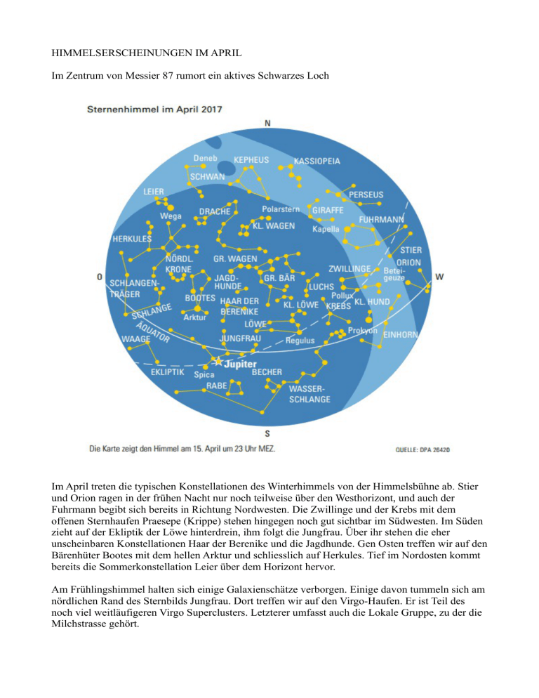 HIMMELSERSCHEINUNGEN IM APRIL Im Zentrum von Messier 87 rumort ein aktives Schwarzes Loch Im April treten die typischen Konstellationen des Winterhimmels von der Himmelsbühne ab. Stier und Orion ragen in der frühen Nacht nur noch teilweise über den Westhorizont, und auch der Fuhrmann begibt sich bereits in Richtung Nordwesten. Die Zwillinge und der Krebs mit dem offenen Sternhaufen Praesepe (Krippe) stehen hingegen noch gut sichtbar im Südwesten. Im Süden zieht auf der Ekliptik der Löwe hinterdrein, ihm folgt die Jungfrau. Über ihr stehen die eher unscheinbaren Konstellationen Haar der Berenike und die Jagdhunde. Gen Osten treffen wir auf den Bärenhüter Bootes mit dem hellen Arktur und schliesslich auf Herkules. Tief im Nordosten kommt bereits die Sommerkonstellation Leier über dem Horizont hervor. Am Frühlingshimmel halten sich einige Galaxienschätze verborgen. Einige davon tummeln sich am nördlichen Rand des Sternbilds Jungfrau. Dort treffen wir auf den Virgo-Haufen. Er ist Teil des noch viel weitläufigeren Virgo Superclusters. Letzterer umfasst auch die Lokale Gruppe, zu der die Milchstrasse gehört. Zentrales Objekt des Virgohaufens ist eine elliptische Riesengalaxie mit der Bezeichnung Messier 87. Sie lässt sich mit einem guten Feldstecher auffinden, wirkt aber darin recht unscheinbar. Als Nebelfleckchen entdeckt hat sie der französische Astronom Pierre M´echain Ende des 18. Jahrhunderts. Sein Freund und Kollege Charles Messier nahm es in seinen Katalog der Himmelsnebel auf. Damals ahnten die Astronomen noch nicht, dass es sich um eine Sterneninsel ausserhalb unserer eigenen Galaxis handelt. Selbst Edwin Hubble, der Mitte der 1920er Jahre die Klassifizierung von Galaxien in Spiralen und Ellipsen sowie deren Untergruppen einführte, hielt M87 zunächst noch für einen Kugelsternhaufen. Denn M87 zeigt keinerlei auffällige Spiralstruktur und ist auch in ihrer rundlichen Form kaum abgeplattet. Und mit den damals verfügbaren Teleskopen liessen sich tatsächlich bereits einzelne Sterne ausmachen. Eine Besonderheit an M87 fiel aber dem amerikanischen Astronomen Heber Curtis vom Lick Observatory bereits 1918 auf. Er beobachtete eine linienartige Struktur, die vom Zentrum des Objekts in den Aussenbereich ragte. Heute schätzen Astronomen die Gesamtmasse der 54 Millionen Lichtjahre entfernten Galaxie auf 2 bis 3 Billionen Sonnenmassen bei einer Ausdehnung von 100 000 Lichtjahren. Ausserdem soll die Galaxie 12 000 Kugelsternhaufen besitzen; die Milchstrasse zählt dagegen nur etwa 200. In ihrem Zentrum rumort vermutlich ein extrem massereiches Schwarzes Loch von 6,6 Milliarden Sonnenmassen. Im Vergleich dazu besitzt das Schwarze Loch im Zentrum der Milchstrasse nur 4,3 Millionen Sonnenmassen. Doch während sich das Schwerkraftmonsterin unserer Galaxis ruhig verhält, fungiert jenes in M87 als Motor und treibt einen Materiejet an, der mindestens 5000 Lichtjahre in den Raum reicht. Zudem erstrahlt das Innere von M87 intensiv im Radio- und Röntgenbereich des elektromagnetischen Spektrums. Ein solches Verhalten weisen viele sogenannte aktive Galaxienkerne im Kosmos auf. Die Strahlung rührt wahrscheinlich von der aufgeheizten Materie in der Umgebung des Schwarzen Lochs her. Als eine der stärksten Radioquellen am Himmel ist M87 besonders für Radioastronomen interessant. Noch rätseln die Astrophysiker aber vor allem über den genauen Mechanismus, der den Jets solcher aktiven Galaxien zugrunde liegt. Neue Erkenntnisse dazu erhoffen sie sich von dem Event Horizon Telescope, mit dem sie im April den Rand des Schwarzen Lochs im Zentrum der Milchstrasse, Sagittarius A*, und das Zentrum von M87 ablichten wollen. Um eine ausreichend gute Auflösung zu bekommen, schalten sie dazu acht über den Erdball verteilte Radioobservatorien zusammen. Aufgrund der grossen Masse erstreckt sich dabei das Schwarze Loch von M87 trotz der grossen Entfernung über den gleichen Winkelbereich wie Sagittarius A*. Mit ihren Beobachtungen wollen die Forscher unter anderem die Frage klären, ob die Jets in aktiven Galaxien aus der Akkretionsscheibe des Schwarzen Lochs heraus entstehen oder ob sie vielleicht noch viel näher am Ereignishorizont des Schwarzen Lochs entspringen. Ob dieses ehrgeizige Projekt tatsächlich gelingt, ist noch nicht sicher Ähnlich herausfordernd ist es für den Amateurastronomen, den Jet von M87 selbst aufzufinden. Mit der richtigen Ausrüstung und beste Sichtbedingungen vorausgesetzt kann dies aber gelingen. Lauf des Mondes: Am 3. April steht der zunehmende Halbmond in den Zwillingen. Der Vollmond befindet sich am 11. April in der Jungfrau. Am 19. des Monats hält sich der wieder abnehmende Halbmond zwischen Schütze und Steinbock auf. Zu Neumond zieht der Erdtrabant am 26. April in die Fische ein. Lauf der Planeten: Merkur ist im ersten Monatsdrittel am Abendhimmel über dem Westhorizont zu sehen. Venus hingegen taucht etwa ab der zweiten Aprilwoche im Osten als «Morgenstern» auf. Der rötliche Mars hält sich noch am Abendhimmel im Westen auf. Der Gasriese Jupiter erstrahlt die ganze Nacht. Saturn ist ein Objekt der zweiten Nachthälfte. Kometen: Komet 41P wandert vom Kleinen Bären durch den Drachen in Richtung Herkules. In diesem Sternbild hält sich den ganzen Monat über auch Komet C/2015 V2 auf. Beidessind dankbare Objekte für den Feldstecher. Meteorströme: Um den 22. April erreichen die Lyriden ihr Maximum.