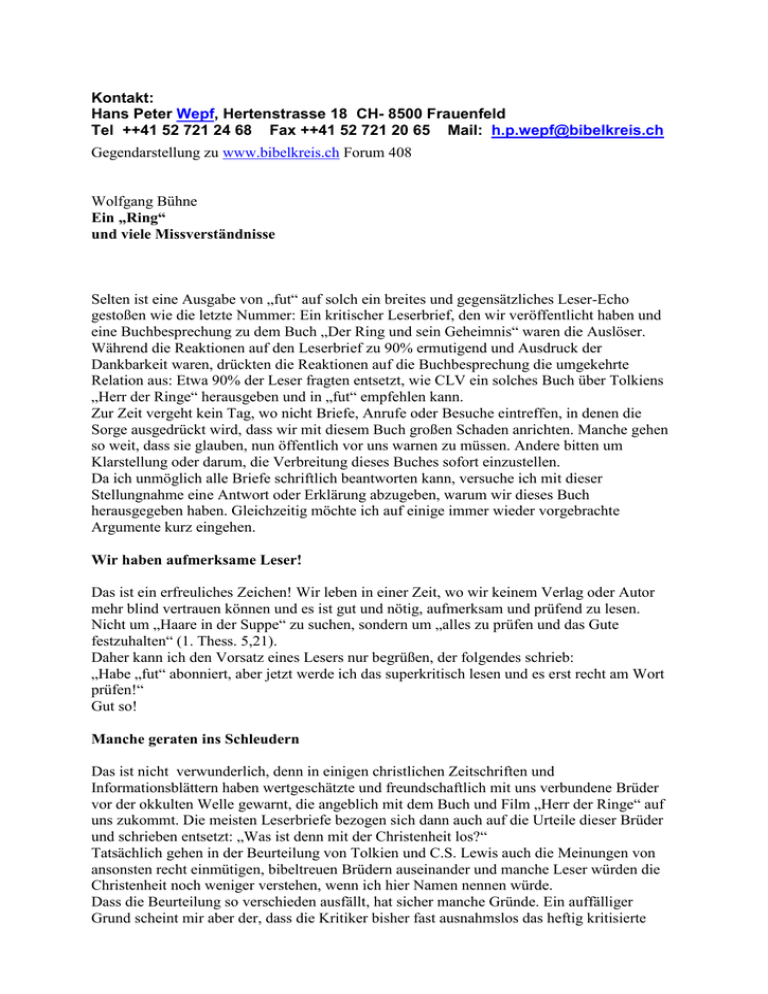 Kontakt: Hans Peter Wepf, Hertenstrasse 18 CH- 8500 Frauenfeld Tel ++41 52 721 24 68 Fax ++41 52 721 20 65 Mail: h.p.wepf@bibelkreis.ch Gegendarstellung zu www.bibelkreis.ch Forum 408 Wolfgang Bühne Ein „Ring“ und viele Missverständnisse Selten ist eine Ausgabe von „fut“ auf solch ein breites und gegensätzliches Leser-Echo gestoßen wie die letzte Nummer: Ein kritischer Leserbrief, den wir veröffentlicht haben und eine Buchbesprechung zu dem Buch „Der Ring und sein Geheimnis“ waren die Auslöser. Während die Reaktionen auf den Leserbrief zu 90% ermutigend und Ausdruck der Dankbarkeit waren, drückten die Reaktionen auf die Buchbesprechung die umgekehrte Relation aus: Etwa 90% der Leser fragten entsetzt, wie CLV ein solches Buch über Tolkiens „Herr der Ringe“ herausgeben und in „fut“ empfehlen kann. Zur Zeit vergeht kein Tag, wo nicht Briefe, Anrufe oder Besuche eintreffen, in denen die Sorge ausgedrückt wird, dass wir mit diesem Buch großen Schaden anrichten. Manche gehen so weit, dass sie glauben, nun öffentlich vor uns warnen zu müssen. Andere bitten um Klarstellung oder darum, die Verbreitung dieses Buches sofort einzustellen. Da ich unmöglich alle Briefe schriftlich beantworten kann, versuche ich mit dieser Stellungnahme eine Antwort oder Erklärung abzugeben, warum wir dieses Buch herausgegeben haben. Gleichzeitig möchte ich auf einige immer wieder vorgebrachte Argumente kurz eingehen. Wir haben aufmerksame Leser! Das ist ein erfreuliches Zeichen! Wir leben in einer Zeit, wo wir keinem Verlag oder Autor mehr blind vertrauen können und es ist gut und nötig, aufmerksam und prüfend zu lesen. Nicht um „Haare in der Suppe“ zu suchen, sondern um „alles zu prüfen und das Gute festzuhalten“ (1. Thess. 5,21). Daher kann ich den Vorsatz eines Lesers nur begrüßen, der folgendes schrieb: „Habe „fut“ abonniert, aber jetzt werde ich das superkritisch lesen und es erst recht am Wort prüfen!“ Gut so! Manche geraten ins Schleudern Das ist nicht verwunderlich, denn in einigen christlichen Zeitschriften und Informationsblättern haben wertgeschätzte und freundschaftlich mit uns verbundene Brüder vor der okkulten Welle gewarnt, die angeblich mit dem Buch und Film „Herr der Ringe“ auf uns zukommt. Die meisten Leserbriefe bezogen sich dann auch auf die Urteile dieser Brüder und schrieben entsetzt: „Was ist denn mit der Christenheit los?“ Tatsächlich gehen in der Beurteilung von Tolkien und C.S. Lewis auch die Meinungen von ansonsten recht einmütigen, bibeltreuen Brüdern auseinander und manche Leser würden die Christenheit noch weniger verstehen, wenn ich hier Namen nennen würde. Dass die Beurteilung so verschieden ausfällt, hat sicher manche Gründe. Ein auffälliger Grund scheint mir aber der, dass die Kritiker bisher fast ausnahmslos das heftig kritisierte Buch „Herr der Ringe“ selbst nicht gelesen haben, sondern Argumente aus 2. und 3. Hand vorbringen. Natürlich muss man nicht alles selbst gelesen haben, um sich eine Meinung zu bilden, aber dann sollte man auch vorsichtiger im Urteil sein. Die Personen, auf deren Urteil man sich verlässt sollten absolut vertrauenswürdig sein, gründlich, korrekt und sachlich arbeiten und argumentieren - und wenigstens sie sollten die Texte, die sie kritisieren, aus erster Hand kennen. War Tolkien Christ? Viele Leser haben sich an folgender Aussage gestoßen: „Nur wenige Leser wissen allerdings, das Tolkien überzeugter Christ war...“ Diese Aussage muß ich zurücknehmen. Ich kenne Tolkiens Leben und Bekenntnis zu wenig, um das beurteilen zu können. Ich habe das aus einer Bemerkung in der Autobiographie von C.S. Lewis geschlossen, aber das ist natürlich nicht ausreichend. Allerdings kann ich mich dem Urteil vieler Leser nicht anschließen, dass Tolkien als überzeugter Katholik wohl kein Christ sein könne: „Tolkien war überzeugter Katholik! Sind überzeugte Katholiken Christen?“ Ich glaube je länger je mehr, dass die Röm Kath. Kirche die größte existierende Sekte mit gefährlichen Irrlehren ist und ich zögere nicht, den Papst als einen Verführer der Christenheit zu bezeichnen, als einen „Antichrist“ („an Stelle von Christus“). Trotzdem ändert dieses Urteil nichts an der Tatsache, dass es Katholiken gibt, die eine bewusste Bekehrung zu dem Herrn Jesus vollzogen haben und ihn als ihren Herrn und Heiland kennen und lieben. Inwieweit sie „überzeugte“ Katholiken sind – das kann ich nicht beurteilen und ich neige auch zu der Annahme, dass man wohl als Katholik wiedergeboren sein kann, aber schwerlich als Wiedergeborener röm.- katholisch bleiben wird. Aber Tolkien das Christsein allein aus dem Grund abzusprechen, weil er Katholik war, ist ebenso vermessen, als wenn man Männern wie John Wesley, Matthias Claudius, N.L. von Zinzendorf usw. das Christsein absprechen würde, weil sie (leider!) Freimaurer waren. Tolkien selbst hat sich als Christ bekannt und hat seine Bücher aus einer christlichen Grundhaltung heraus geschrieben. Seine von der Bibel geprägte Ethik ist in seinen Werken deutlich zu erkennen. Nur wenige Schriftstelller haben das Böse als so schrecklich und verabscheuenswürdig und das Gute als so anziehend und erstrebenswert dargestellt wie Tolkien. Ist Tolkiens Buch „Herr der Ringe“ okkult-magisch? Nachdem ich die ersten Teile des Werkes gelesen habe, kann ich dieses Urteil nicht teilen. Ich verstehe gut, dass manche Leser mit dieser Literaturgattung grundsätzlich Probleme haben, aber ich kann mir wirklich nicht vorstellen, von welcher Stelle dieses Werkes ein negativer, okkult-magischer Einfluss ausgehen könnte. Natürlich ist mein Eindruck subjektiv. Aber allein die Tatsache, dass dieses Drama in „Mittelerde“, einer Märchen-Welt spielt, mit Zwergen, Orks, Hobbits, Elfen usw. macht doch eine Erzählung nicht automatisch zu einem okkulten Buch! An dieser Stelle verweise ich aus Platzgründen auf die ausgezeichnete Untersuchung von Klaus R. 
