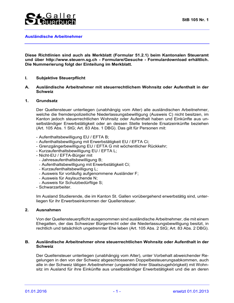 StB 105 Nr. 1 Ausländische Arbeitnehmer Diese Richtlinien sind auch als Merkblatt (Formular 51.2.1) beim Kantonalen Steueramt und über http://www.steuern.sg.ch - Formulare/Gesuche - Formulardownload erhältlich. Die Nummerierung folgt der Einteilung im Merkblatt. I. Subjektive Steuerpflicht A. Ausländische Arbeitnehmer mit steuerrechtlichem Wohnsitz oder Aufenthalt in der Schweiz 1. Grundsatz Der Quellensteuer unterliegen (unabhängig vom Alter) alle ausländischen Arbeitnehmer, welche die fremdenpolizeiliche Niederlassungsbewilligung (Ausweis C) nicht besitzen, im Kanton jedoch steuerrechtlichen Wohnsitz oder Aufenthalt haben und Einkünfte aus unselbständiger Erwerbstätigkeit oder an dessen Stelle tretende Ersatzeinkünfte beziehen (Art. 105 Abs. 1 StG; Art. 83 Abs. 1 DBG). Das gilt für Personen mit: - Aufenthaltsbewilligung EU / EFTA B; Aufenthaltsbewilligung mit Erwerbstätigkeit EU / EFTA Ci; Grenzgängerbewilligung EU / EFTA G mit wöchentlicher Rückkehr; Kurzaufenthaltsbewilligung EU / EFTA L; Nicht-EU / EFTA-Bürger mit - Jahresaufenthaltsbewilligung B; - Aufenthaltsbewilligung mit Erwerbstätigkeit Ci; - Kurzaufenthaltsbewilligung L; - Ausweis für vorläufig aufgenommene Ausländer F; - Ausweis für Asylsuchende N; - Ausweis für Schutzbedürftige S; - Schwarzarbeiter. Im Ausland Studierende, die im Kanton St. Gallen vorübergehend erwerbstätig sind, unterliegen für ihr Erwerbseinkommen der Quellensteuer. 2. Ausnahmen Von der Quellensteuerpflicht ausgenommen sind ausländische Arbeitnehmer, die mit einem Ehegatten, der das Schweizer Bürgerrecht oder die Niederlassungsbewilligung besitzt, in rechtlich und tatsächlich ungetrennter Ehe leben (Art. 105 Abs. 2 StG; Art. 83 Abs. 2 DBG). B. Ausländische Arbeitnehmer ohne steuerrechtlichen Wohnsitz oder Aufenthalt in der Schweiz Der Quellensteuer unterliegen (unabhängig vom Alter), unter Vorbehalt abweichender Regelungen in den von der Schweiz abgeschlossenen Doppelbesteuerungsabkommen, auch alle in der Schweiz tätigen Arbeitnehmer (ungeachtet ihrer Staatszugehörigkeit) mit Wohnsitz im Ausland für ihre Einkünfte aus unselbständiger Erwerbstätigkeit und die an deren 01.01.2016 -1- ersetzt 01.01.2013 StB 105 Nr. 1 Stelle tretenden Ersatzeinkünfte (Art. 115 Abs. 1 lit. a StG; Art. 91 DBG). Es betrifft dies folgende Personen bzw. Bewilligungsarten: - Kurzaufenthaltsbewilligung EU / EFTA L; - Kurzaufenthaltsbewilligung L; - EU/EFTA-Staatsangehörige für kurze Arbeitseinsätze während max. 90 Tagen (Meldefälle); - Wochenaufenthalter; - Schwarzarbeiter; - österreichische Arbeitnehmer, die bei einem öffentlich-rechtlichen Arbeitgeber in der Schweiz tätig sind (Art. 19 DBA-A; Ausweis G); - österreichische Arbeitnehmer, die bei einem privatrechtlichen Arbeitgeber in der Schweiz tätig sind (Art. 15 DBA-A; Ausweis G); - liechtensteinische Grenzgänger, die bei einem öffentlich-rechtlichen Arbeitgeber in der Schweiz tätig sind und demzufolge gemäss Art. 7 Abs. 1 DBA-FL nicht der Grenzgänger-Regelung mit dem Fürstentum Liechtenstein unterliegen; - Grenzgänger (siehe separate Merkblätter 51.3.1 und 2; StB 115 Nr. 1 und 115 Nr. 2). Arbeitnehmer ohne steuerrechtlichen Wohnsitz oder Aufenthalt in der Schweiz, die für Arbeit im internationalen Verkehr an Bord eines Schiffes oder eines Luftfahrzeuges oder bei einem Transport auf der Strasse Lohn oder andere Vergütungen von einem Arbeitgeber mit Sitz oder Betriebsstätte im Kanton erhalten, unterliegen ohne Rücksicht auf ihre Staatsangehörigkeit ebenfalls der Quellensteuer (siehe separates Merkblatt 51.2.1a; StB 115 Nr. 3). Il. Objektive Steuerpflicht A. Erwerbseinkommen Steuerbar sind alle dem Pflichtigen für seine Arbeitstätigkeit ausgerichteten oder gutgeschriebenen Entschädigungen, insbesondere der ordentliche Arbeitslohn (Monatssalär, Stunden- bzw. Taglohn, Akkordentschädigungen, Lohn für Überzeit-, Nacht- und Extraarbeiten, Arbeitsprämien, Bonuszahlungen), sämtliche Lohnzulagen (Familien- und Kinderzulagen, Orts- und Teuerungszulagen usw.), Provisionen, Gratifikationen, Dienstalters- und Jubiläumsgeschenke, geldwerte Vorteile aus Mitarbeiterbeteiligungen, Naturalleistungen (Kost und Logis, Geschäftsauto etc.), Trinkgelder, Pauschalspesen und Abgangsentschädigungen (Art. 106 Abs. 2 lit. a StG i.V.m. Art. 30 StG; Art. 84 Abs. 2 DBG). Leistungen des Arbeitgebers an Prämien für Kranken-, Unfall-, Vorsorge- und Hinterlassenenversicherung etc. sowie die Bezahlung der Quellensteuer (Nettolohnvereinbarung), die dieser an Stelle des Arbeitnehmers erbringt, sind Bestandteil des steuerbaren Arbeitslohnes. Nicht steuerpflichtig sind allerdings Beiträge des Arbeitgebers an die obligatorische Unfallversicherung gemäss UVG (BUV und NBUV) sowie Beiträge für vom Arbeitgeber abgeschlossene Kollektivkrankentaggeldversicherungen und kollektive UVGZusatzversicherungen. Leistungen des Arbeitgebers für den Arbeitsweg (Wegentschädigungen) sowie Verpflegung sind ebenfalls Bestandteil des steuerbaren Einkommens. ersetzt 01.01.2013 -2- 01.01.2016 StB 105 Nr. 1 Leistungen des Arbeitgebers für Ersatz von Reisespesen und anderen besonderen Berufsauslagen gelten nur insoweit nicht als Bestandteil des steuerbaren Arbeitslohnes, als ihnen echte Aufwendungen gegenüberstehen (reiner Auslagenersatz) bzw. ein bewilligtes Spesenreglement vorliegt. Die Aufwendungen sind zu belegen. Für die Bewertung von Naturalleistungen (freie Kost und Logis) gelten grundsätzlich die Pauschalansätze der eidgenössischen Alters- und Hinterlassenenversicherung (Art. 106 Abs. 2 lit. a StG i.V.m. Art. 10 StV; Art. 84 Abs. 3 DBG). Sie betragen Fr. 33.-- pro Tag. Wird nicht die volle Verpflegung und Unterkunft gewährt, so sind für das Frühstück Fr. 3.50, das Mittagessen Fr. 10.--, das Abendessen Fr. 8.-- und für die Unterkunft Fr. 11.50 zu berücksichtigen. B. Ersatzeinkünfte Steuerbar sind alle an die Stelle des Erwerbseinkommens tretenden und durch den Arbeitgeber ausgerichteten Ersatzeink