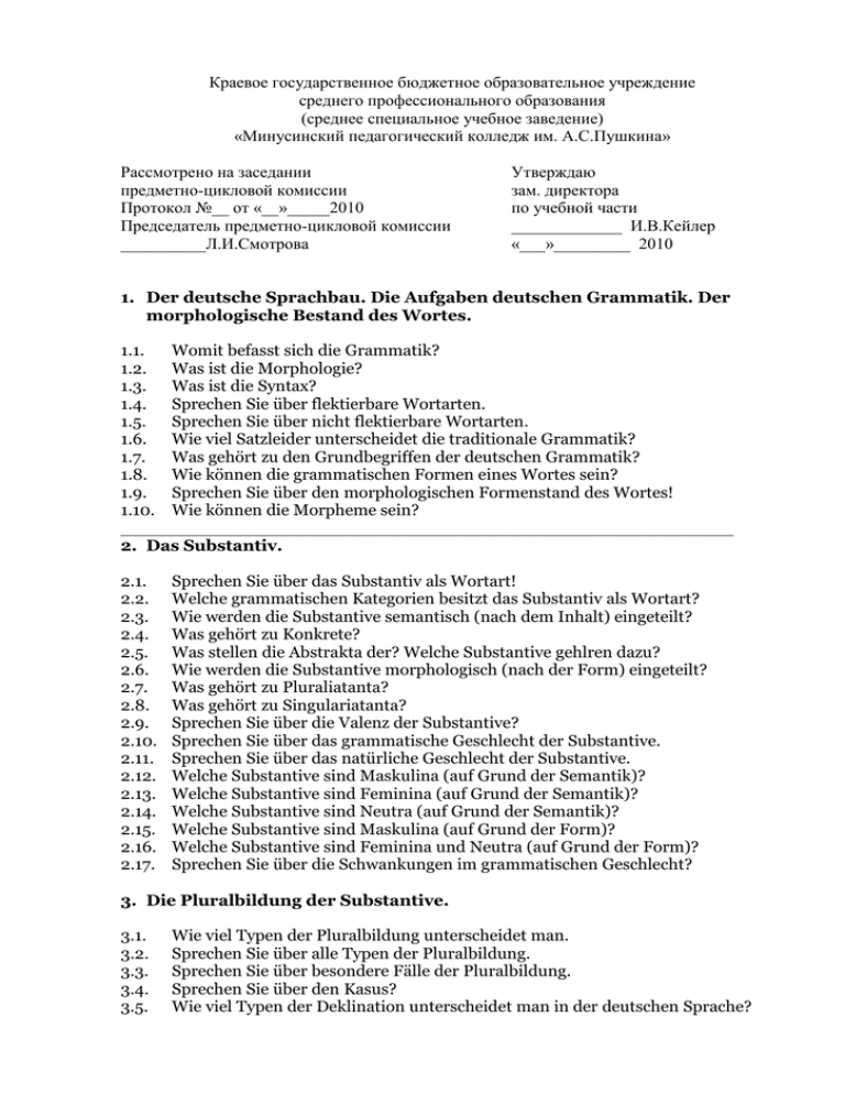 Краевое государственное бюджетное образовательное учреждение среднего профессионального образования (среднее специальное учебное заведение) «Минусинский педагогический колледж им. А.С.Пушкина» Рассмотрено на заседании предметно-цикловой комиссии Протокол №__ от «__»_____2010 Председатель предметно-цикловой комиссии __________Л.И.Смотрова Утверждаю зам. директора по учебной части _____________ И.В.Кейлер «___»_________ 2010 1. Der deutsche Sprachbau. Die Aufgaben deutschen Grammatik. Der morphologische Bestand des Wortes. 1.1. Womit befasst sich die Grammatik? 1.2. Was ist die Morphologie? 1.3. Was ist die Syntax? 1.4. Sprechen Sie über flektierbare Wortarten. 1.5. Sprechen Sie über nicht flektierbare Wortarten. 1.6. Wie viel Satzleider unterscheidet die traditionale Grammatik? 1.7. Was gehört zu den Grundbegriffen der deutschen Grammatik? 1.8. Wie können die grammatischen Formen eines Wortes sein? 1.9. Sprechen Sie über den morphologischen Formenstand des Wortes! 1.10. Wie können die Morpheme sein? ________________________________________________________________________ 2. Das Substantiv. 2.1. 2.2. 2.3. 2.4. 2.5. 2.6. 2.7. 2.8. 2.9. 2.10. 2.11. 2.12. 2.13. 2.14. 2.15. 2.16. 2.17. Sprechen Sie über das Substantiv als Wortart! Welche grammatischen Kategorien besitzt das Substantiv als Wortart? Wie werden die Substantive semantisch (nach dem Inhalt) eingeteilt? Was gehört zu Konkrete? Was stellen die Abstrakta der? Welche Substantive gehlren dazu? Wie werden die Substantive morphologisch (nach der Form) eingeteilt? Was gehört zu Pluraliatanta? Was gehört zu Singulariatanta? Sprechen Sie über die Valenz der Substantive? Sprechen Sie über das grammatische Geschlecht der Substantive. Sprechen Sie über das natürliche Geschlecht der Substantive. Welche Substantive sind Maskulina (auf Grund der Semantik)? Welche Substantive sind Feminina (auf Grund der Semantik)? Welche Substantive sind Neutra (auf Grund der Semantik)? Welche Substantive sind Maskulina (auf Grund der Form)? Welche Substantive sind Feminina und Neutra (auf Grund der Form)? Sprechen Sie über die Schwankungen im grammatischen Geschlecht? 3. Die Pluralbildung der Substantive. 3.1. 3.2. 3.3. 3.4. 3.5. Wie viel Typen der Pluralbildung unterscheidet man. Sprechen Sie über alle Typen der Pluralbildung. Sprechen Sie über besondere Fälle der Pluralbildung. Sprechen Sie über den Kasus? Wie viel Typen der Deklination unterscheidet man in der deutschen Sprache? 3.6. 3.7. 3.8. 3.9. Sprechen Sie über den Mischtyp! Wie werden die Substantive im Plural dekliniert? Wie dekliniert man die Personennamen? Wie dekliniert man die geographischen Namen? 4. Der Artikel. 4.1 Wie viel Arten von Artikel gibt es im Deutschen? 4.2 Wovon hängt die Form des Artikels ab? 4.3 Sprechen Sie über die Funktionen des Artikels? 4.4 Wann gebraucht man den bestimmten Artikel? 4.5 Wann gebraucht man den unbestimmten Artikel? 4.6 Wann gebraucht man den Nullartikel? ___________________________________________________________________________ 5. Einteilung der Verben. 5.1. 5.2. 5.3. 5.4. 5.5. 5.6. 5.7. 5.8. 5.9. 5.10. 5.11. 5.12. 5.13. 5.14. 5.15. Welche Verben unterscheidet man nach ihrer Bedeutung? Welche Verben unterscheidet man nach ihrer Flexion? Welche Verben unterscheidet man nach der Form? Welche Verben unterscheidet man nach ihrer Ergänzungsbedürftigkeit? Welche Verben unterscheidet man nach ihrer Leistung im Satz? Welche Verben unterscheidet man nach der Wortbildung? Welche Verben unterscheidet man nach der Aktionsart? Erzählern Sie kurz über den Fügungswert des Verbs! Welche Verben gehören zu den unregelmäßigen Verben? Welche Verben können als Hilfsverben entraten? Sprechen Sie über die Modalverben und über die Verben, die modalen Charakter haben! Sprechen Sie über transitive und intransitive Verben! Sprechen Sie über persönliche und unpersönliche Verben. Sprechen Sie über reflexive und unechte reflexive Verben. Sprechen Sie über reziproke Verben. 17. Der Gebrauch der Tempora. 17.1. Was umfasst die Konjugation des Verbs? 17.2. Wie werden das Präsens und das Präteritum der schwachen und der starken Verben gebildet? 17.3. Wie werden das Perfekt und das Plusquamperfekt gebildet? 17.4. Wann steht das Hilfsverb „haben“? 17.5. Wann steht das Hilfsverb „sein“? 17.6. Warum muss man den Gebrauch der Tempora im einfachen Hauptsatz von dem im zusammengesetzten Satz unterscheiden? 17.7. Was bezeichnet das Präsens? 17.8. Was bezeichnet das Präteritum? 17.9. Was drückt das Perfekt aus? 17.10. Was stellt das Plusquamperfekt dar? 17.11. Sprechen Sie über das Futur! ______________________________________________________ 6. Der Infinitiv. 6.1. 6.2. 6.3. 6.4. Welche Infinitivformen unterscheidet man in Deutschen? Wann gebraucht man den Infinitiv ohne zu? Wann schwankt der Gebrauch des reihen und des präpositionalen Infinitivs? Sprechen Sie über die Substantivierung des Infinitivs! 7. Das Partizip. 1. 2. 3. 4. 5. 6. Wie wird das Partizip I gebildet? Wie wird das Partizip II gebildet? Was zeigt das Partizip II? Was drückt das Partizip II aus? Sprechen Sie über den normalen Charakter des Partizips! Sprechen Sie über den verbalen Charakter des Partizipy! _________________________________________________________________________ 8. Genera. 8.1 Wie viel Genera unterscheidet man in Deutschen? 8.2 Was bezeichnet das Aktiv? 8.3 Wann wird das Verb in passiver Form gebraucht? 8.4 Wir wird das Passiv gebildet? 8.5 Sprechen Sie über den Infinitiv I Passiv! 8.6 Erzählen Sie über die zweigliedrige passivische Konstruktion! 8.7 Wann hat das Passiv eine dreigliedrige Konstruktion! 8.8 Sprechen Sie über den Zustandspassiv! 9