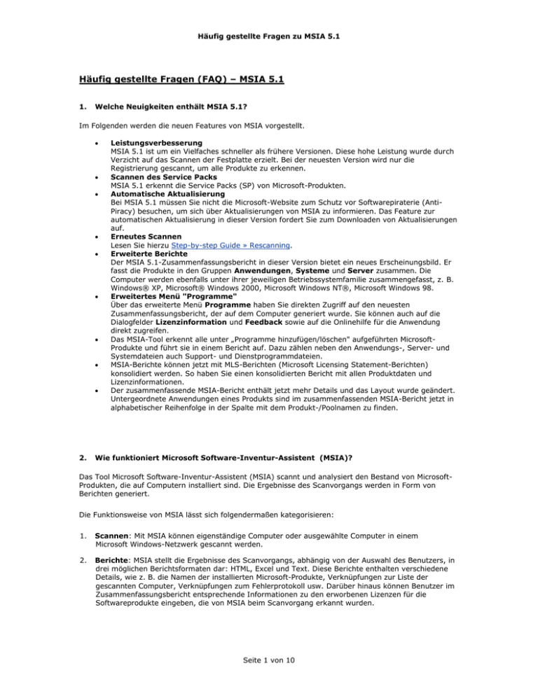 Häufig gestellte Fragen zu MSIA 5.1 Häufig gestellte Fragen (FAQ) – MSIA 5.1 1. Welche Neuigkeiten enthält MSIA 5.1? Im Folgenden werden die neuen Features von MSIA vorgestellt. 2. Leistungsverbesserung MSIA 5.1 ist um ein Vielfaches schneller als frühere Versionen. Diese hohe Leistung wurde durch Verzicht auf das Scannen der Festplatte erzielt. Bei der neuesten Version wird nur die Registrierung gescannt, um alle Produkte zu erkennen. Scannen des Service Packs MSIA 5.1 erkennt die Service Packs (SP) von Microsoft-Produkten. Automatische Aktualisierung Bei MSIA 5.1 müssen Sie nicht die Microsoft-Website zum Schutz vor Softwarepiraterie (AntiPiracy) besuchen, um sich über Aktualisierungen von MSIA zu informieren. Das Feature zur automatischen Aktualisierung in dieser Version fordert Sie zum Downloaden von Aktualisierungen auf. Erneutes Scannen Lesen Sie hierzu Step-by-step Guide » Rescanning. Erweiterte Berichte Der MSIA 5.1-Zusammenfassungsbericht in dieser Version bietet ein neues Erscheinungsbild. Er fasst die Produkte in den Gruppen Anwendungen, Systeme und Server zusammen. Die Computer werden ebenfalls unter ihrer jeweiligen Betriebssystemfamilie zusammengefasst, z. B. Windows® XP, Microsoft® Windows 2000, Microsoft Windows NT®, Microsoft Windows 98. Erweitertes Menü "Programme" Über das erweiterte Menü Programme haben Sie direkten Zugriff auf den neuesten Zusammenfassungsbericht, der auf dem Computer generiert wurde. Sie können auch auf die Dialogfelder Lizenzinformation und Feedback sowie auf die Onlinehilfe für die Anwendung direkt zugreifen. Das MSIA-Tool erkennt alle unter „Programme hinzufügen/löschen" aufgeführten MicrosoftProdukte und führt sie in einem Bericht auf. Dazu zählen neben den Anwendungs-, Server- und Systemdateien auch Support- und Dienstprogrammdateien. MSIA-Berichte können jetzt mit MLS-Berichten (Microsoft Licensing Statement-Berichten) konsolidiert werden. So haben Sie einen konsolidierten Bericht mit allen Produktdaten und Lizenzinformationen. Der zusammenfassende MSIA-Bericht enthält jetzt mehr Details und das Layout wurde geändert. Untergeordnete Anwendungen eines Produkts sind im zusammenfassenden MSIA-Bericht jetzt in alphabetischer Reihenfolge in der Spalte mit dem Produkt-/Poolnamen zu finden. Wie funktioniert Microsoft Software-Inventur-Assistent (MSIA)? Das Tool Microsoft Software-Inventur-Assistent (MSIA) scannt und analysiert den Bestand von MicrosoftProdukten, die auf Computern installiert sind. Die Ergebnisse des Scanvorgangs werden in Form von Berichten generiert. Die Funktionsweise von MSIA lässt sich folgendermaßen kategorisieren: 1. Scannen: Mit MSIA können eigenständige Computer oder ausgewählte Computer in einem Microsoft Windows-Netzwerk gescannt werden. 2. Berichte: MSIA stellt die Ergebnisse des Scanvorgangs, abhängig von der Auswahl des Benutzers, in drei möglichen Berichtsformaten dar: HTML, Excel und Text. Diese Berichte enthalten verschiedene Details, wie z. B. die Namen der installierten Microsoft-Produkte, Verknüpfungen zur Liste der gescannten Computer, Verknüpfungen zum Fehlerprotokoll usw. Darüber hinaus können Benutzer im Zusammenfassungsbericht entsprechende Informationen zu den erworbenen Lizenzen für die Softwareprodukte eingeben, die von MSIA beim Scanvorgang erkannt wurden. Seite 1 von 10 Häufig gestellte Fragen zu MSIA 5.1 Hinweis: MSIA ist ein eigenständiges Tool. Es liest Registrierungsinformationen, um die Produkte eines Computers zu identifizieren. Außerdem hat dieses Tool keine Auswirkungen auf die Funktionsfähigkeit des gescannten Systems oder auf die anderen im System ausgeführten Programme. 3. Was installiert MSIA auf meinem Computer? Bei der Installation werden die ausführbaren Dateien des MSIA-Tools sowie die Datendateien mit den Details der zu scannenden Produkte in das System kopiert. Diese Datendateien sollten nicht bearbeitet, gelöscht oder umbenannt werden, weil dadurch die Funktion von MSIA beeinträchtigt werden kann. Außerdem werden während der Installation die erforderlichen Registrierungseinträge erstellt. Beim Scannen im Netzwerkmodus werden die ausführbaren Dateien und Datendateien von MSIA auf dem Computer installiert, auf dem die Bestandsaufnahme gestartet wird. Während MSIA die Computer im Netzwerk scannt, werden keine Daten auf die anderen Computer geschrieben, da die Dateien vom Computer mit MSIA gelesen werden. 4. Welche Scanlogik wird in MSIA verwendet? Abhängig von der Art des Scanvorgangs wird die folgende Scanlogik verwendet: 1. Scannen eines lokalen Computers: 2. MSIA scannt die vom Benutzer angegebenen Microsoft-Produkte. MSIA durchsucht die Registrierung nach installierten Microsoft-Produkten und zeigt dem Benutzer die Produktauswahl an. MSIA durchsucht die vom Benutzer angegebenen Microsoft-Produkte. Scannen eines Netzwerks: Für das Scannen eines Netzwerks gelten sämtliche für das Scannen eines lokalen Computers erforderlichen Schritte mit der Ausnahme, dass MSIA vor dem Beginn des Scanvorgangs die Netzwerkverbindungen prüft. Das System überprüft auf allen zu scannenden Computern die Benutzerzugriffsrechte. Wenn keine Rechte vorhanden sind, führt MSIA, abhängig von der Auswahl des Benutzers, die folgenden Aktionen aus: Melden des Fehlers und Warten auf eine Antwort des Benutzers. Ignorieren des Fehlers, Protokollieren des Fehlers und Fortsetzen des Scanvorgangs ohne Benutzereingabe. Wenn ein Netzwerkfehler auftritt, kann der Benutzer festlegen, dass eine der folgenden Aktionen von MSIA ausgeführt wird: Abbrechen: Protokollieren des Fehlers und Beenden der Anwendung. Ignorieren: Ignorieren des Fehlers, Protokollieren des Fehlers und Fortsetzen des Scanvorgangs ohne Benutzereingabe. Melden: Melden des Fehlers und Warten auf eine Antwort des Benutzers. Wenn ein vernetzter PC unter Windows 98 oder Windows Millennium Edition gescannt werden soll, müssen die Festplatten dieses Computers als <Festplattenname>$ freigegeben werden Zus