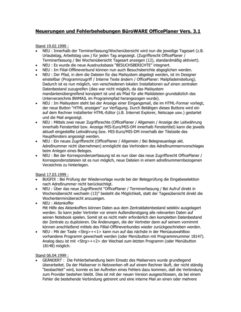 Neuerungen und Fehlerbehebungen BüroWARE OfficePlaner Vers. 3.1 Stand 19.02.1999 : NEU : Innerhalb der Terminerfassung/Wochenübersicht wird nun die jeweilige Tagesart (z.B. Urlaubstag, Arbeitstag usw.) für jeden Tag angezeigt. (Zugriffsrecht OfficePlaner / Terminerfassung / Bei Wochenübersicht Tagesart anzeigen (12), standardmäßig aktiviert). NEU : Es wurde die neue Ausdrucksbasis “BESUCHSBERICHTE” integriert. NEU : Im Filial-Offlineverbund können nun auch Besuchsberichte abgeglichen werden. NEU : Der Pfad, in dem die Dateien für das Mailsystem abgelegt werden, ist im Designer einstellbar (Programmzugriff / Interne Texte ändern / OfficePlaner: Mailpfadeinstellung). Dadurch ist es nun möglich, von verschiedenen lokalen Installationen auf einen zentralen Datenbestand zuzugreifen (dies war nicht möglich, da das Mailsystem mandantenübergreifend konzipiert ist und als Pfad für alle Maildateien grundsätzlich das Unterverzeichnis BWMAIL im Programmpfad herangezogen wurde). NEU : Im Mailsystem steht bei der Anzeige einer Eingangsmail, die im HTML-Formar vorliegt, der neue Button “HTML anzeigen” zur Verfügung. Durch Betätigen dieses Buttons wird ein auf dem Rechner installierter HTML-Editor (z.B. Internet Explorer, Netscape usw.) gestartet und die Mail angezeigt. NEU : Mittels zwei neuer Zugriffsrechte (OfficePlaner / Allgemein / Anzeige der Leitwährung innerhalb Fenstertitel bzw. Anzeige MIS-Euro/MIS-DM innerhalb Fenstertitel) kann die jeweils aktuell eingestellte Leitwährung bzw. MIS-Euro/MIS-DM innerhalb der Titelzeile des Hauptfensters angezeigt werden. NEU : Ein neues Zugriffsrecht (OfficePlaner / Allgemein / Bei Belegneuanlage akt. Adreßnummer nicht übernehmen) ermöglicht das Verhindern des Adreßnummernvorschlages beim Anlegen eines Beleges. NEU : Bei der Korrespondenzerfassung ist es nun über das neue Zugriffsrecht OfficePlaner / Korrespondenzdateien ist es nun möglich, neue Dateien in einem adreßnummernbezogenen Verzeichnis zu hinterlegen. Stand 17.03.1999 : BUGFIX : Bei Prüfung der Wiedervorlage wurde bei der Belegprüfung die Eingabeselektion nach Adreßnummer nicht berücksichtigt. NEU : Über das neue Zugriffsrecht “OfficePlaner / Terminerfassung / Bei Aufruf direkt in Wochenübersicht wechseln (13)” besteht die Möglichkeit, statt der Tagesübersicht direkt die Wochenterminübersicht anzuzeigen. NEU : Aktenkoffer Mit Hilfe des Aktenkoffers können Daten aus dem Zentraldatenbestand selektiv ausgelagert werden. So kann jeder Vertreter vor einem Außendienstgang alle relevanten Daten auf seinen Notebook spielen. Somit ist es nicht mehr erforderlich den kompletten Datenbestand der Zentrale zu duplizieren. Die Änderungen, die der Vertreter dann auf seinem vornimmt können anschließend mittels des Fililal-Offlineverbundes wieder zurückgeschrieben werden. NEU : Mit der Taste <Strg>+<1> kann nun auf das nächste in der Menüauswahlbox vorhandene Programm gewechselt werden (oder Menübutton mit Programmnummer 18147). Analog dazu ist mit <Strg>+<2> der Wechsel zum letzten Programm (oder Menübutton 18148) möglich. Stand 06.04.1999 : GEÄNDERT : Die Fehlerbehandlung beim Einsatz des Mailservers wurde grundlegend überarbeitet. Da der Mailserver in Netzwerken oft auf einem Rechner läuft, der nicht ständig “beobachtet” wird, konnte es bei Auftreten eines Fehlers dazu kommen, daß die Verbindung zum Provider bestehen bleibt. Dies ist mit der neuen Version ausgeschlossen, da bei einem Fehler die bestehende Verbindung getrennt und eine interne Mail an einen oder mehrere Systemverwalter geschickt wird, aus der eindeutig hervorgeht, welche Probleme bei der Online-Sitzung auftraten. Die Definition der Empfänger dieser Mailserver-Info-Mail erfolgt in den allgemeinen Mailserver-Einstellungen (neues Feld: Bedienerselektion). BUGFIX : Emails, deren Mailtext größer als 16 Kbyte war, wurden in bestimmten Fällen nicht korrekt versendet. Stand 09.04.1999 : NEU : Folgende Programme sind ins OfficePlaner-Menü neu aufgenommen worden: Codewort ändern (Programmnummer 18149) Lizenzerfassung (18150) Mandantenanlage (18151) Update aktualisieren (18152) Falls beim Update der Schalter “OfficePlaner Hauptmenü” aktiviert ist, werden diese Programmpunkte automatisch im Menü “Datei” integriert. BUGFIX : Innerhalb der Terminauswertung wurde ein definierter Gruppenwechsel ignoriert. BUGFIX : Einige neue Module innerhalb des Warenwirtschafts- bzw. Fibumenüs innerhalb des OfficePlaners konnten nicht aufgerufen werden. BUGFIX : Der Aufruf einiger Auswertungen innerhalb des Fibu-Menüs (z.B. Sachkontenstammliste) führte zu Schutzverletzungen. Stand 19.04.1999 : NEU : Über ein neues Zugriffsrecht ist es nun möglich, innerhalb der TerminerfassungsTagesübersicht den Kalender mit Anzeige der Kalenderwoche darzustellen (Zugriffsrecht: OfficePlaner / Terminerfassung / Tagesübersicht-Kalender mit Anzeige der KW) NEU : Bei der Abteilungs-/Projekt-Übersicht innerhalb der Terminverwaltung wird der Zeitraum ab der aktuellen Uhrzeit angezeigt. (Neues Zugriffsrecht: OfficePlaner / Startzeit Terminübersicht / Startzeit bei Abt./Projektübersicht akt. Uhrzeit (standardmässig aktiviert)). NEU : Im Filial-Offline-Verbund können Adress-Korrespondenzen ausgetauscht werden. Voraussetzung für den Abgleich ist das Aktivieren des Schalters (Desingner-Menü: Einstellungen / Offline-Verbund-Definition / Eintrag: “(Ab V31) Adress-Korrespondenzen”). Zu beachten ist hierbei, daß in diesem Falle nicht mehr die Austauschdatei “STANDARD.DTA” allein alle Informationen enthält, sondern die Dateien D???????.DAT (D0000000.DAT – D9999999.DAT) mit kopiert werden müssen. NEU: Die TAPI-Ruferkennung funktionierte (im Gegensatz zum Wählen) bisher ausschliesslich auf der Grundlage von AT-Kommandos (Modem Kommandos). Nun kann die Anruferkennung auch über reine TAPI-Befehle abgewickelt werden. Welcher Modus von den beiden geeigneter ist, hängt vom jeweilig verwendeten Telefon ab. Bei