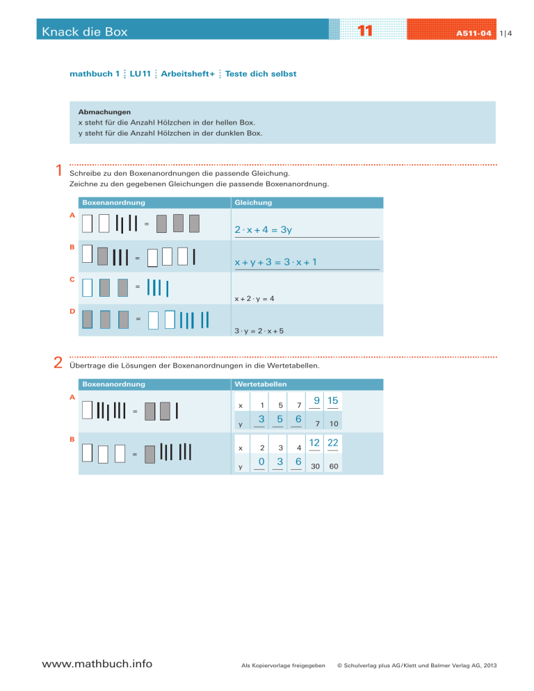 11 Knack die Box mathbuch 1 LU 11 Arbeitsheft + A511-04 Teste dich selbst Abmachungen x steht für die Anzahl Hölzchen in der hellen Box. y steht für die Anzahl Hölzchen in der dunklen Box. 1 Schreibe zu den Boxenanordnungen die passende Gleichung. Zeichne zu den gegebenen Gleichungen die passende Boxenanordnung. Boxenanordnung Gleichung A = 2 ∙ x + 4 = 3y B = C x+y+3 = 3∙x+1 = x+2∙y = 4 D = 3∙y = 2∙x+5 2 Übertrage die Lösungen der Boxenanordnungen in die Wertetabellen. Boxenanordnung Wertetabellen A = x y 1 5 7 3 5 6 2 3 4 0 3 6 B = x y www.mathbuch.info 9 15 7 10 12 22 30 Als Kopiervorlage freigegeben 60 © Schulverlag plus AG / Klett und Balmer Verlag AG, 2013 1|4 11 Knack die Box mathbuch 1 3 LU 11 Arbeitsheft + Teste dich selbst Zeichne jeweils eine mögliche Boxenanordnung. Boxenanordnung Wertetabellen A = B = 4 A511-04 x 1 2 3 10 50 y 5 9 13 39 199 x 1 2 3 4 10 y 1 3 5 7 19 Ergänze zu den Texten A und B die Wertetabellen und schreibe zu den Wertetabellen C und D die passenden Texte. Text A Wertetabelle y ist halb so gross wie x. x y B x ist um 5 kleiner als y. x y 2 4 6 8 10 1 2 3 4 5 1 2 3 4 5 6 7 8 9 10 C y ist viermal so gross wie x. x 1 3 5 7 9 y 4 12 20 28 36 x 3 5 6 7 12 y 1 3 4 5 10 D x ist um zwei grösser als y. www.mathbuch.info Als Kopiervorlage freigegeben © Schulverlag plus AG / Klett und Balmer Verlag AG, 2013 2|4 11 Knack die Box mathbuch 1 5 LU 11 Arbeitsheft + A511-04 Teste dich selbst A Bei jeder Aufgabe müssen die Boxenanordnung, die Gleichung, die Wertetabelle und der Text zusammenpassen. Ergänze die Tabelle. Boxenanordnung Gleichung Wertetabelle I x = 2∙x = y+1 y Text 1 2 3 4 5 1 3 5 7 9 In der dunklen Box liegt ein Hölzchen weniger als in den zwei hellen zusammen. II 2∙x = y = x y 2 4 6 10 20 4 8 12 20 40 In der dunklen Box liegen doppelt so viele Hölzchen wie in der hellen Box. III = x = y+1 x 1 5 10 15 20 y 0 4 9 14 19 In der hellen Box liegt ein Hölzchen mehr als in der dunklen Box. IV = x x + y = 15 y 1 2 3 4 5 14 13 12 11 10 In der hellen Box und dunklen Box liegen zusammen 15 Hölzchen. B Finde die Lösung. Boxenandordnung 1 V = Boxenandordnung 2 und = Lösung x= y= VI = und = x= y= www.mathbuch.info Als Kopiervorlage freigegeben 2 3 1 4 © Schulverlag plus AG / Klett und Balmer Verlag AG, 2013 3|4 11 Knack die Box mathbuch 1 6 LU 11 Arbeitsheft + A511-04 Teste dich selbst Gib zu den Boxenanordnungen die Lösung an und ordne sie den vier verschiedenen Lösungstypen zu. Typ 1: Diese Boxenanordnung hat genau eine Lösung. Typ 2: Diese Boxenanordnung hat unendlich viele Zahlen als Lösung. Typ 3: Diese Boxenanordnung hat keine Lösung. Typ 4: Diese Boxenanordnung hat mehrere Zahlenpaare als Lösung. Boxenanordnung A B C = Typ x=2 1 = 3 = y=1 D E Lösung, Lösungen = = 2 x=0 1 y G x www.mathbuch.info … 1 x = y=3 x=1 F = y=2 y 1 3 5 7 9 1 2 3 4 5 1 2 3 4 5 1 1 1 1 1 Als Kopiervorlage freigegeben 4 4 © Schulverlag plus AG / Klett und Balmer Verlag AG, 2013 4|4
