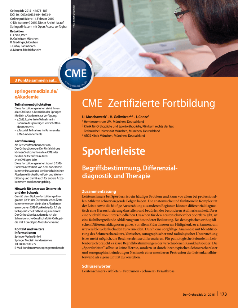 © Klaus Rüschhoff, Springer Medizin Orthopäde 2015 · 44:173–187 DOI 10.1007/s00132-014-3073-9 Online publiziert: 11. Februar 2015 © Die Autor(en) 2015. Dieser Artikel ist auf Springerlink.com mit Open Access verfügbar Redaktion C. Chiari, Wien H. Gollwitzer, München R. Gradinger, München J. Grifka, Bad Abbach A. Meurer, Friedrichsheim CME springermedizin.de/ eAkademie Teilnahmemöglichkeiten Diese Fortbildungseinheit steht Ihnen als e.CME und e.Tutorial in der Springer Medizin e.Akademie zur Verfügung. – e.CME: kostenfreie Teilnahme im Rahmen des jeweiligen Zeitschriften­ abonnements – e.Tutorial: Teilnahme im Rahmen des e.Med-Abonnements in g .d e pr s 3 Punkte sammeln auf... e rm e dizi n CME Zertifizierte Fortbildung U. Muschaweck1 · H. Gollwitzer2,3 · J. Conze1 1 Hernienzentrum UM, München, Deutschland 2 Klinik für Orthopädie und Sportorthopädie, Klinikum rechts der Isar, Technische Universität München, München, Deutschland 3 ATOS Klinik München, München, Deutschland Zertifizierung Als Zeitschriftenabonnent von Der Orthopäde oder Der Unfallchirurg können Sie kostenlos alle e.CMEs der beiden Zeitschriften nutzen: 24 e.CMEs pro Jahr. Diese Fortbildungseinheit ist mit 3 CMEPunkten zertifiziert von der Landesärzte­ kammer Hessen und der Nord­rheinischen Akademie für Ärztliche Fort- und Weiter­ bildung und damit auch für ­andere Ärzte­ kammern anerkennungsfähig. Hinweis für Leser aus Österreich und der Schweiz Gemäß dem Diplom-Fortbildungs-Pro­ gramm (DFP) der Österreichischen Ärzte­ kammer werden die in der e.Akademie erworbenen CME-Punkte hierfür 1:1 als fachspezifische ­Fortbildung anerkannt. Der Orthopäde ist zudem durch die Schweizerische Gesellschaft für Orthopä­ die mit 1 Credit pro Modul anerkannt. Kontakt und weitere Informationen Springer-Verlag GmbH Springer Medizin Kundenservice Tel. 0800 77 80 777 E-Mail: kundenservice@springermedizin.de Sportlerleiste Begriffsbestimmung, Differenzialdiagnostik und Therapie Zusammenfassung Leistenschmerz bei Sportlern ist ein häufiges Problem und kann vor allem bei professionellen Athleten schwerwiegende Folgen haben. Die anatomische und funktionelle Komplexität der Leiste sowie die häufige Ausstrahlung aus anderen Regionen können differenzialdiagnostisch eine Herausforderung darstellen und bedürfen der besonderen Aufmerksamkeit. Da es eine Vielzahl von unterschiedlichen Ursachen für den Leistenschmerz bei Sportlern gibt, ist eine fachübergreifende Abklärung von besonderer Bedeutung. Bei den typischen orthopädischen Differenzialdiagnosen gilt es, vor allem Präarthrosen am Hüftgelenk zu erkennen, um irreversible Gelenkschäden zu vermeiden. Durch eine sorgfältige Anamnese mit Identifizierung des Schmerzcharakters, klinischer, sonographischer und radiologischer Untersuchung ist es meist möglich, die Beschwerden zu differenzieren. Für pathologische Befunde im Leistenbereich braucht es klare Begriffsbestimmungen der verschiedenen Krankheitsbilder. Die „Sportlerleiste“ selbst ist keine Hernie, sondern ist durch ihren typischen Schmerzcharakter und sonographisch eindeutigen Nachweis einer messbaren Protrusion der Leistenkanalhinterwand als eigene Entität zu verstehen. Schlüsselwörter Leistenschmerz · Athleten · Protrusion · Schmerz · Präarthrose Der Orthopäde 2 · 2015 | 173 CME Lernziele Nach der Lektüre dieses Beitrags 55 sind Sie in der Lage, Symptome von Leistenpathologien zu identifizieren, 55können Sie mögliche Differenzialdiagnosen des Leistenschmerzes erheben, 55wissen Sie, welche diagnostischen Maßnahmen einzusetzen sind, 55kennen Sie die unterschiedlichen Begriffsdefinitionen der Leistenpathologien, 55wissen Sie, welche therapeutischen Möglichkeiten bei der Sportlerleiste infrage kommen. Einleitung Die angegebene Inzidenz für Leistenschmerz variiert je nach Sportart Der Leistenschmerz bei Sportlern findet in den letzten Jahren zunehmendes wissenschaftliches und auch öffentliches Interesse. Der plötzliche Ausfall eines professionellen Athleten kann nicht nur für seine eigene berufliche Karriere, sondern auch für seine Mannschaft enorme Folgen haben. Dabei ist das Problem des Leistenschmerzes bei Sportlern an sich nichts Neues. Bereits 1966 beschrieb Cabot [1] den bei spanischen Fußballspielern auftretenden Leistenschmerz als Osteopatica dinamica del pubis. Er fand eine Inzidenz von 0,5 % über einen Zeitraum von 30 Jahren. Deutlich häufiger war der Leistenschmerz in prospektiven Untersuchungen von Fußballspielern, die Ekstrand und Gillquist [2] Anfang der 1980er-Jahre durchgeführt haben. Hier lag die Inzidenz bereits bei bis zu 13 % in einem Beobachtungszeitraum von bis zu 2 Jahren. Je nach Sportart variiert die angegebene Inzidenz. So fanden Emery et al. bei Eishockeyspielern der nordamerikanischen Hockey-Liga (NHL) eine Leistenverletzung in zwischen 13 und 20 % der Fälle [3]. Unter männlichen Fußballspielern liegt die Inzidenz für chronischen Leistenschmerz bei bis zu 18 % [4]. Differenzialdiagnostik von Leistenschmerzen Hintergrund Bei Fußballspielern ist der akut einsetzende Leistenschmerz häufig zu beobachten Betroffen von Leistenschmerzen sind vor allen Sportler, deren Bewegungsablauf durch eher einseitige körperliche Belastungen mit schnellen, wechselnden Bewegungen gekennzeichnet ist. Gerade bei Fußballspielern, die im Laufschritt tretende und drehende Bewegungen ausführen mit schnellen abrupten Richtungswechseln, kombiniert mit kraftvollem Schießen des Balles, ist der akut einset- Sportsmen’s groin. Definition, differential diagnostics and therapy Abstract Groin pain in athletes is a common problem and can have extensive consequences for professional athletes. The anatomical and functional complexity of the groin as well as radiating pain from remote anatomical regions can make the differential diagnostic a challenge and requires special attention. As there are a wide variety of possible causes for groin pain, a multidiscipli