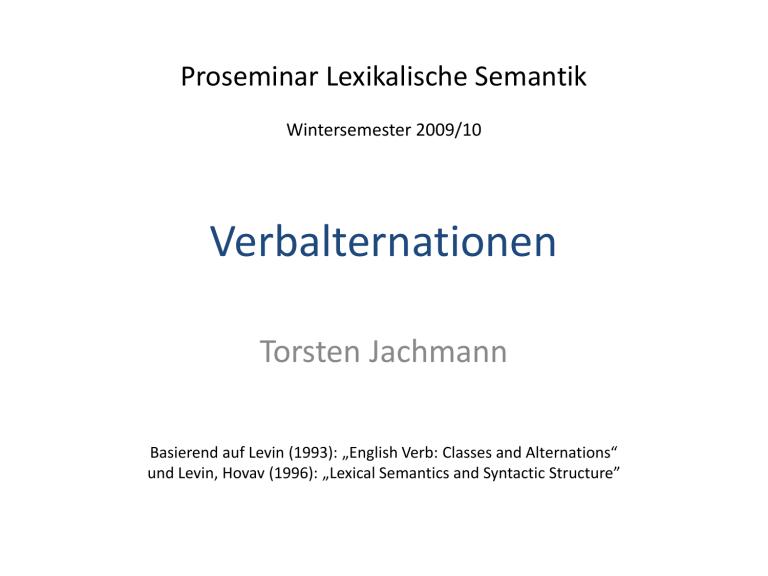 Proseminar Lexikalische Semantik Wintersemester 2009/10 Verbalternationen Torsten Jachmann Basierend auf Levin (1993): „English Verb: Classes and Alternations“ und Levin, Hovav (1996): „Lexical Semantics and Syntactic Structure” Gliederung • Wortbedeutung als Indikator für syntaktisches Verhalten • Arten der Alternation (bezüglich der Transitivität) • Offene Fragen • Unakkusativ Hypothese • Semantischer Klassenwechsel Wortbedeutung als Indikator für syntaktisches Verhalten • Verben mit die augenscheinlich eng verbunden sind verhalten sich syntaktisch unterschiedlich: ( Sharon sprayed water on the plants Sharon sprayed the plants with water Sharon sprühte Wasser auf die Pflanzen Sharon besprühte die Pflanzen mit Wasser) * Monica covered a blanket over the baby Monica covered the baby with a blanket (* Monica deckte eine Decke über das Baby zu Monica deckte das Baby mit einer Decke zu) Wortbedeutung als Indikator für syntaktisches Verhalten • Welche Alternationen lässt ein Verb zu? Beispiel an dem recht seltenen englischen Verb „to gally“ (Seemannssprache) 2 Möglichkeiten: sehen <-> erschrecken The sailors gallied the whales. Sehen: * Erschrecken: (The sailors see/frighten the whales) Whales gally easily. (Whales see easily) (Wale sehen (sich) leicht) Whales gally easily. (Whales frighten easily) (Wale erschrecken sich leicht) Wortbedeutung als Indikator für syntaktisches Verhalten Margaret cut the bread Janet broke the vase Terry touched the cat Carla hit the door conative alternation Margaret cut at the bread *Janet broke at the vase *Terry touched at the cat Carla hit at the door middle alternation The bread cuts easily Crystal vases break easily *Cats touch easily *Doors hit easily body-part possessor ascension alternation Margaret cut Bill on the arm *Janet broke Bill on the finger Terry touched Bill on the shoulder Carla hit Bill on the back Verben können in Klassen unterteilt werden, die bestimmte Aspekte in der Bedeutung teilen. Arten der Alternation (bezüglich der Transitivität) 1) Objekt der transitiven Variante -> Subjekt der intransitiven Variante 1. Middle Alternation (problematisch: ähnlich causative/inchoative) The butcher cuts the meat The meat cuts easily Joan knew the answer *The answer knows easily Möglichkeit nur bei Verben mit beeinflussten Objekten Arten der Alternation (bezüglich der Transitivität) 2. Causative Alternation (Vtransitive -> cause to Vintransitive) a) Causative/Inchoative Alternation Janet broke the cup The cup broke (Janet zerbrach die Tasse) (Die Tasse zerbrach) Margaret cut the bread *The bread cut (Margaret schnitt das Brot) (Das Brot schnitt) Generell möglich bei Verben die eine Zustandsveränderung hervorrufen oder einen Platzwechsel. Jedoch nicht Verben des Schneidens, des Besitzwechsels, u.a.) Arten der Alternation (bezüglich der Transitivität) b) Induced Action Alternation Sylvia jumped the horse over the fence The horce jumped over the fence In erster Linie tritt dies bei Verben der Bewegung auf. Diese Alternation tritt immer in Verbindung mit Direktional-Phrasen auf. „Sylvia jumped the horse“ würde verstanden werden, aber nicht als: „Sylvia veranlasste das Pferd auf der Stelle zu springen“ Manchmal auch bezeichnet als „accompanied causation“ (problematisch) Arten der Alternation (bezüglich der Transitivität) c) Andere Instanzen der Causative Alternations The visitor rang the bell The bell rang z.B. Verben der Emission (Ton, Licht, etc.) oder Verben die auf den ersten Blick rein intransitiv wirken aber in bestimmten Kontexten transitiv auftreten können. (The baby burped I burped the baby) Arten der Alternation (bezüglich der Transitivität) 3. Substance/Source Alternation Heat radiates from the sun The sun radiates heat Auftreten nur bei Verben der Substanzemission Wechsel von Subjekt und Objekt (+/- Präposition from) Arten der Alternation (bezüglich der Transitivität) 2) Unexpressed Object Alternations (immer mit einem nicht ausgedrückten aber verstandenen Objekt) 1. Unspecified Objekt Alternation Mike ate the cake Mike ate (Mike aß den Kuchen) (Mike aß) Auftreten bei Verben, die ein Objekt haben, welches typisch für das Verb ist. Oft auch bezeichnet als „indefinite object“ oder „indefinite NP deletion“ Arten der Alternation (bezüglich der Transitivität) 2. Understood Body-Part Object Alternation The passenger waved his hand at the crowd The passenger waved at the crowd Jennifer craned her neck *Jennifer craned Diese Alternation ist nur möglich bei Verben, die eine Geste beschreiben, die immer mit einem bestimmten Körperteil ausgeführt werden. (Auch wenn eigentlich mehrere Körperteile möglich wären, jedoch eines als „typisch“ bezeichnet werden kann.) Arten der Alternation (bezüglich der Transitivität) 3. Understood Reflexive Objekt Alternations Jill dressed herself hurriedly Jill dressed hurriedly Tessa cut herself *Tessa cut Möglich bei Verben, bei denen klar ist, dass die Handlung an das Subjekt gerichtet ist Arten der Alternation (bezüglich der Transitivität) 4. Understood Reciprocal Objekt Alternation Anne met Cathy Anne and Cathy met Brenda bantered Molly *Brenda and Molly bantered Auftreten bei Verben der sozialen Interaktion, mit Einschränkungen. Alle teilnehmenden Parte müssen lebendig sein. Die NP muss in der intransitiven Variante mehrere Personen beschreiben (Immer ergänzbar mit „each other“) Alle Parte müssen zu gleichem Maße an der Handlung beteiligt sein. Arten der Alternation (bezüglich der Transitivität) 5. PRO-arb Object Alternation The movie always shocks people The movie always shocks Tritt auf bei Verben mit Ratschlags-Charakter oder Verben die die Psyche betreffen (Einfluss darauf üben). Die intransitive Variante legt eine arbiträre Version, also eine Absicht zu Grunde. Nur Verben, die ein beeinflusstes Objekt haben können diese Alternation durchmachen. Arten der Alternation (bezüglich der Transitivität) 6. Char