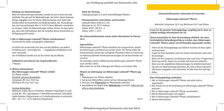 zur Verfügung gestellt von Gebrauchs.info Meldung von Nebenwirkungen Wenn Sie Nebenwirkungen bemerken, wenden Sie sich an Ihren Arzt oder Apotheker. Dies gilt auch für Nebenwirkungen, die nicht in dieser Packungs- beilage angegeben sind. Sie können Nebenwirkungen auch direkt dem Bundesinstitut für Arzneimittel und Medizinprodukte, Abt. Pharmakovigilanz, Kurt-Georg-Kiesinger-Allee 3, D-53175 Bonn, Webseite: www.bfarm. de anzeigen. Indem Sie Nebenwirkungen melden, können Sie dazu beitra- gen, dass mehr Informationen über die Sicherheit dieses Arzneimittels zur Verfügung gestellt werden. 5.Wie ist Hühneraugen Lebewohl® Pflaster aufzubewahren? Arzneimittel für Kinder unzugänglich aufbewahren. Sie dürfen das Arzneimittel nach dem auf dem Behältnis und äußerer Umhüllung nach „Verwendbar bis ...“ angegebenen Verfalldatum nicht mehr verwenden. Das Verfalldatum bezieht sich auf den letzten Tag des Monats. Haltbarkeit nach Anbruch des Siegelrandbeutels: 7 Monate. 6. Weitere Informationen Was Hühneraugen Lebewohl® Pflaster enthält: Ein Pflaster enthält: Arzneilich wirksame Bestandteile: Salicylsäure (Ph. Eur.) 19,25 mg Milchsäure (Ph. Eur.) 0,671 mg Sonstige Bestandteile: Wollwachs, Gelbes Wachs, Fichtenharz, Terpentin, Poly(ethylen-co-vinyl- acetat) (60 : 40), Copaivabalsam, Schwertlilienwurzelstock, Chlorophyll- Kupfer-Komplex, Poly[acrylsäure-co-(2-ethylhexyl)acrylat-co-vinylacetat] (68,1 : 26,1 : 5,1 : 0,15), hydriertes Kolophonium. Inhalt der Packung: Originalpackungen zu 4 und 8 wirkstoffhaltigen Pflastern. Pharmazeutischer Unternehmer und Hersteller: Lebewohl-Fabrik GmbH & Co. KG Bötzinger Str. 62, 79111 Freiburg Telefon: (0761) 790 912 - 0 Telefax: (0761) 7 74 91 Die Gebrauchsinformation wurde zuletzt überarbeitet im Februar 2014. Eigenschaften: Hühnenaugen Lebewohl® Pflaster bewähren sich ausgezeichnet, speziell bei Hühneraugen und Verhornung auf den Zehen. Der Filzring lindert die Druckschmerzen und der gut verträgliche Pflasterkern führt zur Erweichung vor Ablösung störender Hornhauteinwachsungen, die die Beschwerden verursachen. Ein vorheriges warmes Fußbad lässt das Hühneraugen Lebewohl® Pflaster noch schneller wirken. Bitte achten Sie vor dem Aufbringen des Pflasters auf trockene Füße. Hinweis zur Anbringung von Hühneraugen Lebewohl® Pflaster am Zeh: 1.Abdeckpapier vom Pflaster abziehen. 2.Den grünen Wirkstoffkern zentral auf das Hühnerauge fixieren. 3.Die kurze Seite (Fixierseite) der Pflasterbinde andrücken. 4.Anschließend das längere Ende (Wickelseite) umwickeln. Dabei den Zeh nicht zu stark einschnüren. Gebrauchsinformation: Information für Anwender Hühneraugen Lebewohl® Pflaster Wirkstoffe: Salicylsäure 19,25 mg, Milchsäure 0,671 mg/ Pflaster Dieses Arzneimittel ist ohne Verschreibung erhältlich. Um einen Lesen Sie die gesamte Packungsbeilage sorgfältig durch, denn sie enthält wichtige Informationen für Sie. bestmöglichen Behandlungserfolg zu erzielen, muss Hühneraugen Lebewohl® Pflaster jedoch vorschriftsmäßig angewendet werden. · Heben Sie die Packungsbeilage auf. Vielleicht möchten Sie diese später nochmals lesen. · Fragen Sie Ihren Apotheker, wenn Sie weitere Informationen oder einen Rat benötigen. · Wenn sich Ihre Symptome verschlimmern oder nach etwa 10 Tagen keine Besserung eintritt, müssen Sie auf jeden Fall einen Arzt aufsuchen. · Wenn eine der aufgeführten Nebenwirkungen Sie erheblich beeinträch tigt oder Sie Nebenwirkungen bemerken, die nicht in dieser Gebrauchs information angegeben sind, informieren Sie bitte Ihren Arzt oder Apo- theker. Diese Packungsbeilage beinhaltet: 1.Was ist Hühneraugen Lebewohl® Pflaster und wofür wird es angewendet? 2.Was müssen Sie vor der Anwendung von Hühneraugen Lebewohl® Pflaster beachten? 3.Wie ist Hühneraugen Lebewohl® Pflaster anzuwenden? 4.Welche Nebenwirkungen sind möglich? 5.Wie ist Hühneraugen Lebewohl® Pflaster aufzubewahren? 09.15 6.Weitere Informationen Aktualisierungsstand Gebrauchs.info Juni 2016 zur Verfügung gestellt von Gebrauchs.info 1.Was ist Hühneraugen Lebewohl® Pflaster und wofür wird es ange- wendet? Wollwachs kann örtlich begrenzte Hautreizungen (z. B. Kontaktdermati- tis) auslösen. Stoff- und Indikationsgruppe: Hühneraugen Lebewohl® Pflaster ist ein Hühneraugen und Verhornungen lösendes Mittel (Keratolytikum). Anwendungsgebiete: Zur Lösung von umschriebenen Verhornungen (Keratolyse), wie sie bei Hühneraugen und Schwielen vorkommen können. Bei Anwendung von Hühneraugen Lebewohl® Pflaster mit ande- ren Arzneimitteln: Salicylsäure kann die Durchlässigkeit der Haut für andere lokal angewendete Arzneimittel verstärken. Die durch die Haut aufgenommene Salicylsäure kann die unerwünschten Wirkungen von Methotrexat und die Blutzucker senkende Wirkung oraler Diabetika vom Sulfonharnstoff-Typ verstärken. 2.Was müssen Sie vor der Anwendung von Hühneraugen Lebewohl® Pflaster beachten? Hühneraugen Lebewohl® Pflaster darf nicht angewendet werden: - wenn Sie überempfindlich (allergisch) gegen Salicylsäure, Salicylate und Milchsäure oder einen der sonstigen Bestandteile von Hühnerau- gen Lebewohl® Pflaster sind. - bei Säuglingen und Kindern. - bei vorgeschädigter Haut (z. B. Entzündungen bei Wunden, Ekzemen). - bei Patienten mit eingeschränkter Nierenfunktion (Niereninsuffizienz). Hier sollte Hühneraugen Lebewohl® Pflaster nur nach strenger Indika- tionsstellung angewendet werden. Schwangerschaft und Stillzeit: Hühneraugen Lebewohl® Pflaster darf in der Schwangerschaft nur klein- flächig (kleiner als 5 cm²) angewendet werden. Hühneraugen Lebewohl® Pflaster darf nicht an der stillenden Brust ange- wendet werden. Die zufällige Aufnahme von Hühneraugen Lebewohl® Pflaster durch den Säugling durch Kontakt mit der behandelten Körper- stelle muss vermieden werden. Sollte der Arzt eine regelmäßige Behand- lung großer Hautflächen mit Hühneraugen Lebewohl® Pflaster für not wendig halten, so ist frühze