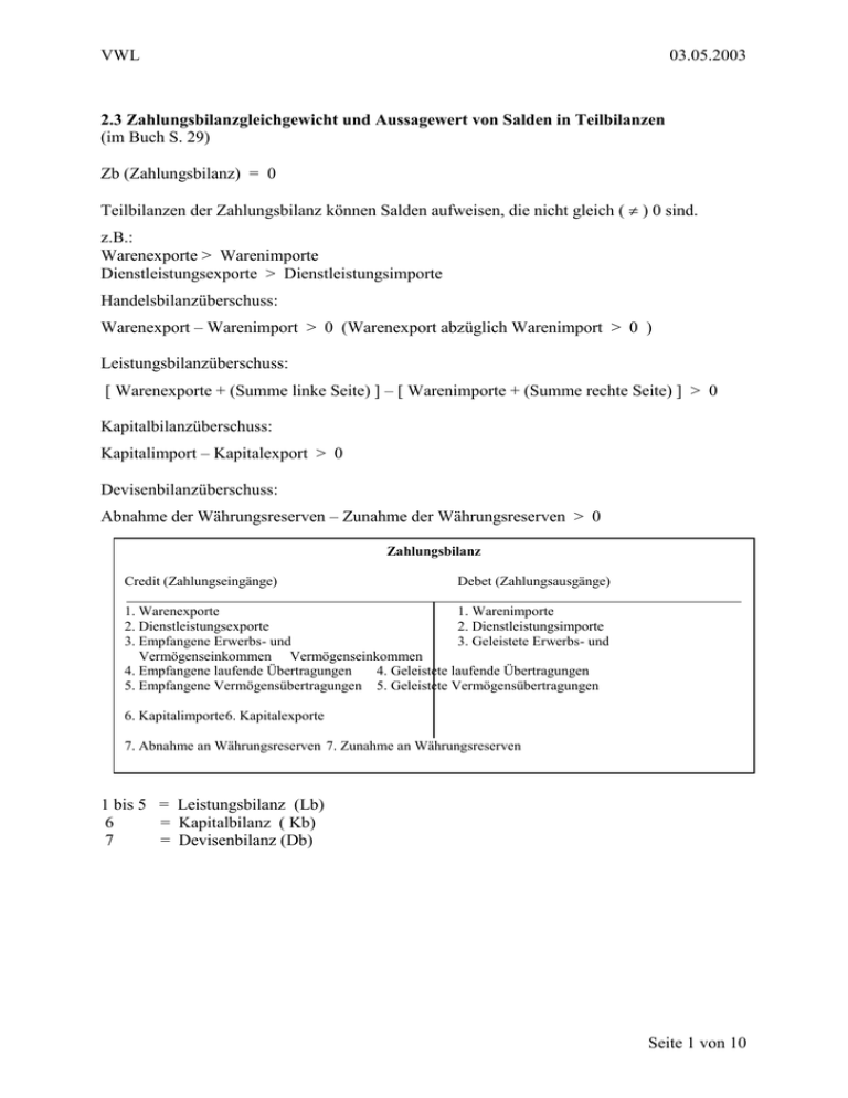 VWL 03.05.2003 2.3 Zahlungsbilanzgleichgewicht und Aussagewert von Salden in Teilbilanzen (im Buch S. 29) Zb (Zahlungsbilanz) = 0 Teilbilanzen der Zahlungsbilanz können Salden aufweisen, die nicht gleich ( ) 0 sind. z.B.: Warenexporte > Warenimporte Dienstleistungsexporte > Dienstleistungsimporte Handelsbilanzüberschuss: Warenexport – Warenimport > 0 (Warenexport abzüglich Warenimport > 0 ) Leistungsbilanzüberschuss: [ Warenexporte + (Summe linke Seite) ] – [ Warenimporte + (Summe rechte Seite) ] > 0 Kapitalbilanzüberschuss: Kapitalimport – Kapitalexport > 0 Devisenbilanzüberschuss: Abnahme der Währungsreserven – Zunahme der Währungsreserven > 0 Zahlungsbilanz Credit (Zahlungseingänge) Debet (Zahlungsausgänge) 1. Warenexporte 1. Warenimporte 2. Dienstleistungsexporte 2. Dienstleistungsimporte 3. Empfangene Erwerbs- und 3. Geleistete Erwerbs- und Vermögenseinkommen Vermögenseinkommen 4. Empfangene laufende Übertragungen 4. Geleistete laufende Übertragungen 5. Empfangene Vermögensübertragungen 5. Geleistete Vermögensübertragungen 6. Kapitalimporte 6. Kapitalexporte 7. Abnahme an Währungsreserven 7. Zunahme an Währungsreserven 1 bis 5 = Leistungsbilanz (Lb) 6 = Kapitalbilanz ( Kb) 7 = Devisenbilanz (Db) Seite 1 von 10 VWL 03.05.2003 2.4 Die Zahlungsbilanz der Bundesrepublik Deutschland Kapitalbilanzdefizit: Lb + Kb + Db + 100 + ( - 100) + 0 = 0 (sollte 0 sein) = 0 (Aufbau des Vermögens) Leistungsbilanzdefizit: Lb + Kb - 50 + 50 + Db = 0 (sollte 0 sein) + = 0 (Vermögen wird im Ausland aufgebaut) 0 (Abbau des Vermögens) Nettoauslandsaktiva – Nettoauslandsposition // negative Nettoauslandsposition // 2.4. Die Zb der BRD ( 4 ) = Saldo entstanden durch: z.B.: - Veränderung des Wechselkurses - Das Geld ins Ausland schmuggeln Spalte 4 Überschuss = Kapitalimport > als Kapitalexport Tabelle 2 – 1 / im Buch auf Seite 31 z.B.: 1997 Lb + - 2,4 + Kb 0 + + Db 3,4 = 0 BRD hat einen Lb-Defizit aufgewiesen. Würde finanziert durch den Abbau der Währungsreserven (Db) z.B.: 1998 Lb + - 5,6 + Kb (+0,7) + 8,7 + (- 0,2) Spalte (2) (3) (4) + + Db ( - 3,6) = 0 Lb-Defizit : Ausgleich durch Abbau der Kapitalreserven. (bei gleichzeitigem Devisen-Defizit) Laufende Übertragungen – Defizit: z.B. durch: - BRD leistet mehr an EU als es von EU an Leistungen zurückerhält. - Rentner leben im Ausland Handelsbilanz: Jahr 2002 starker Exportüberschuss Leistungen im Rahmen des EU-Haushalts Tabelle 2-2 (im Buch : Seite 32) Geleistete und empfangene Zahlungen Deutschlands im Rahmen der EU Seite 2 von 10 VWL 03.05.2003 2.5 Devisenmarkt und Wechselkurs Internationale Transaktionen, die sich in der Zahlungsbilanz niederschlagen, haben in der Regel zur Folge, dass inländische Währung gegen ausländische Währung getauscht wird. Wechselkursnotierung in der Tagespresse (FT Deutschland 15.10.2002) Tabelle 2-3 a Buch : Seite 33 Preisnotierung: Wert einer Auslandswährung in inländischer Währungseinheit. z.B.: aus europäischer Sicht: 1 $ (US) 1£ e Mengennotierung: = 0,9 € = 1,5 € Wert einer Einheit Inlandswährung in ausländischer Währungseinheit. z.B.: aus europäischer Sicht: e` 1€ 1 € = 1,11 $ (US) = 0,67 ₤ Preisnotierung: Aufwertung des € wenn (gleichbedeutend : ≙ Abwertung des US $ ) z.B.: von 1,11 $ á € auf 1,15 $ á € 1 e = e` 1 e` = e Ab 01.01.1999 gilt in Deutschland Mengennotierung. Was aus deutscher Sicht „Mengennotierung“ ist aus der USA-Sicht gleichzeitig „Preisnotierung“ Was aus der USA-Sicht „Mengennotierung“ ist aus deutscher Sicht gleichzeitig „Preisnotierung“ Kassamarkt : Anbieter und Nachfrager einigen sich auf einen bestimmten Kurs für einen festgelegten Betrag und tauschen die Wahrungen am zweiten Werktag nach Geschäftsabschluss aus. Terminmarkt: die Lieferung und Gegenleistung wird für einen späteren Zeitpunkt, z.B. nach einem Monat, oder bis zu sechs Monaten vereinbart. Angebot und Nachfrage bilden den Wechselkurs Exkurs Seite 3 von 10 VWL 03.05.2003 A G E N D A 2010 1. RV (Rentenversicherung) 2. KV (Krankenversicherung) 3. ALV (Arbeitslosenversicherung) (demographischer Faktor) Demographie: die Beschreibung des Zustandes und der Veränderung von Bevölkerung und Bevölkerungsteilen mit statistischen Methoden. Rentenversicherung Umlageverfahren: Einzahler (EZ) D e D m e D o m e D g o m e D rg o m e D a rg o m e p a rg o m h p a rg o ip h a re g ih p a re ih [ p a g ie r[h p g ie i[erh g ie c irhe[ g ic e [ re h s g ic [re h s g ic ] re h s ic ] d e h s c i] d h s e ic ] d s h e B c ]i e d h e B ]is e d c e B s ih e d c e rB is h e e c e rB is h e e b c ri B s u h [e e b c n rg iu s h g [re b c n ri g u h g [re d b rn g ic e u g re D e D m e D o m e g o m rg o a r g p ra h p a ih p e ih ie e So funktioniert das System Einzahler (EZ) So funktioniert das System nicht Leistungsempfänger (LE) D e D m e D o m e g o m rg o a rg p ra h p a ih p e ih e i[ Leistungsempfänger (LE) g e [ r ig [e r g i c re h ic e h s i c s h ic ] s h c ] d h i] d e i d e B i e e B s e c B s h e rc s h e [c ri g h e [rb rg iiu r[e b e n ig c u g [rb e h n g i D D e e m D m o e D o g m e D rg o m e rg a o m a p rg o p h a rg ih p a re ih p a e ih p e ih e i e Seite 4 von 10 VWL 03.05.2003 Variante: 1970 Kindheit Ausbildung Weiterbildung/Beruf/Familie Ausbildung Weiterbildung/Beruf/Familie Rente 2005 Kindheit Rente rush hour life Lösung: Kindheit Ausbildung Weiterbildung/Beruf/Familie Entweder 1. Erhöhung des Beitragssatzes Rente oder 2. Verschiebung des Renteneintrittsalters oder 3. Senkung des Renten-Niveaus Möglichkeiten : - Versicherungsfremde Leistungen - Umlaufverfahren - Kapitaldeckungsverfahren Zu Krankenversicherung Möglichkeiten um den Beitrag der Krankenversicherung zu senken: - Krankengeld aus dem Beitrag rausnehmen Entlastet: - Beitragszahler - Unternehmer - Umverteilung z.B.: Sozialhilfe Seite 5 von 10 VWL 03.05.2003 Im Buch: Seite 35 Kassamarkt Terminmarkt Zug um Zug-Abwicklung 2 Banktage sind zur Abwicklung erlaubt Abwicklung in der Zuku
