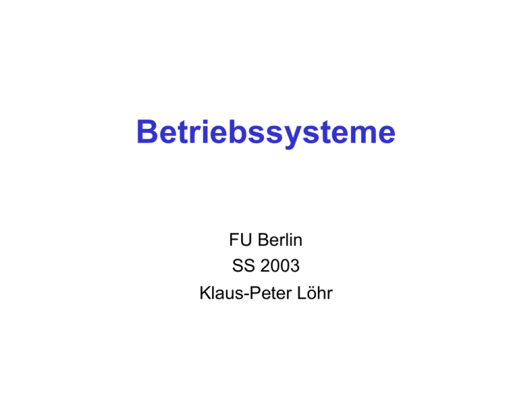 Betriebssysteme FU Berlin SS 2003 Klaus-Peter Löhr 1 Einführung Zur Erinnerung: Informatische Fachbegriffe in Deutsch und Englisch findet man unter http://www.babylonia.org.uk Software „zwischen Hardware und Umwelt“ eingebettete Systeme (embedded systems) geschlossene Anwendungssysteme Betriebssysteme + Anwendungsprogramme Transaktionssystem eingebettetes System Basissoftware Betriebssystem (operating system) Benachbarte Gebiete: • Rechnerarchitektur • Verteilte Systeme • Echtzeitsysteme • Systemsicherheit • Datenbanksysteme • Programmiersprachen & Übersetzer • Softwaretechnik Abgrenzung: Betriebssystem im engeren Sinn = System aus Sicht der Anwendungssoftware = Software zwischen der Hardware und der Systemschnittstelle (2) Betriebssystem im weiteren Sinn = System aus Sicht des Benutzers, d.h. zuzüglich Benutzerschnittstelle (9), Übersetzer, Dienstprogramme usw. Benutzerschnittstelle Anwendungssoftware Interaktionssystem Systemschnittstelle (Datenbanksystem, Middleware, .....) Betriebssystem Hardware Benutzerschnittstelle Anwendungssoftware Interaktionssystem Systemschnittstelle (Datenbanksystem, Middleware, .....) Betriebssystem Hardware auch „Systemsoftware“ Merke: Das Begriffspaar Systemsoftware – Anwendungssoftware (systems software – application software) ist unscharf, weil auf der Systemschnittstelle nicht nur Anwendungssoftware, sondern auch Systemerweiterungen aufgesetzt werden können. Grobe Klassifikation der Hardware: • Einprozessorsystem (uniprocessor) • Mehrprozessorsystem (multiprocessor) • Mehrrechnersystem (multicomputer) mit verteiltem Speicher verteiltes Betriebssystem • Rechnernetz (computer network) verteilte und/oder kooperierende Betriebssysteme Betriebsarten eines Rechners Einplatzsystem (single-user system) Einbenutzersystem (single-user system) Mehrplatzsystem (multi-user system) Teilhaberbetrieb (multi-access) Mehrbenutzersystem (multi-user system) interaktiv Stapelbetrieb (batch processing) Teilnehmerbetrieb (time-sharing) Betriebsarten eines Rechners Einplatzsystem (single-user system) Einbenutzersystem (single-user system) Mehrplatzsystem (multi-user system) Teilhaberbetrieb (multi-access) Mehrbenutzersystem (multi-user system) interaktiv Klient (client) Teilnehmerbetrieb (time-sharing) Stapelbetrieb (batch processing) Dienstanbieter (server) 1.1 Betriebsmittelverwaltung Hardware ist Konglomerat aus verschiedenen Betriebsmitteln (auch Ressourcen, engl. resources) wie z.B. Prozessoren, Speicher, Peripheriegeräte, Netzanschlüsse, ..... Aufgabe eines Betriebssystems ist, den Anwendungsprogrammen statt der realen Betriebsmittel virtuelle Betriebsmittel (virtual resources) zur Verfügung zu stellen (z.B. „virtueller Speicher“) mit den folgenden Eigenschaften: komfortabel – durch geeignet parametrisierte prozedurale Schnittstelle betriebssicher – gegenüber Hardware- und Software-Fehlern sowie böswilliger Manipulation effizient – bezüglich der realen Betriebsmittel 1.1.1 Prozeßverwaltung Betriebsmittel: Prozessor virtualisiert: Prozess (process, task) Verwandter Prozessbegriff bei nichtsequentieller Programmierung: Prozess = Programmteil, der unabhängig von den anderen Programmteilen ablaufen kann Genauer: leichtgewichtiger Prozess (lightweight process, thread) = virtueller Prozessor schwergewichtiger Prozess (heavyweight process) = virtueller Rechner (Prozessor + Speicher + Peripherie) Mehrprozessbetrieb (multiprogramming, multitasking): Anzahl der Prozesse ist nicht durch die Anzahl der Prozessoren beschränkt Mehrprozeßbetrieb (multiprogramming, multitasking): Anzahl der Prozesse ist nicht durch die Anzahl der Prozessoren beschränkt Schnappschuss der Prozessorzuordnung (processor allocation): Prozesse aktiv bereit wartend Prozessoren Die Zuordnung wechselt: „Multiplexen“ des Prozessors (processor multiplexing) Zustandsübergänge eines Prozesses p : (mit Operationen block/wake [siehe NSP, Probeklausur]) aktiv anderer Prozess macht block() bereit block() wartend wake(p) Die Zuordnung wechselt: „Multiplexen“ des Prozessors (processor multiplexing) Zustandsübergänge eines Prozesses p : (mit Operationen block/wake [siehe NSP, Probeklausur]) aktiv anderer Prozess macht block() block() wake(p) bereit wartend wake(p) falls aktiver Prozess verdrängt werden kann Warum Mehrprozessbetrieb? Teilnehmer- bzw. Server-Betrieb Effiziente Nutzung des Systems angesichts unterschiedlicher Ressourcen-Anforderungen verschiedener auszuführender Programme Beispiel: Software installieren Diskette Festplatte Drucker Dokument drucken ... und noch freie Prozessorkapazität für rechenintensives Programm im Hintergrund 1.1.2 Speicherverwaltung Betriebsmittel: Arbeitsspeicher/Adressraum virtualisiert: virtueller Adressraum (virtual address space) Von virtuellem Speicher (virtual memory) (5) spricht man, wenn der virtuelle Adressraum größer als der Arbeitsspeicher sein kann und teilweise auf Hintergrundspeicher ausgelagert werden kann. Schnappschuss der Speicherzuordnung (memory allocation): [Speicheralloziierung – falsche Übersetzung!] Virtuelle Adressräume der (schwergewichtigen) Prozesse Arbeitsspeicher Betriebssystem Multiplexen des Arbeitsspeichers durch Umlagerung (swapping) der Prozesse zwischen Arbeitsspeicher und Hintergrundspeicher Zustandsübergänge eines Prozesses: aktiv eingelagert ausgelagert bereit wartend 1.1.3 Dateiverwaltung Betriebsmittel: Langzeitspeicher (Platte, Band, ...) virtualisiert: Datei (file) = benanntes, persistentes Objekt a b c d e f g 1.1.4 Druckerverwaltung Betriebsmittel: reale Drucker virtualisiert: virtuelle Drucker Spooling Auf verschiedene Weise realisierbar, z.B. so: jeder Prozess besitzt einen eigenen virtuellen Drucker, auf dem er mit print(text) drucken kann. (Zwischenspeicherung der Ausgabe auf Hintergrundsp.!) Komfortabel und effizient 1.1.5 Weitere Peripherie Betriebsmittel: Bildschirm + Tastatur/Maus virtualisiert: Fenster Betriebsmittel: Netzanschluss virtualisiert: Por
