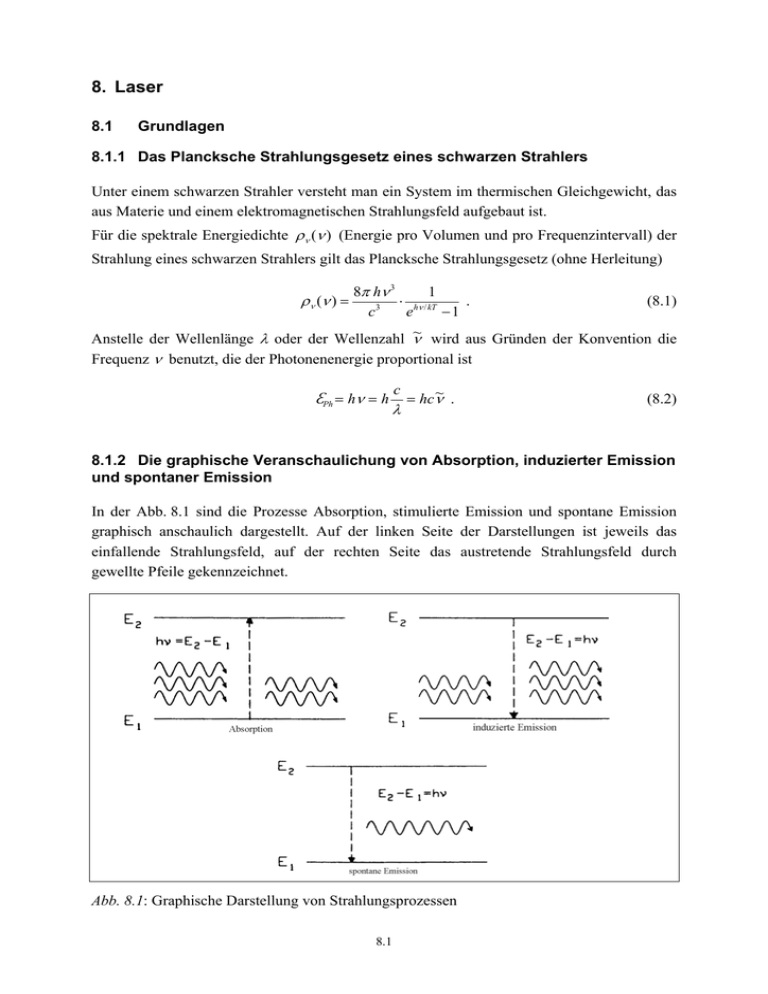 8. Laser 8.1 Grundlagen 8.1.1 Das Plancksche Strahlungsgesetz eines schwarzen Strahlers Unter einem schwarzen Strahler versteht man ein System im thermischen Gleichgewicht, das aus Materie und einem elektromagnetischen Strahlungsfeld aufgebaut ist. Für die spektrale Energiedichte ρ ν (ν ) (Energie pro Volumen und pro Frequenzintervall) der Strahlung eines schwarzen Strahlers gilt das Plancksche Strahlungsgesetz (ohne Herleitung) 8π hν 3 1 ⋅ hν / kT . (8.1) 3 c e −1 Anstelle der Wellenlänge λ oder der Wellenzahl ν~ wird aus Gründen der Konvention die Frequenz ν benutzt, die der Photonenenergie proportional ist ρ ν (ν ) = Ph = hν = h c λ = hc ν~ . (8.2) 8.1.2 Die graphische Veranschaulichung von Absorption, induzierter Emission und spontaner Emission In der Abb. 8.1 sind die Prozesse Absorption, stimulierte Emission und spontane Emission graphisch anschaulich dargestellt. Auf der linken Seite der Darstellungen ist jeweils das einfallende Strahlungsfeld, auf der rechten Seite das austretende Strahlungsfeld durch gewellte Pfeile gekennzeichnet. Abb. 8.1: Graphische Darstellung von Strahlungsprozessen 8.1 8.1.3 Die Einsteinkoeffizienten der (stimulierten) Absorption und der stimulierten Emission Für die Übergangsrate der Absorption gilt „Fermis Golden Rule“ (4.108) Wg → a = 2 2 dP(t ) π π = H 'ag ρ a ( a ) = E 0 ⋅ 〈ψ a | µˆ | ψ g 〉 ρ a ( a ) . dt 2= 2= (8.3) Der Index g steht für den Grundzustand (Ausgangszustand des Absorptionsprozesses), der Index a für den angeregten Zustand (Endzustand des Absorptionsprozesses). Zeigt die Lage der Moleküle keine Abhängigkeit von der Richtung (isotrope Orientierungsverteilung), so ergibt eine Mittelung über ein Ensemble von hinreichend vielen Molekülen E 0 ⋅ 〈ψ g | µˆ | ψ a 〉 2 m = E 0 ⋅ µ ag 2 m = E02 e ⋅ µ ag 2 m 1 = E02 µ ag 3 2 , (8.4) mit dem elektrischen Übergangsdipol µ ag = ψ g | µ |ψ a (8.5) E 0 = E0 ⋅ e , und (8.6) wobei e der Einsvektor in Richtung des elektrischen Feldes ist. Damit folgt aus (8.3) Wg→ a = π 6= 2 E02 µ ag ⋅ ρa ( a ) . (8.7) Um einen Zusammenhang mit der Energiedichte des Planckschen Strahlungsgesetzes herzustellen, wird unter Verwendung von (8.2) zuerst die auf Energieintervalle bezogene Zustandsdichte ρa ( a ) umgerechnet in eine auf Frequenzintervalle bezogene Zustandsdichte ρνa (ν ) 1 h ρa ( a ) d a = ρ νa (ν ) dν = ρ νa (ν ) ⋅ ⋅ d a und daraus ρ a ( a ) = ρ νa (ν ) ⋅ 1 . h (8.8) (8.9) Aus der klassischen Elektrodynamik folgt (ohne Herleitung) für das zeitliche Mittel der elektromagnetischen Energiedichte E m (Energie pro Volumen) im Vakuum E m = ε0 2 ⋅ E02 mit ε0 = 8,854 F m-1 der Permittivität des Vakuums. Mit (8.9) und (8.10) folgt aus (8.7) 8.2 (8.10) Wg→ a = E m ⋅ ρνa (ν ) ist gerade die 1 6 ε 0= 2 ⋅ µ ag ⋅ E 2 ρνa (ν ) . m elektromagnetische Energie (8.11) pro Volumen und pro Frequenzintervall und damit gerade die „spektrale Energiedichte“ ρ ν (ν ) aus dem Planckschen Strahlungsgesetz E m ρ νa (ν ) = ρ ν (ν ) . (8.12) Die Übergangsrate der Absorption kann dann mit (8.12) folgendermaßen dargestellt werden Wg→ a = Bga ⋅ ρ ν (ν ) , mit Bga = 1 6 ε 0= ⋅ µ ag 2 2 (8.13) . (8.14) Bga heißt Einsteinkoeffizient der Absorption. Mit den Indices „g“ und „a“ werden der Grundzustand beziehungsweise der angeregte Zustand bezeichnet. Analog zur stimulierten Absorption kann ein Strahlungsfeld auch eine stimulierte Emission bewirken. Voraussetzung dafür ist, dass sich das Molekül in einem angeregten Zustand mit der Energie a befindet. Durch das Strahlungsfeld geht das Molekül vom Zustand ψa in einen Grundzustand ψg über. Für die Übergangsrate gilt analog (8.13) Wa→ g = Bag ⋅ ρ ν (ν ) . (8.15) Demnach ist es grundsätzlich möglich das einfallende Strahlungsfeld zu verstärken. Die dem Strahlungsfeld durch die Verstärkung zugeführte Energie wird dem Molekül entzogen, das durch irgendeinen Prozess in den angeregten Ausgangszustand befördert wurde. Im Anhang P6 wird gezeigt, dass die Übergangsraten der Absorption und der induzierten Emission gleich sind, wenn es sich um die gleichen am Übergang beteiligten Zustände handelt. Daraus folgt Bga = Bag = 1 6 ε 0= 2 ⋅ µ ag 2 , (8.16) wobei Bag Einsteinkoeffizient der induzierten Emission heißt. Sind die an den stimulierten Übergängen beteiligten Zustände bezüglich der Energie entartet, so müssen die Entartungsgrade gg und ga in (8.16) berücksichtigt werden g g ⋅ Bga = ga ⋅ Bag . 8.3 (8.17) 8.1.4 Der Einsteinkoeffizient der spontanen Emission Es wird ein System aus Molekülen und einem Strahlungsfeld behandelt, das sich im thermischen Gleichgewicht befindet. Die Moleküle können zwei Zustände, den Grundzustand ψ g und den angeregten Zustand ψ a , einnehmen. Dieses Zweizustandsmodell ist in der Abb. 8.2 schematisch dargestellt. ψα Na stimulierte und spontane Emission Absorption ψg Ng Abb. 8.2: Zweiniveausystem mit Übergängen Im thermischen Gleichgewicht sind die Besetzungszahlen Ng und Na der beiden Zustände durch die Boltzmannsche Besetzungswahrscheinlichkeit gegeben (siehe Kap. 5.3). Im thermischen Gleichgewicht müssen weiterhin die Raten für die Absorptionsprozesse und die Emissionsprozesse gleich sein. Für das Besetzungsverhältnis gilt nach Boltzmann (5.1): RS T hν Na = exp − ag Ng kT UV , W (8.18) das im Grenzfall T → ∞ den maximalen Wert 1 annehmen kann. Bei endlichen Temperaturen gilt also Na <1 . Ng (8.19) N gWg→a = N g ⋅ Bga ⋅ ρνg (8.20) Die Rate der Absorption ist durch und die Rate der stimulierten Emission durch N aWast→.Eg. = N a ⋅ Bag ⋅ ρ νa 8.4 (8.21) gegeben. Wg→a ist die Übergangswahrscheinlichkeit der Absorption und Wast→.Eg. die Übergangs-wahrscheinlichkeit der stimulierten Emission. Die Energiedichten ρ νg und ρ va sind im wesentlichen durch die quantenelektrodynamischen Zustände des Strahlungsfeldes gegeben. Im thermischen Gleichgewicht i