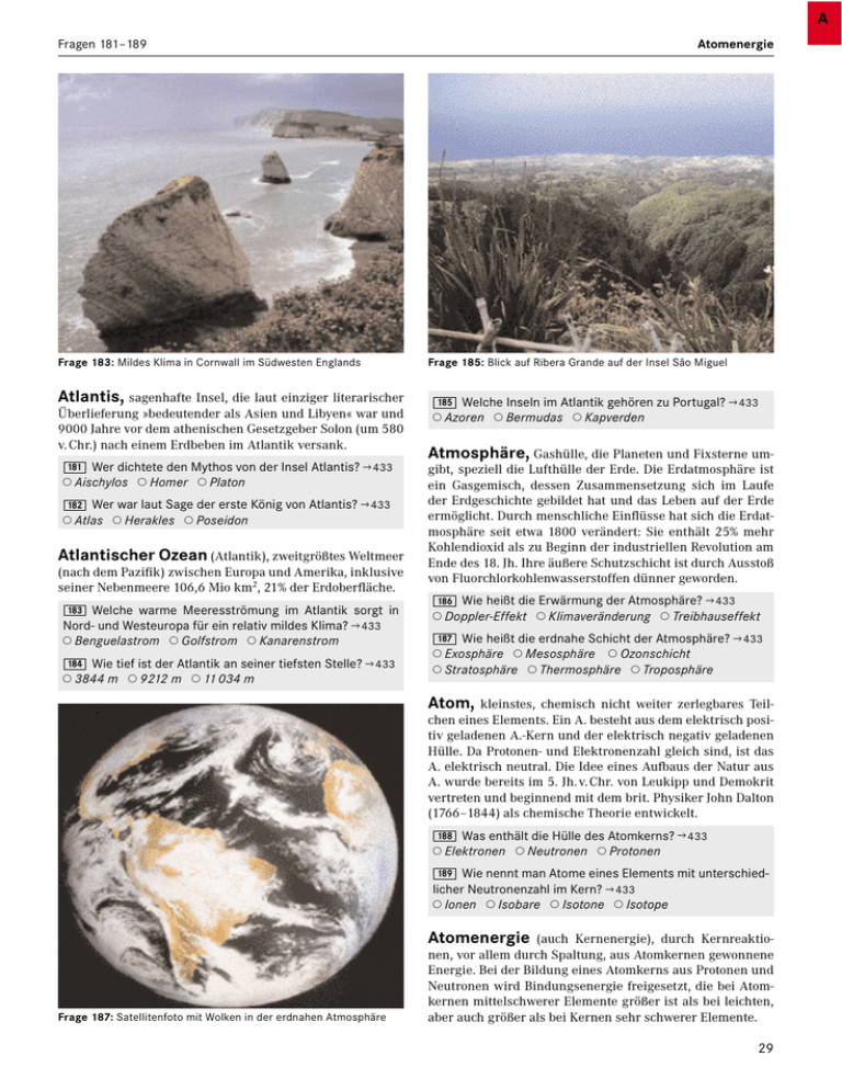 A Fragen 181–189 Frage 183: Mildes Klima in Cornwall im Südwesten Englands Atlantis, sagenhafte Insel, die laut einziger literarischer Überlieferung »bedeutender als Asien und Libyen« war und 9000 Jahre vor dem athenischen Gesetzgeber Solon (um 580 v. Chr.) nach einem Erdbeben im Atlantik versank. Wer dichtete den Mythos von der Insel Atlantis? 433 Aischylos Homer Platon 181 Wer war laut Sage der erste König von Atlantis? 433 Atlas Herakles Poseidon 182 Atlantischer Ozean (Atlantik), zweitgrößtes Weltmeer (nach dem Pazifik) zwischen Europa und Amerika, inklusive seiner Nebenmeere 106,6 Mio km2, 21% der Erdoberfläche. Welche warme Meeresströmung im Atlantik sorgt in Nord- und Westeuropa für ein relativ mildes Klima? 433 Benguelastrom Golfstrom Kanarenstrom 183 Wie tief ist der Atlantik an seiner tiefsten Stelle? 433 3844 m 9212 m 11 034 m 184 Atomenergie Frage 185: Blick auf Ribera Grande auf der Insel São Miguel Welche Inseln im Atlantik gehören zu Portugal? 433 Azoren Bermudas Kapverden 185 Atmosphäre, Gashülle, die Planeten und Fixsterne umgibt, speziell die Lufthülle der Erde. Die Erdatmosphäre ist ein Gasgemisch, dessen Zusammensetzung sich im Laufe der Erdgeschichte gebildet hat und das Leben auf der Erde ermöglicht. Durch menschliche Einflüsse hat sich die Erdatmosphäre seit etwa 1800 verändert: Sie enthält 25% mehr Kohlendioxid als zu Beginn der industriellen Revolution am Ende des 18. Jh. Ihre äußere Schutzschicht ist durch Ausstoß von Fluorchlorkohlenwasserstoffen dünner geworden. Wie heißt die Erwärmung der Atmosphäre? 433 Doppler-Effekt Klimaveränderung Treibhauseffekt 186 Wie heißt die erdnahe Schicht der Atmosphäre? 433 Exosphäre Mesosphäre Ozonschicht Stratosphäre Thermosphäre Troposphäre 187 Atom, kleinstes, chemisch nicht weiter zerlegbares Teilchen eines Elements. Ein A. besteht aus dem elektrisch positiv geladenen A.-Kern und der elektrisch negativ geladenen Hülle. Da Protonen- und Elektronenzahl gleich sind, ist das A. elektrisch neutral. Die Idee eines Aufbaus der Natur aus A. wurde bereits im 5. Jh. v. Chr. von Leukipp und Demokrit vertreten und beginnend mit dem brit. Physiker John Dalton (1766–1844) als chemische Theorie entwickelt. Was enthält die Hülle des Atomkerns? 433 Elektronen Neutronen Protonen 188 189 Wie nennt man Atome eines Elements mit unterschiedlicher Neutronenzahl im Kern? 433 Ionen Isobare Isotone Isotope Frage 187: Satellitenfoto mit Wolken in der erdnahen Atmosphäre Atomenergie (auch Kernenergie), durch Kernreaktionen, vor allem durch Spaltung, aus Atomkernen gewonnene Energie. Bei der Bildung eines Atomkerns aus Protonen und Neutronen wird Bindungsenergie freigesetzt, die bei Atomkernen mittelschwerer Elemente größer ist als bei leichten, aber auch größer als bei Kernen sehr schwerer Elemente. 29 A Atom Atlantis Antworten 181–189 29 Bermudainseln: Gruppe von ca. 360 Inseln im westlichen Nordatlantik, brit. Kronkolonie seit 1684. Kapverden: Vor der Westküste Afrikas gelegene Inselgruppe aus neun bewohnten und sechs unbewohnten Inseln. Ab 1460 von Portugiesen besiedelt. 1975 erklärte Kap Verde die Unabhängigkeit und wurde Republik. 181 Dichter des Mythos von der Insel Atlantis Platon (427–348/47 v. Chr.): Griech. Philosoph, lässt im Dialog »Kritias« den gleichnamigen athenischen Politiker über Geografie und Geschichte einer sagenhaften Insel namens Atlantis berichten, deren Bewohner durch die Seefahrt reich und überheblich wurden. Das Werk bricht mitten im Satz ab, Atlantis soll im Meer versunken sein. Steinskulptur des Platon Aischylos (525–456 v. Chr.): Griech. Dichter. Seine sieben erhaltenen Tragödien, darunter die »Orestie« (457), markieren den Beginn der tragischen Dichtung in Europa. Homer (8. Jh. v. Chr.): Griech. Dichter, erfand in dem Epos »Odyssee« die Gestalt des Odysseus. Atmosphäre 29 186 Erwärmung der Atmosphäre Treibhauseffekt: Anstieg der Temperatur in der Erdatmosphäre durch die vom Erdboden in Form von Wärme gespeicherte Sonnenstrahlung. Ohne den natürlichen Treibhauseffekt läge die Temperatur bei durchschnittlich –18 °C. Doppler-Effekt: Das von dem Physiker Christian Doppler (1803–1853) beschriebene Phänomen gilt als Ursache für die sich ändernde Tonhöhe bei sich bewegenden Tonquellen. Klimaveränderung: Die Veränderung des Klimas durch vom Menschen verursachte Erwärmung der Erdatmosphäre führt weltweit zu Dürren, Stürmen, Orkanen und Hochwasser. 187 Erdnahe Schicht der Atmosphäre 182 Erster König von Atlantis Atlas: Laut Platon der erste König von Atlantis. Nach ihm wurden (laug Dialog des Platon) die Insel Atlantis und das umgebende Meer »Atlantik« genannt. Herakles: Held der griech. Mythologie. Poseidon: In der griech. Mythologie der Gott des Meeres. Atlantischer Ozean 29 183 Warme Meeresströmung im Atlantik Golfstrom: Starke Oberflächenströmung im Nordatlantik. Der warme Golfstrom bildet sich nördlich der Bahamas aus dem Antillen- und dem Floridastrom und sorgt an den Westküsten des nördlichen Europa für ein mildes Klima. Benguelastrom: Kalte Meeresströmung im Südatlantik. Kanarenstrom: Kalte Strömung im Nordatlantik. 184 Tiefste Stelle des Atlantiks 9212 m: Milwaukeetiefe im Puerto-Rico-Graben. 3844 m: Mittlere Tiefe des Atlantischen Ozeans. 11 034 m: Tiefste Stelle des Pazifischen Ozeans. 185 Zu Portugal gehörende Atlantikinseln Azoren: Autonome portugies. Inselgruppe 1400 km westlich von Portugal im Nordatlantik. Die neun bewohnten Vulkaninseln ragen bis zu 2351 m auf. Antwort 187: Ozonloch in der Atmosphäre 2001 (l.) und 2002 (r.) Name Troposphäre Exosphäre Mesosphäre Ozonschicht Stratosphäre Thermosphäre Atom Höhe (km) Temperatur (°C) bis 11 ab 400 bis 80 bis 30 bis 50 bis 400 –40 bis +50 über 2000 –70 bis –10 –50 bis 0 –50 bis –10 –50 bis +1100 29 188 Inhalt der Atomkernhülle Elektronen: Elektrisch negativ geladene Teilchen, die in der Atomhülle um den Atomkern kreisen. Zahl und Anordnung b