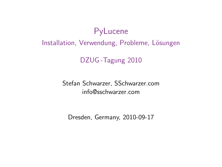 PyLucene Installation, Verwendung, Probleme, Lösungen DZUG -Tagung 2010 Stefan Schwarzer, SSchwarzer.com info@sschwarzer.com Dresden, Germany, 2010-09-17 Danke! Vortrag basiert auf einem PyLucene-Projekt für den Informationsdienst Wissenschaft e. V. (idw) http://idw-online.de Code im Vortrag stammt teilweise aus dem Projekt Verwendung mit freundlicher Genehmigung PyLucene Stefan Schwarzer, info@sschwarzer.com 2 / 28 Einführung Lucene Lucene ist ein Suchmaschinen-Framework geschrieben in Java verwendet ein eigenes Index-Format, also keine weitere Datenbank notwendig Prinzip: Dokumente im Index ablegen, später nach passenden Dokumenten suchen indizierte Dokumente bestehen aus Schlüssel-Wert-Paaren, Schlüssel immer Strings, Werte fast(?) immer sehr vielseitig boolsche Verknüpfungen (und, oder, nicht) Wildcards (Py*on) Phrase Search ("zusammengehörende Wörter") Fuzzy Search (ähnlich klingende Begriffe) Proximity Search (Wörter in der Nähe“) ” Hervorhebung von Treffern PyLucene Stefan Schwarzer, info@sschwarzer.com 3 / 28 Einführung Lucene-API API sehr umfangreich 1342 Java-Dateien, 953 Klassen, davon 83 abstrakt (in aktueller Version 3.0.2) zum Vergleich Standard-Bibliothek von Python 2.6.5: 3790 Python-Dateien, ca. 2040 Klassen also nicht pythonic“ ;-) ” Lucene-API ansprechbar aus CPython mit Hilfe von JCC → PyLucene PyLucene Stefan Schwarzer, info@sschwarzer.com 4 / 28 Einführung Lucene-API-Beispiel import lucene lucene.initVM() # Open index and search for the document with id 23. index = lucene.NIOFSDirectory( lucene.File(u"index_directory")) term = lucene.Term(u"id", u"23") term_query = lucene.TermQuery(term) searcher = lucene.IndexSearcher(index) # Expect just one document. top_docs = searcher.search(term_query, 1) docs = [searcher.doc(score_doc.doc) for score_doc in top_docs.scoreDocs] lucene_document = docs[0] PyLucene Stefan Schwarzer, info@sschwarzer.com 5 / 28 Installation Als vorbereitetes Paket aktuelles Windows-Binary unter http://code.google.com/p/pylucene-win32-binary auf anderen Plattformen teilweise sehr veraltet zum Beispiel in aktuellem Ubuntu-Linux 10.04: PyLucene 2.3.1 (aktuell ist 3.0.2, letzte 2er-Version ist 2.9.3) oft Installation aus Source-Code nötig PyLucene Stefan Schwarzer, info@sschwarzer.com 6 / 28 Installation Allgemeines Vorgehen siehe http://lucene.apache.org/pylucene/ documentation/install.html und http://lucene.apache.org/pylucene/jcc/ documentation/install.html PyLucene herunterladen von http://apache.abdaal.com/lucene/pylucene und auspacken in dieser Reihenfolge . . . JCC bauen und installieren benötigt Python, GNU Make und C++-Compiler Lucene bauen und installieren benötigt JDK und Ant (Java-Build-Tool) PyLucene Stefan Schwarzer, info@sschwarzer.com 7 / 28 Installation JCC bauen und installieren cd pylucene-3.0.2-1/jcc ggf. setup.py anpassen, insbesondere den Pfad für die eigene Plattform im Dictionary JDK python setup.py build falls eine Fehlermeldung kommt, dass kein Shared-Mode genutzt werden kann, als Workaround Umgebungsvariable NO SHARED auf 1 setzen und Build-Vorgang wiederholen (weitere Diskussion ggf. am Ende des Vortrags) mit Root-Rechten: python setup.py install PyLucene Stefan Schwarzer, info@sschwarzer.com 8 / 28 Installation Lucene bauen und installieren cd .. Makefile anpassen (zwingend notwendig) # Ubuntu Linux 8.10 64-bit, Python 2.5.2, OpenJDK ... #PREFIX PYTHON=/usr #ANT=ant #PYTHON=$(PREFIX PYTHON)/bin/python #JCC=$(PYTHON) -m jcc --shared #NUM FILES=2 PyLucene Stefan Schwarzer, info@sschwarzer.com 9 / 28 Installation Lucene bauen und installieren cd .. Makefile anpassen (zwingend notwendig) # meine Plattform, Python 2.5 #PREFIX PYTHON=/usr #ANT=ant #PYTHON=$(PREFIX PYTHON)/bin/python #JCC=$(PYTHON) -m jcc --shared #NUM FILES=2 PyLucene Stefan Schwarzer, info@sschwarzer.com 9 / 28 Installation Lucene bauen und installieren cd .. Makefile anpassen (zwingend notwendig) # meine Plattform, Python 2.5 PREFIX PYTHON=/usr ANT=ant PYTHON=$(PREFIX PYTHON)/bin/python JCC=$(PYTHON) -m jcc --shared NUM FILES=2 PyLucene Stefan Schwarzer, info@sschwarzer.com 9 / 28 Installation Lucene bauen und installieren cd .. Makefile anpassen (zwingend notwendig) # meine Plattform, Python 2.6 PREFIX PYTHON=/usr ANT=ant PYTHON=$(PREFIX PYTHON)/bin/python JCC=$(PYTHON) -m jcc. main --shared NUM FILES=2 PyLucene Stefan Schwarzer, info@sschwarzer.com 9 / 28 Installation Lucene bauen und installieren cd .. Makefile anpassen (zwingend notwendig) # meine Plattform, Python 2.7 PREFIX PYTHON=/usr ANT=ant PYTHON=$(PREFIX PYTHON)/bin/python JCC=$(PYTHON) -m jcc --shared NUM FILES=2 PyLucene Stefan Schwarzer, info@sschwarzer.com 9 / 28 Installation Lucene bauen und installieren cd .. Makefile anpassen (zwingend notwendig) # meine Plattform, Python 2.7 PREFIX PYTHON=/usr ANT=ant PYTHON=$(PREFIX PYTHON)/bin/python JCC=$(PYTHON) -m jcc --shared # ggf. entfernen NUM FILES=2 PyLucene Stefan Schwarzer, info@sschwarzer.com 9 / 28 Installation Lucene bauen und installieren cd .. Makefile anpassen (zwingend notwendig) # meine Plattform, Python 2.7 PREFIX PYTHON=/usr ANT=ant PYTHON=$(PREFIX PYTHON)/bin/python JCC=$(PYTHON) -m jcc --shared NUM FILES=2 gmake mit Root-Rechten: gmake install PyLucene Stefan Schwarzer, info@sschwarzer.com 9 / 28 Verwendung Allgemeines API-Dokumentation http://lucene.apache.org/java/3_0_2/api/all/ index.html PyLucene-Beispiele http://svn.apache.org/viewvc/lucene/pylucene/ trunk/samples/ für die Lucene-API nur Unicode verwenden, keine Bytestrings Lucene-Dokumente bestehen aus Feldern (Feldname, Wert) Feldnamen sind immer Zeichenketten Werte meistens praktischerweise auch (NumericFields lassen sich anscheinend mit PyLucene setzen, aber nicht auslesen) PyLucene Stefan Schwarzer, info@sschwarzer.com 10 / 28 Verwendung Feldeigenschaften Beim Anlegen von Feldern können verschiedene Eigenschaften angegeben werden. Stored: Das Feld ist in einem Lucene-Dokument enthalten und kann mit diesem aus dem Index geholt werden. Ein Feld kan