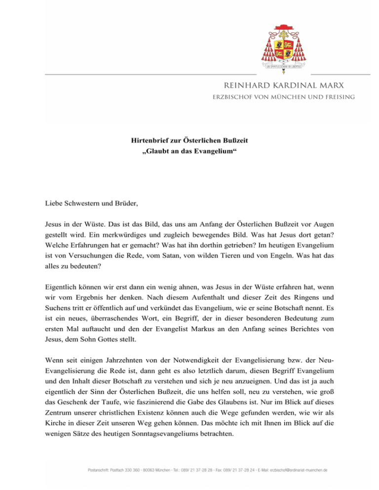 Hirtenbrief zur Österlichen Bußzeit „Glaubt an das Evangelium“ Liebe Schwestern und Brüder, Jesus in der Wüste. Das ist das Bild, das uns am Anfang der Österlichen Bußzeit vor Augen gestellt wird. Ein merkwürdiges und zugleich bewegendes Bild. Was hat Jesus dort getan? Welche Erfahrungen hat er gemacht? Was hat ihn dorthin getrieben? Im heutigen Evangelium ist von Versuchungen die Rede, vom Satan, von wilden Tieren und von Engeln. Was hat das alles zu bedeuten? Eigentlich können wir erst dann ein wenig ahnen, was Jesus in der Wüste erfahren hat, wenn wir vom Ergebnis her denken. Nach diesem Aufenthalt und dieser Zeit des Ringens und Suchens tritt er öffentlich auf und verkündet das Evangelium, wie er seine Botschaft nennt. Es ist ein neues, überraschendes Wort, ein Begriff, der in dieser besonderen Bedeutung zum ersten Mal auftaucht und den der Evangelist Markus an den Anfang seines Berichtes von Jesus, dem Sohn Gottes stellt. Wenn seit einigen Jahrzehnten von der Notwendigkeit der Evangelisierung bzw. der NeuEvangelisierung die Rede ist, dann geht es also letztlich darum, diesen Begriff Evangelium und den Inhalt dieser Botschaft zu verstehen und sich je neu anzueignen. Und das ist ja auch eigentlich der Sinn der Österlichen Bußzeit, die uns helfen soll, neu zu verstehen, wie groß das Geschenk der Taufe, wie faszinierend die Gabe des Glaubens ist. Nur im Blick auf dieses Zentrum unserer christlichen Existenz können auch die Wege gefunden werden, wie wir als Kirche in dieser Zeit unseren Weg gehen können. Das möchte ich mit Ihnen im Blick auf die wenigen Sätze des heutigen Sonntagsevangeliums betrachten. Offensichtlich hat Jesus in der Wüste so etwas wie einen Durchbruch erlebt. Er hat eine Erfahrung gemacht, die ihm einen völlig neuen Blick auf Gott und das Leben der Menschen geschenkt hat. In der Einsamkeit des Suchens und Betens wird ihm klar, dass von der Wirklichkeit Gottes anders, neu gesprochen werden muss, und genau das zeigt sich dann in seiner Verkündigung und in seinem Handeln. In vier Gedanken fasst der Evangelist Markus diese ursprüngliche und historisch greifbare Predigt zusammen. Diese Punkte bleiben auch für die heutige Evangelisierung maßgeblich. 1. Die Zeit ist erfüllt Jesus hat erfahren und macht nun in seiner Predigt deutlich, dass die Geschichte Gottes mit den Menschen in seiner Person und seiner Verkündigung den entscheidenden Zielpunkt erreicht hat. Im Christusereignis wird endgültig aufgedeckt und sichtbar, was Gott uns mitteilen möchte und wozu er uns einlädt. Das bedeutet, dass die gesamte Geschichte und auch meine persönliche Biografie Maß und Orientierung finden in den Worten und der Person Jesu von Nazareth. Das eigentlich Neue wird nicht irgendwann geschichtlich erreicht, sondern ist schon jetzt mitten in unserer Welt sichtbar und erfahrbar. In die Geschichte der Menschheit und in meine persönliche Lebensgeschichte ist also ein Sinn eingestiftet, sozusagen eine Zielmarke, die im Gesicht Jesu von Nazareth aufleuchtet. Das heißt aber auch, dass Jesus mit seinen Worten, seinem Leben, seinem Sterben und seiner Auferstehung uns hier und jetzt gegenwärtig ist. Wir sprechen nicht von vergangenen Ereignissen, sondern von einer Wirklichkeit, die mitgeht und Gegenwart ist. Deshalb darf das Leben der Kirche und die Verkündigung des Evangeliums nie „aus der Zeit herausfallen“. Das meinen wir, wenn wir von der notwendigen Zeitgenossenschaft der Christen reden, die mitten in ihrer jeweiligen Kultur, ihrer jeweiligen Epoche leben. Zeitgenossenschaft in diesem Sinne heißt nicht, sich der Welt und den Zeitströmungen anzupassen, sondern inmitten der Zeit die „Fülle der Zeit“ zu bezeugen, aber eben so, dass die Menschen von heute diese Botschaft verstehen können. Die Botschaft Jesu ist ja nicht veraltet und in verstaubten Büchern abgelegt, sondern lebendige Wirklichkeit und nur durch Zeuginnen und Zeugen hier und jetzt erfahrbar und verstehbar. 2. Das Reich Gottes ist nah Das Wort „Reich Gottes“ ist ein Schlüsselbegriff in der Verkündigung Jesu. Es geht ihm letztlich um die Frage: Ist der geheimnisvolle Gott Abrahams, Isaaks und Jakobs, der Schöpfer des Himmels und der Erde für uns Menschen zugänglich? Jesus wehrt sich gegen die Vorstellung, man könne Gott erreichen, also sein Reich gewinnen durch persönliche, moralische Anstrengungen oder durch die Durchsetzung eines politischen Projektes. Diese Ideen, die es durchaus zu seiner Zeit gibt, lehnt er ab. Für ihn ist das Reich Gottes, die Wirklichkeit Gottes, ein Geschenk. Gott ist zugänglich, weil er sich aus freier Liebe öffnen und verschenken will. Gott ist da und ermöglicht die Begegnung mit ihm in der Person Jesu Christi. Das Reich Gottes ist für Jesus keine abgehobene Wirklichkeit, sondern mitten in der Welt und in unseren realen Lebensbezügen erfahrbar. Für ihn ist klar: Das Reich Gottes, also die Wirklichkeit Gottes ist nicht fern, sondern zum Greifen nah. Wir müssen nur die Augen aufmachen und unsere Ohren aufsperren. Es gibt keine Barriere, die den Zugang zu Gott verwehren könnte. Jesus dreht sozusagen Indikativ und Imperativ um. Für ihn gilt nicht: Erst wenn wir gut sind, ist Gott auch gut zu uns, sondern umgekehrt: Gott ist gut und er schenkt sich in seiner Liebe, und deshalb können auch wir gut werden. 3. Kehrt um Bewusst steht der Umkehrruf in der Predigt Jesu an dieser Stelle. Es heißt eben nicht: kehrt um und dann wird euch das Reich Gottes nahe kommen, sondern: das Reich Gottes ist da, dreht euch doch um, um es zu sehen. Nehmt eine neue Sichtweise an, öffnet euch für neue Horizonte, lasst euch anziehen und umwandeln durch diese überwältigende Wirklichkeit der Nähe Gottes. Umkehr meint hier nicht vor allem moralische Anstrengung, sondern die Bereitschaft, sich verwandeln zu lassen, indem man bewusst ein neues Koordinatensystem für sein Leben annimmt. Man könnte sagen: es ist das Jawort zum Leben in einem Magnetfeld, das Gott heißt. 
