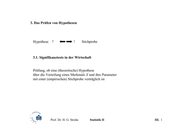 3. Das Prüfen von Hypothesen Hypothese ? ! Stichprobe 3.1. Signifikanztests in der Wirtschaft Prüfung, ob eine (theoretische) Hypothese über die Verteilung eines Merkmals X und ihre Parameter mit einer (empirischen) Stichprobe verträglich ist Prof. Dr. H. G. Strohe Statistik II III. 1 3.1. Signifikanztests in der Wirtschaft (II) Theorie Vermutung Wunsch Befürchtung ...... ...... Hypothese aufstellen Zufallsstichprobe Hypothese prüfen Prof. Dr. H. G. Strohe Statistik II III. 2 3.1. Signifikanztests in der Wirtschaft (III) Ablehnung, wenn Stichprobe „signifikant“, d.h. mehr als zufällig, von der Hypothese abweicht Nichtablehnung, bei kleineren Abweichungen, d.h. „Zufall” wird unterstellt „Nichtablehnung“ heißt nicht „Annahme“ der Hypothese Prof. Dr. H. G. Strohe Statistik II III. 3 3.1. Signifikanztests in der Wirtschaft (IV) Beispiel: Bierabfüllanlage a) Füllmenge X Verdacht: nicht korrekt Wahrer Mittelwert µ unbekannt, aber Nennfüllmenge µ0= 500 ml Hypothesenpaar Nullhypothese Alternativhyp. H0: µ = µ0 (hier Forderung) H1: µ ≠ µ0 (hier Verdacht) Prof. Dr. H. G. Strohe Statistik II III. 4 3.1. Signifikanztests in der Wirtschaft (V) noch Beispiel: Überprüfung mit Zufallsstichprobe: Durchschnitt x aus Zufallsstichprobe Ablehnung von H0 z.B., wenn x − µ 0 „zu groß“ Was heißt "zu"? (= “signifikant”) Prof. Dr. H. G. Strohe Statistik II III. 5 3.1. Signifikanztests in der Wirtschaft (VI) Vorgabe des Signifikanzniveaus α. Bei Ablehnung der Nullhypothese Irrtum höchstens mit der Wahrscheinlichkeit α zulässig, d.h. Alternativhypothese mit Sicherheit von mindestens 1- α wahr Prof. Dr. H. G. Strohe Statistik II III. 6 3. 2. Hypothesen über Durchschnitte 3.2.1 Einstichproben-Gauß-Test Hypothese über den Mittelwert eines Merkmals X anhand einer Zufallsstichprobe (X1,...,Xn) bei bekannter Streuung σ. Nullhypothese H 0 : µ = µ0 Alternativhypothese H1: µ ≠ µ0 Vorläufige Forderung: X ~ N(µ,σ2) Prof. Dr. H. G. Strohe Statistik II III. 7 3. 2. Hypothesen über Durchschnitte (II) Aus Schätztheorie bekannt: Konfidenzintervall: z1−α ⋅ σ z1−α ⋅ σ ⎛ ⎜ 2 2 ≤µ<X + P⎜ X − n n ⎝ ⎞ ⎟ = 1 − ........ ⎟ ⎠ ⎛ ⎞ gleichbedeutend: P⎜ X − µ ........ ≤ z α ⎟ = 1 − α ⎜ σ 1− ⎟ ⎝ 2⎠ Z Prof. Dr. H. G. Strohe Statistik II III. 8 3. 2. Hypothesen über Durchschnitte (III) Wenn H0 stimmt, dann ist µ = µ0, und Testvariable Z= X − µ0 σ Prof. Dr. H. G. Strohe n standardnormalverteilt Statistik II III. 9 3. 2. Hypothesen über Durchschnitte (IV) und dann müsste sein: ⎞ ⎛ ⎜ P⎜ | Z |≤ z α ⎟⎟ = 1 − α 1− ⎝ 2 ⎠ 1-" "/2 -z1-"/2 0 "/2 z1-"/2 Z Andernfalls stimmt vielleicht H0 nicht. Also: H0 ablehnen, wenn ⏐z⏐>z...... (Ablehnungsbereich) Prof. Dr. H. G. Strohe Statistik II III. 10 3. 2. Hypothesen über Durchschnitte (V) Beispiel a) (Fortsetzung): Abfüllmenge normalverteilt mit σ = 1,5 ml, H 0 : µ = µ0 H1 : µ ≠ µ0 (Verdacht falscher Abfüllung) α = 0,01 (vorher festlegen) Tafel: z1-1/2 = 2,58 Zufallsstichprobe: n = 25 ergibt x = 499,28ml Prof. Dr. H. G. Strohe Statistik II III. 11 3. 2. Hypothesen über Durchschnitte (VI) noch Beispiel noch a) z= x − µ0 σ n = −2,4 |z| = 2,4 < 2,58 ⇒ .......... Ablehnung von H..... Interpretation! Gründe? Prof. Dr. H. G. Strohe Statistik II III. 12 3. 2. Hypothesen über Durchschnitte (VII) Vielleicht Frage H0: µ ≤ µ0 interessanter Aber unhandlich, warum? Also weiter: H0: µ = µ0 Jedoch jetzt H1 : µ > µ0 Testvariable wieder Z= rechtsseitiger Test X − µ0 Prof. Dr. H. G. Strohe σ n Statistik II III. 13 3. 2. Hypothesen über Durchschnitte (VIII) Wenn H0 stimmt, müsste gelten: 1-" P(Z ≤ z1−α ) = 1 − α " z 1-" Z Also H0 ablehnen, wenn Z > z1-α d. h. bei großem Ein kleines x. x stört Ho nicht. Prof. Dr. H. G. Strohe Statistik II III. 14 3. 2. Hypothesen über Durchschnitte (IX) Beispiel b) Produzent will nachweisen, dass nicht zu wenig in den Flaschen ist: H0 : µ = µ0 (Eigentlich µ # µ0) H1: µ > µ0 (Behauptung) α=1% Prof. Dr. H. G. Strohe Statistik II III. 15 3. 2. Hypothesen über Durchschnitte (X) noch Beispiel b) Stichprobe wie a) (darf man eigentlich nicht nehmen): x = 499,28 ml z = -2,4 Tafel: z1-α = 2,326 ⇒ ..........Ablehnung von H0 : µ ≤ µ0 Interpretation? Prof. Dr. H. G. Strohe Statistik II III. 16 3. 2. Hypothesen über Durchschnitte (XI) Dritte Möglichkeit: H0: µ ≥ µ0 Praktisch gleichbedeutend: H0 : µ = µ0 H1 : µ < µ0 linksseitiger Test ⎞ ⎛ X − µ0 n ≤ zα ⎟ = α Wenn H0 stimmt, dann gilt: P⎜ ⎝ σ ⎠ warum? Hilfe: zα = -z1-α Prof. Dr. H. G. Strohe Statistik II III. 17 3. 2. Hypothesen über Durchschnitte (XII) 99% Umgekehrt P(Z > − z1−α ) = 1 − α 1% H0 ablehnen, wenn Testvariable Z= X − µ0 σ 1-" " -z1-" z1-" Z n ≤ − z1−α also bei kleinem x Prof. Dr. H. G. Strohe Statistik II III. 18 3. 2. Hypothesen über Durchschnitte (XIII) Beispiel c) Verbraucherverband will nachweisen, dass zu wenig in den Flaschen ist. H0: µ = µ0 (eigentlich µ ≥ µ0 ) H1: µ < µ0 (Behauptung) Stichprobe wie im Beispiel a): x = 499,28 ml ; z = -2,4 ; 1- α = 0,99 ; z1-α = 2,326 ; zα = -2,326 − 2.4 < −2.326 H0 .?. abzulehnen Was sagt Verbraucherverband?? Übung: bei α = 5%? Prof. Dr. H. G. Strohe Statistik II III. 19 3. 2. Hypothesen über Durchschnitte (XIV) Gaußtest kurz: Große Stichprobe oder Normalverteilung, Varianz bekannt. Nullhypothese H0: µ=µ0 1. Alternativhypothese H1: ... a) Zweiseitig: µ ≠ µ0 b) einseitig µ > µ0 c) µ < µ0 “ Prof. Dr. H. G. Strohe H0?? Statistik II III. 20 3. 2. Hypothesen über Durchschnitte (XV) 2. α ⇒ z1-α/2 bzw. z1- α 3. Stichprobe ⇒ x ⇒ Testvariablenwert z 4. Ablehnung von H0 , wenn a) | z | > z1-α /2 b) z > z1-α c) z < -z1-α Prof. Dr. H. G. Strohe Statistik II III. 21 Analyse der Nichtablehnung Beispiel a) Mögliche Ursachen ?? 1. Nullhypothese stimmt 2. Nullhypothese stimmt nicht, aber ?? 3. … (Achtu