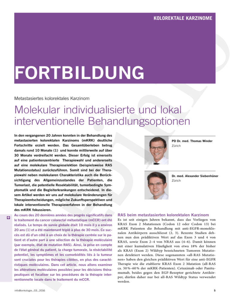Kolorektale karzinome FORTBILDUNG Metastasiertes kolorektales Karzinom Molekular individualisierte und lokal interventionelle Behandlungsoptionen In den vergangenen 20 Jahren konnten in der Behandlung des metastasierten kolorektalen Karzinoms (mKRK) deutliche Fortschritte erzielt werden. Das Gesamtüberleben betrug damals rund 10 Monate (1) und konnte mittlerweile auf über 30 Monate verdreifacht werden. Dieser Erfolg ist einerseits auf eine patientenzentrierte Therapiewahl und andererseits auf eine molekulare Therapieselektion (beispielsweise RAS Mutationsstatus) zurückzuführen. Somit sind bei der Therapiewahl neben molekularen Charakteristika auch die Berücksichtigung des Allgemeinzustandes der Patienten, die Tumorlast, die potentielle Resektabilität, tumorbedingte Symptomatik und die Begleiterkrankungen entscheidend. In diesem Artikel werden wir uns auf molekulare Veränderungen für Therapieentscheidungen, mögliche Zukunftsperspektiven und lokale interventionelle Therapieverfahren in der Behandlung des mKRK fokussieren. B Au cours des 20 dernières années des progrès significatifs dans le traitement du cancer colorectal métastatique (mCCR) ont été réalisés. Le temps de survie globale était 10 mois il y a environ 20 ans (1) et a été maintenant triplé à plus de 30 mois. Ce succès est dû d’un côté à un choix de la thérapie centrée sur le patient et d’autre part à une sélection de la thérapie moléculaire (par exemple, état de mutation RAS). Ainsi, la prise en compte de l'état général du patient, la charge tumorale, la réséctabilité potentiel, les symptômes et les comorbidités liés à la tumeur sont cruciales pour les thérapies ciblées, en plus des caractéristiques moléculaires. Dans cet article, nous allons examiner les altérations moléculaires possibles pour les décisions thérapeutiques et focaliser sur les procédures de la thérapie interventionnelle locale dans le traitement du mCCR. info@onkologie _ 03 _ 2016 PD Dr. med. Thomas Winder Zürich Dr. med. Alexander Siebenhüner Zürich RAS beim metastasierten kolorektalen Karzinom Es ist seit einigen Jahren bekannt, dass das Vorliegen von KRAS Exon 2 Mutationen (Codon 12 oder Codon 13) bei mKRK Patienten die Behandlung mit anti-EGFR-monoklonalen Antikörpern ausschliesst (2, 3). Rezente Studien dehnen nun den prädiktiven Wert auf das Exon 3 und 4 von KRAS, sowie Exon 2–4 von NRAS aus (4–6). Damit können mit einer kumulativen Häufigkeit von etwa 18% der bisher als KRAS (Exon 2) Wildtyp bezeichneten Tumoren Mutationen detektiert werden. Diese sogenannten «all-RAS Mutationen» haben den gleichen prädiktiven Wert für eine anti-EGFR Therapie wie die etablierte KRAS Exon 2 Mutation (all-RAS ca. 50 %–60 % der mKRK-Patienten). Cetuximab oder Panitumumab, beides gegen den EGF-Rezeptor gerichtete Antikörper, dürfen daher nur bei all-RAS Wildtyp Status verwendet ­werden. 5 FORTBILDUNG · schwerpunkt HER2 beim metastasierten kolorektalen Karzinom Die selektive BRAF Inhibition mittels Tyrosinkinaseinhibitoren war beim mKRK im Vergleich zum Melanom leider nicht erfolgreich. Die biologische Rationale für die fehlende Wirksamkeit ist der paradoxe Wegfall eines hemmenden Rückkoppelungsmechansimus an den EGF-Rezeptor durch die Behandlung mit BRAF Tyrosinkinaseinhibitoren. Daraus resultiert eine alternative Aktivierung des EGFR Signaltransduktionsweges (beispielsweise RAS oder PI3K). Dies führt zu einer gesteigerte Proliferation trotz bzw. gerade wegen BRAF-Inhibition (Bild 1A+B). Eine Pilotstudie konnte jedoch mittels Kombination eines EGFR Inhibitors (Panitumumab) mit einem BRAF Inhibitor (Vemurafenib) erste klinische Erfolge erzielen(9). Ein Therapieansprechen konnte in 10 von 12 Patienten verzeichnet werden, was auf eine biologische Wirksamkeit der Kombinationstherapie hindeutet. Eine weitere Studie hat die Kombination von Dabrafenib, einem selektiven BRAF Inhibitor, in Kombination mit Trametinib, einem selektiven MEK Inhibitor, bei 43 Patienten mit BRAF V600E mutiertem mKRK geprüft (10). Hierbei zeigt sich eine Krankheitsstabilisierung bei 56% der Patienten. Diese frühen klinischen Studien zeigen eine biologische Wirksamkeit und könnten ein erster Schritt in Richtung zielgerichteter Behandlung BRAF mutierter mKRK sein. BRAF V600E mutierte KRK besitzen darüber hinaus eine charakteristische Genexpressionssignatur. Die Signatur kann jedoch auch in einigen Patienten ohne Vorliegen der BRAF V600E Mutation nachgewiesen werden. Dieses Patientenkollektiv wird als «BRAFlike» KRK bezeichnet und macht rund 20 % der KRK aus. Vecchione et al. konnten erstmals in einer präklinischen Arbeit zeigen, dass in dieser Subgruppe die Expression von RANBP2 essentiell für das Überleben der BRAF-like KRK ist. Durch Herabregulation von RANBP2 kommt es aufgrund des direkten Einflusses auf das Mikrotubuli-System zu mitotischen Defekten und zum Zelltod der BRAF-like KRK (11). In vitro und in vivo Modelle konnten in weiterer Folge erstmals zeigen, dass das Spindelgift Vinorelbin Sartori-Bianchi et al. haben kürzlich die anti-Tumor Aktivität von Trastuzumab und Lapatinib bei therapierefraktärem, KRAS exon2 wild-type, HER2 positivem mKRK untersucht (HERACLES Studie) (7). Im Rahmen dieser Phase II Studie wurden 914 KRAS Exon 2 wild-type mKRK Patienten hinsichtlich der HER2 Expression untersucht. Die HER2 Positivität wurde durch Immunhistochemie 3+ oder 2+ und FISH Positivität (HER2:CEP17 >2) in über 50% der Tumorzellen anhand der HERACLES Diagnosekriterien festgelegt. Es konnten 48 Patienten (5%) mit HER2 positiven Tumoren identifiziert werden. 27 Patienten qualifizierten sich schlussendlich für die Studie. Bei diesem massiv vorbehandelten Kollektiv konnte bei 30% der Patienten ein Ansprechen und bei 59% eine Krankheitsstabilisierung durch die Kombination mit Trastuzumab und Lapatinib erzielt werden. Trotz der geringen Fallzahl konnte erstmals eine Wirksamkeit dieser Kombination bei stark vorbehandel