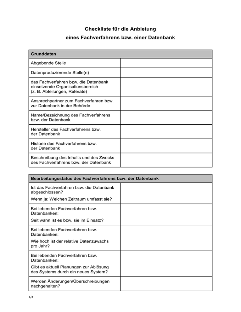 Checkliste für die Anbietung eines Fachverfahrens bzw. einer Datenbank Grunddaten Abgebende Stelle Datenproduzierende Stelle(n) das Fachverfahren bzw. die Datenbank einsetzende Organisationsbereich (z. B. Abteilungen, Referate) Ansprechpartner zum Fachverfahren bzw. zur Datenbank in der Behörde Name/Bezeichnung des Fachverfahrens bzw. der Datenbank Hersteller des Fachverfahrens bzw. der Datenbank Historie des Fachverfahrens bzw. der Datenbank Beschreibung des Inhalts und des Zwecks des Fachverfahrens bzw. der Datenbank Bearbeitungsstatus des Fachverfahrens bzw. der Datenbank Ist das Fachverfahren bzw. die Datenbank abgeschlossen? Wenn ja: Welchen Zeitraum umfasst sie? Bei lebenden Fachverfahren bzw. Datenbanken: Seit wann ist es bzw. sie im Einsatz? Bei lebenden Fachverfahren bzw. Datenbanken: Wie hoch ist der relative Datenzuwachs pro Jahr? Bei lebenden Fachverfahren bzw. Datenbanken: Gibt es aktuell Planungen zur Ablösung des Systems durch ein neues System? Werden Änderungen/Überschreibungen nachgehalten? 1/4 + Rechtliche Aspekte Hat die abgebende Stelle die volle Verfügungsgewalt über das Fachverfahren bzw. die Datenbank? Wenn nein: Welche zusätzlichen Stellen sind zu berücksichtigen? Welche archivrechtlichen Besonderheiten sind zu beachten? Gibt es sonstige rechtliche Besonderheiten (z. B. Geheimschutz, Datenschutz und Urheberrechte) sind zu beachten? Wenn ja: Welche? Technische Beschreibung Art der Datenbank/Bezeichnung des Datenbanksystems Versionsnummer der Ursprungsdatenbank Betriebssystem des Ursprungssystems Anzahl der Tabellen Größe in MB (mit Datum!) Liegt Applikationslogik in der Datenbank? (Kurzbeschreibung) Liegen BLOBs (Binary Large Objects, häufig Bild- oder Audiodateien) in der Datenbank? (Kurzbeschreibung) Liegen CLOBs (Character Large Objects, ähnlich BLOBs, aber Text- statt Binärdaten) in der Datenbank? Wenn ja: Welche? Gibt es Verweise/Links auf Dateien oder Anwendungen außerhalb des Datenbanksystems? Wenn ja: Welche? 2/4 Dokumentation Liegt eine Dokumentation des Fachverfahrens bzw. der Datenbank vor? In welcher Form (z. B. ERM-Diagramm, Beschreibung der Tabellen)? Gibt es ein Benutzerhandbuch für das Fachverfahren bzw. die Datenbank oder entsprechende Dokumente? Welche zusätzlichen Dokumentationsformen sind vorhanden oder könnten für das langfristige Verständnis des Fachverfahrens bzw. der Datenbank notwendig sein (z. B. Screenshots)? Codelisten Sind die Inhalte des Fachverfahrens bzw. der Datenbank (teilweise) codiert? Wenn ja: Welche Inhalte sind betroffen? Welche Codelisten werden in welcher Version (Datierung!) im Fachverfahren bzw. in der Datenbank verwendet? Liegen Codelisten innerhalb des Fachverfahrens bzw. der Datenbank? Gibt es auch Codelisten außerhalb des Fachverfahrens bzw. der Datenbank in separaten Dateien? Handelt es sich um statische Codelisten oder um Listen, die regelmäßigen Veränderungen unterliegen? Werden weitere allgemeingültige Codes verwendet, die an anderen öffentlich zugänglichen Orten liegen (z. B. Amtlicher Gemeindeschlüssel)? Kann die Codierung mittels Codelisten bei einem Export aufgelöst werden? 3/4 Übernahme des Fachverfahrens bzw. der Datenbank Ist ein Zugriff vor Ort möglich/notwendig? Ist eine Übernahme über das Landesverwaltungsnetz möglich? Kann das Fachverfahren bzw. die Datenbank auf CD bzw. DVD oder einem anderen Datenträger übergeben werden? 4/4