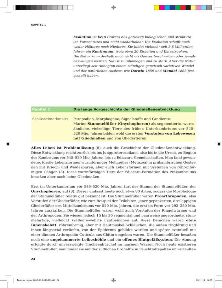 KAPITEL 1 Evolution ist kein Prozess des gezielten biologischen und strukturalen Fortschrittes und nicht wiederholbar. Die Evolution schafft auch weder Höheres noch Niederes. Sie bildet vielmehr seit 3,8 Milliarden Jahren ein Kontinuum, trotz etwa 20 Eiszeiten und Katastrophen. Die Natur kann deshalb auch nicht als Ganzes beschrieben oder jemals bezwungen werden. Sie ist zu inhomogen und zu stark. Aber die Natur unterliegt seit Anbeginn einem ständigen genetisch-variativen Wandel und der natürlichen Auslese, wie Darwin 1859 und Mendel 1865 festgestellt haben. Kapitel 1: Die lange Vorgeschichte der Gliedmaßenentwicklung Schlüsselmerkmale: Parapodien, Morphogene, Signalstoffe und Gradiente. Marine Stummelfüßer (Onychophoren) als segmentierte, wurm­ ähnliche, vielzellige Tiere des frühen Unterkambriums vor 545– 520 Mio. Jahren bilden wohl die ersten Vorstufen von Lebewesen mit Gliedmaßen und von Gliedertieren. Alles Leben ist Problemlösung (8), auch die Geschichte der Gliedmaßenentwicklung. Diese Entwicklung reicht zurück bis ins Jungproterozoikum, also bis in die Urzeit, zu Beginn des Kambriums vor 545–520 Mio. Jahren, bis zu Ediacara-Gemeinschaften. Man fand gewundene, fossile Lebensformen wurmförmiger Mehrzeller (Metazoa) in präkambrischen Gesteinen mit Kriech- und Weidespuren, aber auch Lebensformen mit Systemen von röhrenför­ migen Gängen (3). Diese wurmförmigen Tiere der Ediacara-Formation des Präkambriums besaßen aber noch keine Gliedmaßen. Erst im Unterkambrium vor 545–520 Mio. Jahren trat der Stamm der Stummelfüßer, der Onychophoren, auf (3). Dieser umfasst heute noch etwa 80 Arten, sodass die Morphologie der Stummelfüßer relativ gut bekannt ist. Die Stummelfüßer waren Proarthropoden, also Vorstufen der Gliederfüßer, wie zum Beispiel der Trilobiten, jener gepanzerten, dreilappigen Gliederfüßer des Mittelkambriums vor 520 Mio. Jahren, die erst im Perm vor 292–250 Mio. Jahren ausstarben. Die Stummelfüßer waren wohl auch Vorstufen der Ringelwürmer und der Arthropoden. Sie wiesen jedoch 15 bis 30 segmental und paarweise angeordnete, stummelartige, vielleicht krallenbewehrte Laufbeinchen auf; diese Beinchen waren ohne Innenskelett, röhrenförmig, aber mit Hautmuskel-Schläuchen, die außen ringförmig und innen längsaxial verliefen, von der Epidermis gebildet wurden und später eventuell mit einer dünnen Arthropodin-Cuticula aus Chitin umgeben waren. Die Stummelfüßer besaßen noch eine ungekammerte Leibeshöhle und ein offenes Blutgefäßsystem. Die Atmung erfolgte durch unverzweigte Tracheenbüschel im marinen Wasser. Noch heute existieren Stummelfüßer, man findet sie auf der südlichen Erdhälfte in Feuchtluftspalten im verfaulten 24 Teubner Layout 2013-11-05 END.indd 24 05.11.13 14:20 DIE LANGE VORGESCHICHTE DER GLIEDMASSEN-ENTWICKLUNG Heuboden (9). Wohl schon damals ernährten sie sich räuberisch von Algen und fotosynthetisierenden Protocisten, die sich vor etwa einer Milliarde Jahren entwickelt hatten. Die Stummelfüßer zählen damit zu den frühesten Tierformen überhaupt und vereinten in ihrer Organisation Anneliden- (Ringelwürmer-) und Arthropodenmerkmale der späteren Gliedertiere, die dann 14 bis 43 stummelartige Laufbeinchen, segmentiert und paarig angeordnet, aufwiesen. Die Stummelfüßer besaßen also noch keine Gliedmaßen, sondern Parapodien, beinähnliche Strukturen (Abb. 2, 3). Solche Parapodien wurden auch im Burgess-Schiefer des Kambriums vor 545– 495 Mio. Jahren gefunden, dort auch benthonisch mit Borsten (6), bei skurril anmutenden Lebewesen, die wenig oder überhaupt nicht schwimmen konnten und als Sedimentfresser oder Aasfresser am Meeresboden lebten (Abb. 3). Wir stehen also am Anfang der Entwicklung. Aber diese präkambrischen Proarthropoden leisteten bereits nichtzufällige, systemische und stabile Bewegungen, die sich als Abdruck auf Fossilien nachweisen lassen. Sie waren es wohl, die die Lokomotion einführten. Ihre ersten Ansätze von Extremitäten koordinierten sie über ein paariges Oberschlundganglion und zwei ventral-seitlich verlaufende Ganglien­stränge mit zahlreichen Kommissuren (3 und 10), dennoch handelt es sich bei ihnen immer noch um Weichtiere. Abb. 2: Ein Stamm vielzelliger Metazoa auf dem Weg zu Gliedmaßen ONYCHOPHOREN: Aus dem Stamm der Proarthropoda aus dem Unterkambrium vor 545 Mio. Jahren sind Übergangsformen zwischen Würmern und Gliederfüßern (Arthropoden) hervorgegangen, die segmentiert waren, wohl erste innervierte Extremitäten aufwiesen und sehr kleine Linsenaugen hatten. Ihre Extremitäten waren bilateral-symmetrisch angeordnete 14 bis 43 Paare stummelartiger, krallenbewehrter Laufbeinchen in einem Muskelschlauch aus Epidermis und dünner Arthropodin-Cuticula aus Chitin. Schematische Darstellung eines Onychophoren (Stamm Proarthropoda) vor 545–520 Mio. Jahren. Noch heute existieren 80 Arten von Onychophoren, die räuberisch in Feuchtluftspalten des Bodens und im Mulm leben und fast nur auf der südlichen Erdhälfte zu finden sind (9). 25 Teubner Layout 2013-11-05 END.indd 25 05.11.13 14:20 KAPITEL 1 Die Onychophoren des Unterkambriums vor 545–520 Mio. Jahren waren aber schon Bilateralia, im Embryonalstadium dreischichtig mit Ektoderm, Mesoderm und Entoderm, mit durchgehendem Darm vom Mund bis zum Anus. Sie waren Urformen, eine Art rundlicher Flachwurm mit einer deutlichen Ausprägung von Vorn und Hinten, Oben und Unten, die durch Gene, Signalstoffe und Gradienten der dorso-ventralen Achse über das Decapentaplegic-Gen (Dpp-Gen) (7) ausgelöst wurde. Das Dpp-Gen ist ein dorso-ventraler Gradient, ein Morphogen bei Larven, Fliegen und auch Wirbeltieren, das die dorso-ventrale Achse bestimmt. Das Dpp-Gen kodiert ein Protein, das zu den wichtigsten und weitverbreitetsten Wachstumsfaktoren gehört, das BMP (bone morphogenetic protein), das auch beim Gliedmaßenwachstum der Vertebraten eine Rolle spielt (7). Eine weitere gewichtige Gen-Gruppe der Onychophoren stellen die Hox