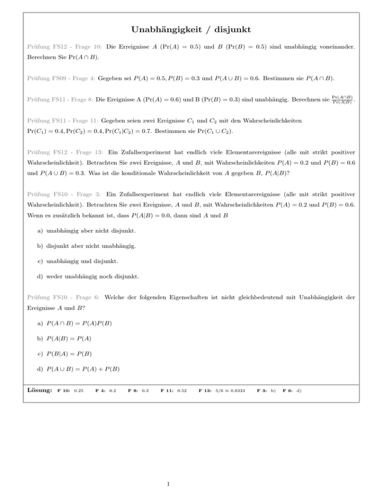 Unabhängigkeit / disjunkt Prüfung FS12 - Frage 10: Die Erreignisse A (Pr(A) = 0.5) und B (Pr(B) = 0.5) sind unabhängig voneinander. Berechnen Sie Pr(A ∩ B). Prüfung FS09 - Frage 4: Gegeben sei P (A) = 0.5, P (B) = 0.3 und P (A ∪ B) = 0.6. Bestimmen sie P (A ∩ B). Prüfung FS11 - Frage 8: Die Ereignisse A (Pr(A) = 0.6) und B (Pr(B) = 0.3) sind unabhängig. Berechnen sie Pr(A∩B) Pr(A|B) . Prüfung FS11 - Frage 11: Gegeben seien zwei Ereignisse C1 und C2 mit den Wahrscheinlichkeiten Pr(C1 ) = 0.4, Pr(C2 ) = 0.4, Pr(C1 |C2 ) = 0.7. Bestimmen sie Pr(C1 ∪ C2 ). Prüfung FS12 - Frage 13: Ein Zufallsexperiment hat endlich viele Elementarereignisse (alle mit strikt positiver Wahrscheinlichkeit). Betrachten Sie zwei Ereignisse, A und B, mit Wahrscheinlichkeiten P (A) = 0.2 und P (B) = 0.6 und P (A ∪ B) = 0.3. Was ist die konditionale Wahrscheinlichkeit von A gegeben B, P (A|B)? Prüfung FS10 - Frage 3: Ein Zufallsexperiment hat endlich viele Elementarereignisse (alle mit strikt positiver Wahrscheinlichkeit). Betrachten Sie zwei Ereignisse, A und B, mit Wahrscheinlichkeiten P (A) = 0.2 und P (B) = 0.6. Wenn es zusätzlich bekannt ist, dass P (A|B) = 0.0, dann sind A und B a) unabhängig aber nicht disjunkt. b) disjunkt aber nicht unabhängig. c) unabhängig und disjunkt. d) weder unabhängig noch disjunkt. Prüfung FS10 - Frage 6: Welche der folgenden Eigenschaften ist nicht gleichbedeutend mit Unabhängigkeit der Ereignisse A und B? a) P (A ∩ B) = P (A)P (B) b) P (A|B) = P (A) c) P (B|A) = P (B) d) P (A ∪ B) = P (A) + P (B) Lösung: F 10: 0.25 F 4: 0.2 F 8: 0.3 F 11: 0.52 1 F 13: 5/6 ≈ 0.8333 F 3: b) F 6: d) Bedingte W’keit Prüfung FS12 - Frage 15: Sie wollen testen, ob ein Student des Wirtschaftsstudiums fähig ist. Sie wissen, dass in der Bevölkerung 5% tauglich sind (P (A) = 0.05). Sie lassen einen Einstufungstest schreiben, der in 70% der Fälle einen tauglichen Student als tauglich klassifiziert (P (B|A) = 0.7) und in 30% einen untauglichen als tauglich klassifiziert (P (B|Ac ) = 0.3, wobei Ac das Komplement beschreibt). Wie hoch ist die Wahrscheinlichkeit, dass ein als tauglich eingestufter Student tatsächlich tauglich ist (P (A|B))? Prüfung FS11 - Frage 14: Angenommen, die Wahrscheinlichkeit, dass sich im Korb eines Pilzsammlers giftige Pilze befinden, betrage 50%. Man weiss, dass der Verzehr solcher Pilze in 60% aller Fälle zu Beschwerden führt. Im Durchschnitt treten nach 30% aller Pilz-Mahlzeiten Beschwerden auf. Was ist dann die Wahrscheinlichkeit, dass sich in der Mahlzeit des Sammlers giftige Pilze befanden, wenn er danach keine Beschwerden hatte? (Bei der Anagabe in %, %-Zeichen nicht vergessen.) Prüfung FS12 - Frage 16: Nehmen Sie an, dass die Wahrscheinlichkeit eines positiven Dopingtestes 90% betrage, wenn der untersuchte Sportler gedopt hat. Falls der Sportler nicht gedopt hat, betrage die Wahrscheinlichkeit eines positiven Befundes 10%. Weiter wissen Sie, dass die Wahrscheinlichkeit eines positiven Befundes unter allen Sportlern 50% betrage. Berechnen Sie mit diesen Angaben den Anteil an gedopten Sportlern in der Population. Prüfung FS11 - Frage 13: In der Zeitung steht, dass die Wahrscheinlichkeit tatsächlich gedopt zu sein, gegeben dass der erste Doping-Test positiv ausfällt, 60% beträgt. Weiter wissen sie, dass der erste Test in jedem Fall positiv ausfällt, wenn der Sportler gedopt ist. In 10% der Fälle ist der erste Test positiv, wenn der Sportler nicht gedopt ist. Berechnen sie unter diesen Annahmen den Anteil der gedopter Sportler. (Bei der Angabe in Prozent, das %-Zeichen nicht vergessen.) Lösung: F 15: 7/64=0.109375 F 14: 0.286 F 16: 0.5=50% 2 F 13: 0.13 diskrete Verteilungens Prüfung FS09 - Frage 8: Sei X eine diskrete Zufallsvariable mit folgender Verteilung: E(X) beträgt? PrüfungFS10 - Frage 5: Gegeben sei folgende Wahrscheinlichkeitsfunktion einer diskreten Zufallsvariablen X x/15 für x = 1, 2, 3, 4, 5 f (x) = 0 sonst Dann ist P (1 < X ≤ 3)? Prüfung FS10 - Frage 4: Die Variable X nimmt die Werte 1,2,3 mit je einer Wahrscheinlichkeit von 1/3 an. Was ist die Varianz von X? Prüfung FS09 - Frage 7: Die Varianz der Bernoulli-Verteilung beträgt: a) π b) 1 − π c) (1 − π)2 d) π − π 2 Prüfung FS10 - Frage 11: Gegeben sind folgende Dichtefunktionen der beiden Zufallsvariablen X und Y Die Dichte der beiden Zufallsvariablen ausserhalb des Intervalls (0,10) beträgt 0. Welche der folgenden Aussagen ist richtig? a) E(X) > E(Y ) und E(Y ) > Median(Y ). b) E(X) < E(Y ) und E(Y ) > Median(Y ). c) E(X) > E(Y ) und E(Y ) < Median(Y ). d) E(X) < E(Y ) und E(Y ) < Median(Y ). Lösung: F 8: 2.3 F 5: 1/3 oder 0.33 F 4: 2/3 oder 0.67 3 F 7: d) F 11: a) stetige Zufallsgrössen Prüfung FS12 - Frage 18: Die Dichtefunktion einer stetigen Zufallsvariable sei charakterisiert durch folgende Gleichung: f (x) = 0.1 + ax für 0 ≤ x ≤ 2 0 sonst, wobei a eine Konstante ist. Berechnen Sie a, so dass eine gültige Dichtefunktion entsteht. Prüfung FS11 0.5 f (x) = 0.25 0 - Frage 16: Berechnen sie den Erwartungswert der Zufallsvariablen X, wobei f ür 0 ≤ x ≤ 1 für 2 ≤ x ≤ 4 sonst PrüfungFS10 - Frage 8: Eine stetige Zufallsvariable X hat die folgende Dichtefunktion: c(1 − x2 ) falls −1 ≤ x ≤ 1 f (x) = 0 sonst wobei c eine gewisse Konstante ist. Gesucht ist die Wahrscheinlichkeit P (X ≤ 0.5). PrüfungFS09 - Frage 9: Sei X eine stetige Zufallsvariable mit 2x für 0 ≤ x ≤ 1 f (x) = 0 sonst P (X < 0.5) beträgt? Prüfung FS12 - Frage 19: Sei X eine stetige Zufallsvariable mit f (x) = 0.5 für −2 ≤ x ≤ 0 0 sonst Weiter sei Y = 5 − 3X. Berechnen Sie den Erwartungswert von Y . Prüfung FS09 - Frage 11: Sei X ∼ N (1, 25), (V ar(X) = 25). Wie lautet die Verteilung von Y = 5X + 5? a) Y ∼ N (5, 25) b) Y ∼ N (10, 25) c) Y ∼ N (10, 125) d) Y ∼ N (10, 625) Lösung: F 18: 0.4 F 16: 1.75 F 8: 27/32 oder 0.84 4 F 9: 0.25 F 19: 8 F 11: d) CLT / z-Wert Probetest 2 FS09 - Frage 15: In einem bestimmte Spiel werden zwei W