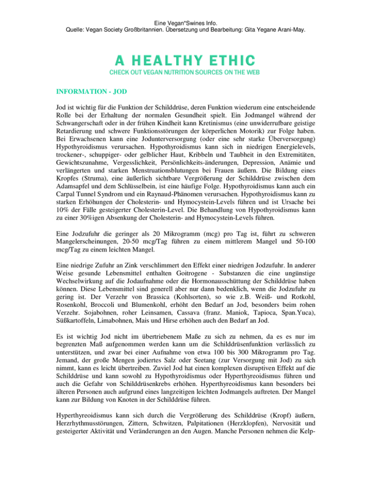 Eine Vegan*Swines Info. Quelle: Vegan Society Großbritannien. Übersetzung und Bearbeitung: Gita Yegane Arani-May. INFORMATION - JOD Jod ist wichtig für die Funktion der Schilddrüse, deren Funktion wiederum eine entscheidende Rolle bei der Erhaltung der normalen Gesundheit spielt. Ein Jodmangel während der Schwangerschaft oder in der frühen Kindheit kann Kretinismus (eine unwiderrufbare geistige Retardierung und schwere Funktionsstörungen der körperlichen Motorik) zur Folge haben. Bei Erwachsenen kann eine Jodunterversorgung (oder eine sehr starke Überversorgung) Hypothyroidismus verursachen. Hypothyroidismus kann sich in niedrigen Energielevels, trockener-, schuppiger- oder gelblicher Haut, Kribbeln und Taubheit in den Extremitäten, Gewichtszunahme, Vergesslichkeit, Persönlichkeits-änderungen, Depression, Anämie und verlängerten und starken Menstruationsblutungen bei Frauen äußern. Die Bildung eines Kropfes (Struma), eine äußerlich sichtbare Vergrößerung der Schilddrüse zwischen dem Adamsapfel und dem Schlüsselbein, ist eine häufige Folge. Hypothyroidismus kann auch ein Carpal Tunnel Syndrom und ein Raynaud-Phänomen verursachen. Hypothyroidismus kann zu starken Erhöhungen der Cholesterin- und Hymocystein-Levels führen und ist Ursache bei 10% der Fälle gesteigerter Cholesterin-Level. Die Behandlung von Hypothyroidismus kann zu einer 30%igen Absenkung der Cholesterin- and Hymocystein-Levels führen. Eine Jodzufuhr die geringer als 20 Mikrogramm (mcg) pro Tag ist, führt zu schweren Mangelerscheinungen, 20-50 mcg/Tag führen zu einem mittlerem Mangel und 50-100 mcg/Tag zu einem leichten Mangel. Eine niedrige Zufuhr an Zink verschlimmert den Effekt einer niedrigen Jodzufuhr. In anderer Weise gesunde Lebensmittel enthalten Goitrogene - Substanzen die eine ungünstige Wechselwirkung auf die Jodaufnahme oder die Hormonausschüttung der Schilddrüse haben können. Diese Lebensmittel sind generell aber nur dann bedenklich, wenn die Jodzufuhr zu gering ist. Der Verzehr von Brassica (Kohlsorten), so wie z.B. Weiß- und Rotkohl, Rosenkohl, Broccoli und Blumenkohl, erhöht den Bedarf an Jod, besonders beim rohen Verzehr. Sojabohnen, roher Leinsamen, Cassava (franz. Maniok, Tapioca, Span.Yuca), Süßkartoffeln, Limabohnen, Mais und Hirse erhöhen auch den Bedarf an Jod. Es ist wichtig Jod nicht im übertriebenem Maße zu sich zu nehmen, da es es nur im begrenzten Maß aufgenommen werden kann um die Schilddrüsenfunktion verlässlich zu unterstützen, und zwar bei einer Aufnahme von etwa 100 bis 300 Mikrogramm pro Tag. Jemand, der große Mengen jodiertes Salz oder Seetang (zur Versorgung mit Jod) zu sich nimmt, kann es leicht übertreiben. Zuviel Jod hat einen komplexen disruptiven Effekt auf die Schilddrüse und kann sowohl zu Hypothyroidismus oder Hyperthyreoidismus führen und auch die Gefahr von Schilddrüsenkrebs erhöhen. Hyperthyreoidismus kann besonders bei älteren Personen auch aufgrund eines langzeitigen leichten Jodmangels auftreten. Der Mangel kann zur Bildung von Knoten in der Schilddrüse führen. Hyperthyreoidismus kann sich durch die Vergrößerung des Schilddrüse (Kropf) äußern, Herzrhythmusstörungen, Zittern, Schwitzen, Palpitationen (Herzklopfen), Nervosität und gesteigerter Aktivität und Veränderungen an den Augen. Manche Personen nehmen die Kelp- Eine Vegan*Swines Info. Quelle: Vegan Society Großbritannien. Übersetzung und Bearbeitung: Gita Yegane Arani-May. Alge zu sich, um durch eine übermäßige Stimulierung der Schilddrüse eine Gewichtsabnahme herbeizuführen. Das ist eine gefährliche Diät-Maßnahme. Subklinischer hypothyreoidismus mit erhöhten Werten des Thyreoidea-stimulierenden Hormons (thyroid simulagin hormon, TSH) aber geringen oder keinen merkbaren Symptomen tritt bei Veganern häufiger auf als in der allgemeinen Bevölkerung. Die meisten Veganer nehmen eher wenig Jod zu sich, wobei eine Minderheit übermäßige Mengen an Jod durch den Verzehr von Algen, insbesondere der Kelp Alge, zu sich nimmt. Sowohl eine niedrige als auch eine hohe Jodzufuhr wird bei Veganern mit erhöhten TSH-Werten in Verbindung gebracht. Die optimalen Werte des Schilddrüsen-/Thyreoidea-stimulierenden Hormons (TSH) scheinen bei 1-2 mIU/L zu liegen, wobei Werte unter 0.5 auf Hyperthyreoidismus und Werte über 5 auf Hypothyroidismus deuten. Der Schlüssel zu einer guten Schilddrüsenfunktion ist eine adäquate aber nicht übermäßige Jodzufuhr. Eine Zufuhr die bei 100-300 Mikrogramm pro Tag liegt ist günstig, wobei die Aufnahme von bis zu 500 Mikrogramm pro Tag wahrscheinlich nicht schädlich ist. Wenn Sie Nahrungsergänzungen zur Jodversorgung verwenden (dies ist allerdings in der BRD normalerweise nicht notwendig, da hier mit Jod angereichertes Speisesalz normal erhältlich ist) dann gehen Sie auf etwa 100-150 Mikrogramm pro Tag, so dass Sie auf eine Gesamtzufuhr von etwa bis zu 150 -200 Mikrogramm pro Tag kommen. Die Ergänzungen, die die Vegan Society anbietet – in GB wird das Salz nicht mit Jod angereichert und es kommt im Boden auch kaum vor – enthalten durchschnittlich etwa 150 Mikrogramm, also erhält eine Person mit vier Tabletten pro Woche genug Jod. Die meisten Ergänzungen sind höher dosiert und sollten mit Überlegung verwendet werden. Wenn Sie Seetang als Jodquelle verwenden, ist es am besten Tang zu verwenden der einen relativ gleichmäßigen Jodgehalt aufweist, so wie z.B. die Kelp-Alge (Kombu) oder Hijiki. Aber der Verzehr von mehr als 100g/Jahr (Trockengewicht) der meisten Seetangarten führt ein beachtliches Risiko für Schilddrüsenstörungen mit sich, da die Jodzufuhr dann über 1000 mcg pro Tag liegt. Nori hat einen ziemlich niedrigen Jodgehalt und es können davon täglich mehrere Lagen gegessen werden, ohne dass man sich dabei Sorgen über zuviel Jod machen muss. Die häufige Zugabe von kleinen Mengen pulverisierten oder zerbröselten Seetangs an Eintöpfe, Suppen oder Curries oder an andere Speisen als Gewürz beim Kochen, ist