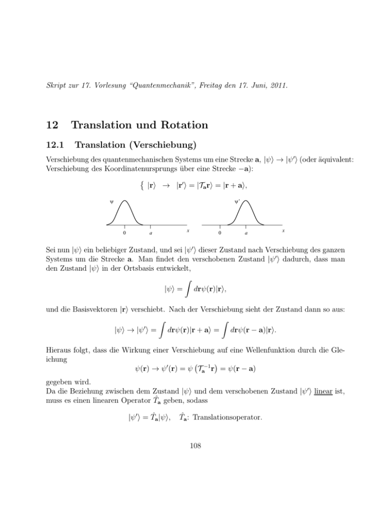Skript zur 17. Vorlesung “Quantenmechanik”, Freitag den 17. Juni, 2011. 12 12.1 Translation und Rotation Translation (Verschiebung) Verschiebung des quantenmechanischen Systems um eine Strecke a, |ψi → |ψ ′ i (oder äquivalent: Verschiebung des Koordinatenursprungs über eine Strecke −a): |ri → |r′ i = |Ta ri = |r + ai, ψ ψ’ 0 a x 0 a x Sei nun |ψi ein beliebiger Zustand, und sei |ψ ′ i dieser Zustand nach Verschiebung des ganzen Systems um die Strecke a. Man findet den verschobenen Zustand |ψ ′ i dadurch, dass man den Zustand |ψi in der Ortsbasis entwickelt, Z |ψi = drψ(r)|ri, und die Basisvektoren |ri verschiebt. Nach der Verschiebung sieht der Zustand dann so aus: Z Z ′ |ψi → |ψ i = drψ(r)|r + ai = drψ(r − a)|ri. Hieraus folgt, dass die Wirkung einer Verschiebung auf eine Wellenfunktion durch die Gleichung ψ(r) → ψ ′ (r) = ψ Ta−1 r = ψ(r − a) gegeben wird. Da die Beziehung zwischen dem Zustand |ψi und dem verschobenen Zustand |ψ ′ i linear ist, muss es einen linearen Operator T̂a geben, sodass |ψ ′ i = T̂a |ψi, T̂a : Translationsoperator. 108 Wir werden nun beweisen, dass T̂a = e−ia· p̂ /~ . Bemerkung: Der Operator T̂a ist unitär: T̂a† = T̂a−1 = T̂−a . Zwei Beweise: 1. Mit Zustandsfunktion, durch die Potenzreihe der Exponentialfunktion und die Taylor-Entwicklung: T̂a ψ(r) = e−ia· p̂ /~ ψ(r) ∞ X 1 = (−a · ∇)n ψ(r) n! n=0 = ψ(r − a). 2. Mit Eigenzuständen |ri des Ortsoperators r̂ : |ri ist Ortseigenzustand zum Eigenwert r. Wir beweisen nun, dass T̂a |ri = |r + ai, d.h. T̂a |ri ist Ortseigenzustand zum Eigenwert r + a • Aus [x̂, p̂] = i~ folgt, dass [x̂, p̂nx ] = in~p̂xn−1 , sodass [x̂, e−iax ·p̂x /~ )] = ax e−iax ·p̂x /~ . Ebenso findet man, dass (mit r̂ anstatt x̂): [r̂, e−ia·p̂/~ ] = ae−ia·p̂/~ . Hieraus folgt dann, dass [r̂, T̂a ] = aT̂a . Nun: r̂ T̂a |ri = T̂a r̂ + [r, T̂a ] |ri = (T̂a r̂ + T̂a a)|ri = (r + a) T̂a |ri. Wichtige Bemerkung: Manchmal wird der quantenmechanische Impulsoperator p̂ durch die Beziehung T̂a ≡ e−ia·p/~ definiert, d.h. p̂ ist der “Erzeuger” der Translationen. Aus dieser Definition kann man dann herleiten, dass [x̂i , p̂j ] = i~δij und dass p̂ ψ(r) = −i~∇ψ(r). (Wir haben letztere Gleichung als Definition des Impulsoperators verwendet.) Erläuterung: Wir beweisen zuerst, dass aus T̂a ≡ e−ia·p/~ folgt, dass [x̂i , p̂j ] = i~δij . Hierzu bemerken wir, dass aus T̂a |ri = |r + ai folgt, dass r̂ T̂a |ri = r̂|r + ai = (r+a)|r + ai = (r+a)T̂a |ri. Ganz allgemein gilt auch, dass r̂ T̂a |ri = T̂a r̂ + [ r̂ , T̂a ] |ri = r T̂a |ri + [ r̂ , T̂a ]|ri. 109 Kombinieren gibt dann: [ r̂ , T̂a ]|ri = aT̂a |ri. Da dies für beliebige Basisvektoren |ri gilt, muss [ r̂ , T̂a ] = aT̂a auch als Operator-Identität gültig sein. Wenn man in dieser Gleichung T̂a in a entwickelt und den Beitrag der 1. Ordnung betrachtet, findet man, dass i − [ r̂ , a p̂ ] = a. ~ Wähle a = aei , i = x, y, z, und man findet [x̂, p̂j ] = i~δij . Wir beweisen nun, dass p̂ = −i~∇: Aus T̂a ψ(r) = ψ(r − a) folgt, nach Entwickeln des Exponenten T̂a = e−ia·p/~ und nach einer Taylor-Entwicklung von ψ(r − a), dass i (1 − ap + . . .)ψ(r) = ψ(r) − a · ∇ψ(r) + . . . ~ Da diese Gleichung für beliebige Verschiebung a erfüllt sein muss, folgt dass p̂ = −i~∇. Die Definition des Impulses durch T̂a ≡ e−ia·p/~ gilt auch dann, wenn die Zustände |ψi nicht durch eine Funktion ψ(r) dargestellt werden! (Dies ist z.B. der Fall in Vielteilchensysteme.) 12.2 Rotation Drehung des quantenmechanischen Systems um einen Winkel η um eine Achse e (oder äquivalent: Drehung des Koordinatensystems um −η): |ri → |r′ i = |Rη ri wobei Rη der Rotationsmatrix ist. Beispiel: Eine Rotation um einen Winkel η um die z-Achse wird durch die Rotationsmatrix cos η − sin η 0 Rη = sin η cos η 0 0 0 1 beschrieben. Eine Rotation bildet einen beliebigen Zustand |ψi auf einen Zustand |ψ ′ i ab, |ψi → |ψ ′ i. 110 Die Wellenfunktion des Zustandes |ψ ′ i ist dann ψ(r′ ) = ψ(R−1 η r). Die Beziehung zwischen |ψi und |ψ ′ i ist linear: Rotationsoperator |ψi = R̂η |ψi. Es gilt: R̂η = e−iηe· l̂ /~ , wobei l̂ = r̂ × p̂ der Drehimpuls-Operator ist. Beweis: Man wählt Koordinaten so, dass e = ez . Dann gilt ∂ e · l̂ = ˆlz = −i~ . ∂φ In Kugelkoordinaten, mit Potenzreihe des Exponenten und Taylor-Entwicklung: ∞ X 1 ∂ n R̂η ψ(r, θ, φ) = ψ(r, θ, φ) = ψ(r, θ, φ − η). −η n! ∂φ n=0 Nun kehren wir die Theorie um und definieren den Drehimpuls-Operator ĵ durch die Beziehung R̂η = e−iηeĵ/~ . Für einen “Massenpunkt” in der Schröderingertheorie gilt ĵ = l̂ = r̂ × p̂ . Wir benützen das Symbol “j” in der allgemeinen Beziehung zwischen R̂η und den DrehimpulsOperator, weil j und l im allgemeinen Fall nicht die gleichen Operatoren sind. Diese Definition des Drehimpulses ist allgemein gültig, auch für quantenmechanische Systeme ohne klassisches Äquivalent oder für Vielteilchensysteme. Was kann man aus dieser Definition herleiten? • Rotationen sind nicht vertauschbar. In drei Dimensionen gilt für eine Rotation über Winkel η um Achse ex , ey , ez : 1 0 0 Rη,x = 0 cos η − sin η , 0 sin η cos η cos η 0 sin η 0 1 0 , Rη,y = − sin η 0 cos η cos η − sin η 0 Rη,z = sin η cos η 0 0 0 1 111 Für Rotationswinkel η ≪ 1 gilt: −1 −1 Rη,y Rη,x Rη,y Rη,x = R−η2 ,z + O(η 3) und zyklisch weiter. Hieraus folgt, dass eiηĵy /~ eiηĵx /~ e−iηĵy /~ e−iηĵx /~ = eiη 2 ĵ z /~ , bis auf Korrekturen der Ordnung η 3 . Entwickeln in η gibt i η2 h η2 1̂ + 2 ĵx , ĵy = 1̂ + i ĵz , ~ ~ sodass h i ĵx , ĵy = i~jˆz und zyklisch weiter. Zusammenfassend: Mit der Definition R̂η = e−iηeĵ/~ folgen die Kommutationsrelationen des Drehimpulsoperators ĵ aus den Eigenschaften der Drehungen! Bemerkung: De