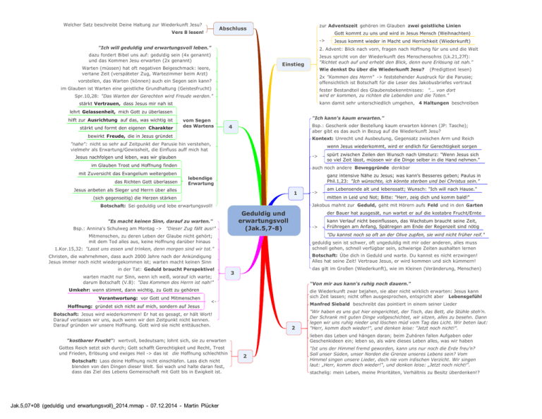 Welcher Satz beschreibt Deine Haltung zur Wiederkunft Jesu? zur Adventszeit gehören im Glauben zwei geistliche Linien Abschluss Vers 8 lesen! Gott kommt zu uns und wird in Jesus Mensch (Weihnachten) -> "Ich will geduldig und erwartungsvoll leben." Jesus kommt wieder in Macht und Herrlichkeit (Wiederkunft) 2. Advent: Blick nach vorn, fragen nach Hoffnung für uns und die Welt dazu fordert Bibel uns auf: geduldig sein (4x genannt) und das Kommen Jesu erwarten (2x genannt) Jesus spricht von der Wiederkunft des Menschensohns (Lk.21,27f): "Richtet euch auf und erhebt den Blick, denn eure Erlösung ist nah." Einstieg Warten (müssen) hat oft negativen Beigeschmack: leere, vertane Zeit (verspäteter Zug, Wartezimmer beim Arzt) Wie denkst Du über die Wiederkunft Jesu? (Predigttext lesen) 2x "Kommen des Herrn" -> feststehender Ausdruck für die Parusie; offensichtlich ist Botschaft für die Leser des Jakobusbriefes vertraut vorstellen, das Warten (können) auch ein Segen sein kann? im Glauben ist Warten eine geistliche Grundhaltung (Geistesfrucht) fester Bestandteil des Glaubensbekenntnisses: "... von dort wird er kommen, zu richten die Lebenden und die Toten." Spr.10,28: "Das Warten der Gerechten wird Freude werden." kann damit sehr unterschiedlich umgehen, 4 Haltungen beschreiben stärkt Vertrauen, dass Jesus mir nah ist lehrt Gelassenheit, mich Gott zu überlassen hilft zur Ausrichtung auf das, was wichtig ist stärkt und formt den eigenen Charakter vom Segen des Wartens "Ich kann's kaum erwarten." Bsp.: Geschenk oder Bestellung kaum erwarten können (JP: Tasche); aber gibt es das auch in Bezug auf die Wiederkunft Jesu? 4 bewirkt Freude, die in Jesus gründet Kontext: Unrecht und Ausbeutung, Gegensatz zwischen Arm und Reich "nahe": nicht so sehr auf Zeitpunkt der Parusie hin verstehen, vielmehr als Erwartung/Gewissheit, die Einfluss auff mich hat wenn Jesus wiederkommt, wird er endlich für Gerechtigkeit sorgen -> Jesus nachfolgen und leben, was wir glauben im Glauben Trost und Hoffnung finden mit Zuversicht das Evangelium weitergeben das Richten Gott überlassen spürt zwischen Zeilen den Wunsch nach Umsturz: "Wenn Jesus sich so viel Zeit lässt, müssen wir die Dinge selber in die Hand nehmen." auch noch andere Beweggründe denkbar ganz intensive Nähe zu Jesus; was kann's Besseres geben; Paulus in Phil.1,23: "Ich wünschte, ich könnte sterben und bei Christus sein." lebendige Erwartung Jesus anbeten als Sieger und Herrn über alles 1 (sich gegenseitig) die Herzen stärken Geduldig und erwartungsvoll (Jak.5,7-8) "Es macht keinen Sinn, darauf zu warten." Bsp.: Annina's Schulweg am Montag -> "Dieser Zug fällt aus!" -> "Du kannst noch so oft an der Olive zupfen, sie wird nicht früher reif." 1.Kor.15,32: "Lasst uns essen und trinken, denn morgen sind wir tot." Botschaft: Übe dich in Geduld und warte. Du kannst es nicht erzwingen! Alles hat seine Zeit! Vertraue Jesus, er wird kommen und sich kümmern! das gilt im Großen (Wiederkunft), wie im Kleinen (Veränderung, Menschen) 3 "Von mir aus kann's ruhig noch dauern." Umkehr: wenn stimmt, dann wichtig, zu Gott zu gehören Hoffnung: gründet sich nicht auf mich, sondern auf Jesus die Wiederkunft zwar bejahen, sie aber nicht wirklich erwarten: Jesus kann sich Zeit lassen; nicht offen ausgesprochen, entspricht aber Lebensgefühl <- Manfred Siebald beschreibt das pointiert in einem seiner Lieder Botschaft: Jesus wird wiederkommen! Er hat es gesagt, er hält Wort! Darauf verlassen wir uns, auch wenn wir den Zeitpunkt nicht kennen. Darauf gründen wir unsere Hoffnung. Gott wird sie nicht enttäuschen. 2 Botschaft: Lass deine Hoffnung nicht einschlafen. Lass dich nicht blenden von den Dingen dieser Welt. Sei wach und halte daran fest, dass das Ziel des Lebens Gemeinschaft mit Gott bis in Ewigkeit ist. Jak.5,07+08 (geduldig und erwartungsvoll)_2014.mmap - 07.12.2014 - Martin Plücker "Wir haben es uns gut hier eingerichtet, der Tisch, das Bett, die Stühle steh'n. Der Schrank mit guten Dinge vollgeschichtet, wir sitzen, alles zu besehn. Dann legen wir uns ruhig nieder und löschen müd vom Tag das Licht. Wir beten laut: "Herr, komm doch wieder!", und denken leise: "Jetzt noch nicht!". lieben das Leben und hängen daran; beim Zuhören fallen Aufgaben oder Geschenkideen ein; leben so, als wäre dieses Leben alles, was wir haben "kostbarer Frucht": wertvoll, bedeutsam; lohnt sich, sie zu erwarten Gottes Reich setzt sich durch; Gott schafft Gerechtigkeit und Recht, Trost und Frieden, Erlösung und ewiges Heil -> das ist die Hoffnung schlechthin kann Verlauf nicht beeinflussen, das Wachstum braucht seine Zeit, Frühregen am Anfang, Spätregen am Ende der Regenzeit sind nötig geduldig sein ist schwer, oft ungeduldig mit mir oder anderen, alles muss schnell gehen, schnell verfügbar sein, schwierige Zeiten aushalten lernen Christen, die wahrnehmen, dass auch 2000 Jahre nach der Ankündigung Jesus immer noch nicht wiedergekommen ist; warten macht keinen Sinn Verantwortung: vor Gott und Mitmenschen mitten in Leid und Not; Bitte: "Herr, zeig dich und komm bald!" der Bauer hat ausgesät, nun wartet er auf die kostabre Frucht/Ernte Mitmenschen, zu deren Leben der Glaube nicht gehört; mit dem Tod alles aus, keine Hoffnung darüber hinaus in der Tat: Geduld braucht Perspektive! am Lebensende alt und lebenssatt; Wunsch: "Ich will nach Hause." Jakobus mahnt zur Geduld, geht mit Hörern aufs Feld und in den Garten Botschaft: Sei geduldig und lebe erwartungsvoll! warten macht nur Sinn, wenn ich weiß, worauf ich warte; darum Botschaft (V.8): "Das Kommen des Herrn ist nah!" -> 2 "Ist uns der Himmel fremd geworden, kann uns nur noch die Erde freu’n? Soll unser Süden, unser Norden die Grenze unseres Lebens sein? Vom Himmel singen unsere Lieder, doch nie vom irdischen Verzicht. Wir singen laut: „Herr, komm doch wieder!“, und denken leise: „Jetzt noch nicht!". stachelig: mein Leben, meine Prioritäten, Verhältnis zu Besitz überdenken!?