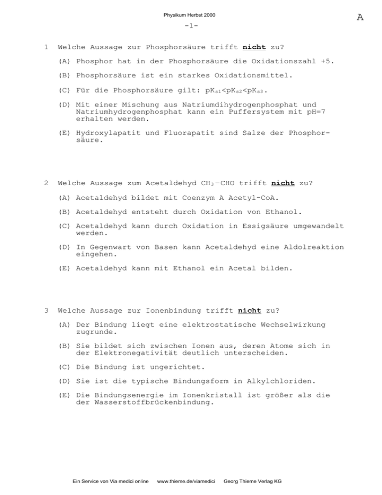 Physikum Herbst 2000 A -11 Welche Aussage zur Phosphorsäure trifft nicht zu? (A) Phosphor hat in der Phosphorsäure die Oxidationszahl +5. (B) Phosphorsäure ist ein starkes Oxidationsmittel. (C) Für die Phosphorsäure gilt: pK s1 <pK s2 <pK s3 . (D) Mit einer Mischung aus Natriumdihydrogenphosphat und Natriumhydrogenphosphat kann ein Puffersystem mit pH=7 erhalten werden. (E) Hydroxylapatit und Fluorapatit sind Salze der Phosphorsäure. 2 Welche Aussage zum Acetaldehyd CH 3 − CHO trifft nicht zu? (A) Acetaldehyd bildet mit Coenzym A Acetyl-CoA. (B) Acetaldehyd entsteht durch Oxidation von Ethanol. (C) Acetaldehyd kann durch Oxidation in Essigsäure umgewandelt werden. (D) In Gegenwart von Basen kann Acetaldehyd eine Aldolreaktion eingehen. (E) Acetaldehyd kann mit Ethanol ein Acetal bilden. 3 Welche Aussage zur Ionenbindung trifft nicht zu? (A) Der Bindung liegt eine elektrostatische Wechselwirkung zugrunde. (B) Sie bildet sich zwischen Ionen aus, deren Atome sich in der Elektronegativität deutlich unterscheiden. (C) Die Bindung ist ungerichtet. (D) Sie ist die typische Bindungsform in Alkylchloriden. (E) Die Bindungsenergie im Ionenkristall ist größer als die der Wasserstoffbrückenbindung. Ein Service von Via medici online www.thieme.de/viamedici Georg Thieme Verlag KG Physikum Herbst 2000 A -24 Welche Aussage über Chelatkomplexe trifft zu? (A) Die Elektronenwolken der Liganden überlappen sich mit denen des Zentralions. (B) Es sind Metallkomplexe, deren Zentralion eine Koordinationszahl größer 4 besitzt. (C) Mehrere Zentralionen werden durch zweizähnige Liganden verbunden. (D) Ein Ligandenmolekül enthält zwei oder mehr Atome, die sich mit ihrem freien Elektronenpaar an ein und dasselbe Zentralion anlagern. (E) Mehrere Koordinationsstellen des Zentralions werden von ein und demselben Ligandenatom besetzt. 5 Welche Aussage zur Nernstschen Gleichung trifft nicht zu? [Ox ] RT E = E° + n F ln [ Red ] (A) Das Redoxpotential ist eine Funktion der Temperatur. (B) Bei Verdopplung der Konzentration des Oxidationsmittels resultiert eine Verdopplung des Redoxpotentials. (C) Die Größe E° ist das Normalpotential des Redoxsystems. (D) Die Größe R ist die allgemeine Gaskonstante. (E) Die Zahl n gibt die Anzahl übertragener Elektronen an. 6 1 Liter einer gesättigten Bariumsulfatlösung enthält 4 10 −5 mol/L Ba 2+ -Ionen. Wieviel Ba 2+ -Ionen enthält ein Liter der Lösung ungefähr? (A) 10 −2 (B) 10 −5 (C) 10 19 (D) 10 23 (E) 10 28 Ein Service von Via medici online www.thieme.de/viamedici Georg Thieme Verlag KG Physikum Herbst 2000 A -37 Bei jeweils vollständiger Dissoziation und bei jeweils gleicher Stoffmengenkonzentration ist das Verhältnis des osmotischen Drucks 1 einer Kochsalz-Lösung und des osmotischen Drucks 2 einer Calciumchlorid-Lösung (mit Wasser als Lösungsmittel) (A) 1 / 2 = 1/2 (B) 1 / 2 = 2/3 (C) 1 / 2 = 1 (D) 1 / 2 = 3/2 (E) 1 / 2 = 2 8 Für die transmembranale Diffusion der Ionenart Z gilt: X = IZ / gZ. Um welche Größe handelt es sich bei X? (I Z = Ionenstrom von Z [A·m −2 ], g Z = Membranleitfähigkeit für das Ion Z [S·m −2 ], E m = Membranpotential der Zelle und E Z = Gleichgewichtspotential für Z über die Zellmembran) (A) E m - E Z (B) Permeabilitätskoeffizient von Z an der Membran (C) Konzentrationsdifferenz von Z über die Membran (D) E m , und zwar unabhängig von E Z (E) E Z , und zwar unabhängig von E m 9 Welche Aussage zum Donnan-Gleichgewicht trifft nicht zu? (A) Das Donnan-Gleichgewicht beschreibt Ionengleichgewichte an semipermeablen Membranen, bei denen Ionen beteiligt sind, die die Membran nicht passieren können. (B) Die Einstellung des Donnan-Gleichgewichts an der Membran wird durch die Diffusion von Ionen erreicht, die die Membran passieren können. (C) Aus dem Donnan-Gleichgewicht kann ein Membranpotential resultieren. (D) Im Donnan-Gleichgewicht sind die Produkte der Konzentrationen der wanderungsfähigen Kationen und Anionen auf jeder der beiden Seiten der Membran gleich. (E) Die Geschwindigkeit der Einstellung des Donnan-Gleichgewichts ist von der Temperatur unabhängig. Ein Service von Via medici online www.thieme.de/viamedici Georg Thieme Verlag KG Physikum Herbst 2000 A -410 Ein Carrier transportiere eine Substanz X nach der MichaelisMenten-Kinetik durch die Zellmembran ins Zellinnere, wo die Konzentration von X vernachlässigbar klein sei. Wodurch kann sich die Transportrate von X nicht erhöhen? ([X] e = extrazelluläre Konzentration von X, K m = MichaelisKonstante, J max = maximale Transportrate) (A) vermehrter Einbau von Carriern dieses Typs in die Zellmembran (B) Erhöhung der Affinität zwischen X und dem Carrier (C) Verminderung von K m (D) extrazelluläre Anwesenheit einer Substanz Y, die an die gleiche Stelle des Carriers wie X bindet (E) Erhöhung von [X] e von 0,5 K m auf 1,5 K m 11 Welche Aussage zum Fließgleichgewicht trifft nicht zu? (A) Fließgleichgewichte können in geschlossenen Systemen auftreten. (B) Systeme im Fließgleichgewicht können Arbeit leisten. (C) Fließgleichgewichte können nur unter Zufuhr von Energie aufrecht erhalten werden. (D) Im Fließgleichgewicht sind die Konzentrationen der Intermediate konstant. (E) In Fließgleichgewichten sind die Geschwindigkeiten der Teilreaktionen gleich groß. 12 Die Wechselzahl eines Enzyms (A) entspricht den pro Mol Enzym in der Zeiteinheit umgesetzten Molen Substrat (B) ist der reziproke Wert der Michaelis-Konstante (C) kann aus der Lineweaver-Burk-Darstellung abgelesen werden (D) ist die Assoziationskonstante des Enzym-Substrat-Komplexes (E) entspricht der Aktivierungsenergie der nichtkatalysierten Reaktion Ein Service von Via medici online www.thieme.de/viamedici Georg Thieme Verlag KG Physikum Herbst 2000 A -513 Vergleichen Sie folgende Verbindungen: OH OH (1) (2) (A) (2) ist azider als (1). (B) (1) und (2) sind Isomere. (C) (1) und (2) lassen sich an der OH-Gruppe verestern. (D) Die Oxidation führt bei beiden Verbindungen zu einem Keton. (E)