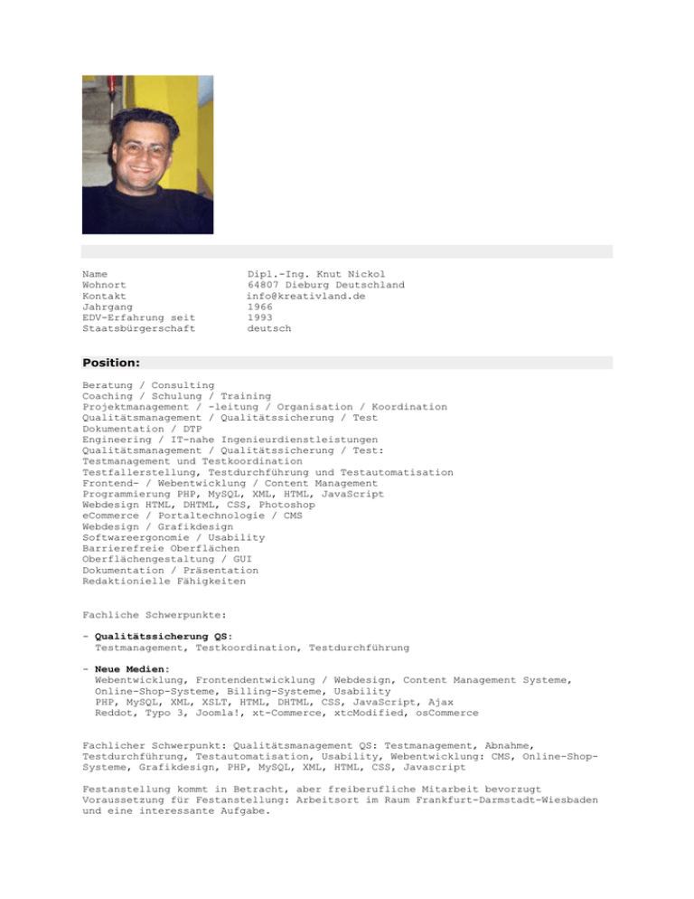 Name Wohnort Kontakt Jahrgang EDV-Erfahrung seit Staatsbürgerschaft Dipl.-Ing. Knut Nickol 64807 Dieburg Deutschland info@kreativland.de 1966 1993 deutsch Position: Beratung / Consulting Coaching / Schulung / Training Projektmanagement / -leitung / Organisation / Koordination Qualitätsmanagement / Qualitätssicherung / Test Dokumentation / DTP Engineering / IT-nahe Ingenieurdienstleistungen Qualitätsmanagement / Qualitätssicherung / Test: Testmanagement und Testkoordination Testfallerstellung, Testdurchführung und Testautomatisation Frontend- / Webentwicklung / Content Management Programmierung PHP, MySQL, XML, HTML, JavaScript Webdesign HTML, DHTML, CSS, Photoshop eCommerce / Portaltechnologie / CMS Webdesign / Grafikdesign Softwareergonomie / Usability Barrierefreie Oberflächen Oberflächengestaltung / GUI Dokumentation / Präsentation Redaktionielle Fähigkeiten Fachliche Schwerpunkte: - Qualitätssicherung QS: Testmanagement, Testkoordination, Testdurchführung - Neue Medien: Webentwicklung, Frontendentwicklung / Webdesign, Content Management Systeme, Online-Shop-Systeme, Billing-Systeme, Usability PHP, MySQL, XML, XSLT, HTML, DHTML, CSS, JavaScript, Ajax Reddot, Typo 3, Joomla!, xt-Commerce, xtcModified, osCommerce Fachlicher Schwerpunkt: Qualitätsmanagement QS: Testmanagement, Abnahme, Testdurchführung, Testautomatisation, Usability, Webentwicklung: CMS, Online-ShopSysteme, Grafikdesign, PHP, MySQL, XML, HTML, CSS, Javascript Festanstellung kommt in Betracht, aber freiberufliche Mitarbeit bevorzugt Voraussetzung für Festanstellung: Arbeitsort im Raum Frankfurt-Darmstadt-Wiesbaden und eine interessante Aufgabe. Ausbildung: 98-13 Certified Tester nach ISTQB Berufliche Weiterbildung in Projekten während freiberuflicher Tätigkeit (QS / QM Test: Abnahme, Inbetriebnahme, Softwaretest, Softwareprüfung, Qualitätsmanagement, Beratung, Programmierung, Frontend- & Webdesign) Schwerpunkte: Neue Medien / Internet / Intranet / Qualitätssicherung / Usability Qualitätssicherung QS: Abnahme, Inbetriebnahme, Softwaretest, Softwareprüfung, Qualitätsmanagement, Testmanagement, Testkoordination, Testdurchführung, Testautomatisation, Testfallerstellung, Dokumentation Content Management Systeme (CMS, WCMS) eCommerce / Online-Shop-Systeme (osCommerce, xtcCommerce, xtcModified usw.), Portale Webpublishing & Programmierung HTML, PHP, MySQL, Oracle, JavaScript, XML, CSS Softwareergonomie (Usability, benutzerfreundliche Oberflächen, GUI) Dokumentation, Reporting, Kommunikation 96-98 Festanstellung Programmierer/Softwareentwickler Atas GmbH, Softwarehaus, Seligenstadt 94-96 Festanstellung Key Account Manager Fa. Schaaf Gabelstapler GmbH, Rödermark Diverse Vertriebslehrgänge, Präsentationen, Verkauf, Optimierung der internen Prozesse 89-94 Studium des Maschinenbaus Fachhochschule Darmstadt Abschluss: Diplom Ingenieur Maschinenbau (Fertigung & Konstruktion) 87-89 Ersatzdienst: Rettungsdienst Johaniter Unfallhilfe, Rodgau Abschluss: Rettungs-Sanitäts-Assistent 1987 Allgemeine Hochschulreife Technisches Gymnasium, Offenbach Einsatzort: Deutschland Kommentar zum Einsatzort / zur Arbeitserlaubnis Deutschland: Nur D6, Hessen, Rhein-Main, Frankfurt, Darmstadt, Wiesbaden, Mannheim, Aschaffenburg bevorzugt. Fremdsprachen: Deutsch Englisch Französisch Indonesisch Spanisch Hardware: Amiga Atari PC Scanner Muttersprache B2: verhandlungssicher A2: Fortgeschrittene Kenntnisse A1: Grundkenntnisse A1: Grundkenntnisse Siemens-SPS STEP x Soundkarten Video Capture Karte Grundkenntnisse Digitale Viedeokameras Midi-Technologie (Synthesizer, Sampler usw.) Atari ST, Commodore 64 Betriebssysteme: MS-DOS Unix Windows CE Windows Linux Programmiersprachen: Basic C++ C Delphi Java JavaScript Pascal Perl PHP Scriptsprachen Grundkenntnisse Grundkenntnisse Grundkenntnisse Grundkenntnisse JavaScript: Experte, Java: Grundkenntnisse JavaScript: Experte, Java: Grundkenntnisse Grundkenntnisse Grundkenntnisse Gute Kenntnisse ISML (InterShop Markup Language) Auszeichnungs-Sprachen (Mark-up Sprachen): HTML, DHTML XML, XSL, XSLT, XHTML, DTD CSS: Experte Weitere Sprachen / Methoden: JavaScript (DOM): Experte Skriptsprachen: ESSI Pic++ Datenbanken: Access MS SQL Server MySQL Postgres SQL Grundkenntnisse Basiskenntnisse Gute Kenntnisse MySQL Datenkommunikation: Ethernet Internet, Intranet ISDN TCP/IP Windows Netzwerk Konstruktion: DSL Grundkenntnisse & Linux Studium Maschinenbau: Fertigung und Konstruktion Weblayout und Webdesign Grafikdesign Simulation/Versuch: - Diplomarbeit: Numerische Simulation eines komplexen Fluidsystems - Materialprüfungen Produkte/Standards/Erfahrungen: Erfahrungen: - Testmanagement/QS Projektmanagement und Testleitung Testdurchführung, Testautomatisation ISTQB Certified Tester Projektmanagement im Bereich Neue Medien/Internet Entwicklung CMS/Online-Shop-Systeme Certified Tester nach ISTQB OS: - DOS - Windows 95/98/NT/2000/XP/Vista/7 - Linux DEBIAN Markup Sprachen: - HTML, XHTML, DHTML CSS XML, XSL ISML (Intershop) Sprachen: - PHP - JavaScript - Java: Grundkenntnisse - Perl/CGI - Turbo Pascal: Grundkenntnisse QS- / Test-Tools: Testautomatisierung: - Mercury Winrunner, Badboy Powerdesigner (Benutzerebene) SQS Test Center (Benutzerebene) Mercury Quality Center QC (Benutzerebene) BMC / ARS Remedy (Benutzerebene) Rational Clear Quest, Clear Case DB-Abfragen: TOAD, tOra, MySQL-Front, SQL-Developer, phpMyAdmin Datenbanken: - MYSQL / SQL, Oracle Webserver: - Apache: Aufbau, Design, Wartung, Security, Administration & Konfiguration - Internet Information Server (IIS) - Apache TomCat Webdesign und Grafikdesign: - Macromedia Dreamweaver & MS Frontpage - Macromedia Flash (Grundkenntnisse) - Adobe PhotoShop Editoren, Entwicklungsumgebungen - Eclipse TopStyle Homesite, UltraEdit, Phase5 HTML-Editor, Notepad++ XML Spy Web-Tools: - phpMyAdmin - Webmin, Confixx, SysCP MS-Office: - MS MS MS MS MS Word Excel Powerpoint Outlook Project UML-Tools: - Sybase Powerdesigner Online-Shop-Systeme / eCommerce: - Konzepte, Beratun