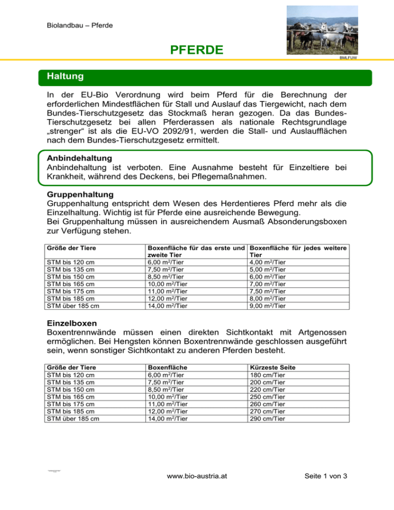 Biolandbau – Pferde PFERDE BMLFUW Haltung In der EU-Bio Verordnung wird beim Pferd für die Berechnung der erforderlichen Mindestflächen für Stall und Auslauf das Tiergewicht, nach dem Bundes-Tierschutzgesetz das Stockmaß heran gezogen. Da das BundesTierschutzgesetz bei allen Pferderassen als nationale Rechtsgrundlage „strenger“ ist als die EU-VO 2092/91, werden die Stall- und Auslaufflächen nach dem Bundes-Tierschutzgesetz ermittelt. Anbindehaltung Anbindehaltung ist verboten. Eine Ausnahme besteht für Einzeltiere bei Krankheit, während des Deckens, bei Pflegemaßnahmen. Gruppenhaltung Gruppenhaltung entspricht dem Wesen des Herdentieres Pferd mehr als die Einzelhaltung. Wichtig ist für Pferde eine ausreichende Bewegung. Bei Gruppenhaltung müssen in ausreichendem Ausmaß Absonderungsboxen zur Verfügung stehen. Größe der Tiere STM bis 120 cm STM bis 135 cm STM bis 150 cm STM bis 165 cm STM bis 175 cm STM bis 185 cm STM über 185 cm Boxenfläche für das erste und Boxenfläche für jedes weitere zweite Tier Tier 6,00 m2/Tier 4,00 m2/Tier 2 7,50 m /Tier 5,00 m2/Tier 2 8,50 m /Tier 6,00 m2/Tier 2 10,00 m /Tier 7,00 m2/Tier 2 11,00 m /Tier 7,50 m2/Tier 2 12,00 m /Tier 8,00 m2/Tier 2 14,00 m /Tier 9,00 m2/Tier Einzelboxen Boxentrennwände müssen einen direkten Sichtkontakt mit Artgenossen ermöglichen. Bei Hengsten können Boxentrennwände geschlossen ausgeführt sein, wenn sonstiger Sichtkontakt zu anderen Pferden besteht. Größe der Tiere STM bis 120 cm STM bis 135 cm STM bis 150 cm STM bis 165 cm STM bis 175 cm STM bis 185 cm STM über 185 cm Boxenfläche 6,00 m2/Tier 7,50 m2/Tier 8,50 m2/Tier 10,00 m2/Tier 11,00 m2/Tier 12,00 m2/Tier 14,00 m2/Tier Kürzeste Seite 180 cm/Tier 200 cm/Tier 220 cm/Tier 250 cm/Tier 260 cm/Tier 270 cm/Tier 290 cm/Tier Zur Anzeige wird der QuickTime™ Dekompressor „Foto - JPEG“ benötigt. www.bio-austria.at Seite 1 von 3 Biolandbau – Pferde Bodenbeschaffenheit Der Boden muss rutschfest sein, die Liegefläche trocken und mit Naturmaterialien eingestreut. Licht Im Ausmaß von mindestens 3% der Stallbodenfläche muss Tageslicht einfallen können, wenn kein ständiger Zugang ins Freie zur Verfügung steht. Ganzjährige Haltung im Freien Für jedes Tier muss eine überdachte, trockene und eingestreute Liegefläche mit Windschutz in einem Ausmaß zur Verfügung stehen, das allen Tieren ein gleichzeitiges ungestörtes Liegen ermöglicht. Kann der Futterbedarf nicht ausreichend durch Weide gedeckt werden, muss zusätzliches Futter angeboten werden. Auch bei tiefen Temperaturen muss sichergestellt sein, dass Menge und Energiegehalt des vorhandenen Futters ausreichen, um den Energiebedarf der Tiere zu decken. Der Boden im Bereich der ständig benützten Fütterungs- und Tränkebereiche muss befestigt sein. Kranke und verletzte Tiere sind gesondert und geschützt unterzubringen. Fütterung Den Tieren ist mindestens drei Mal täglich Raufutter zur Verfügung zu stellen, sofern keine Möglichkeit zu freier Aufnahme besteht. Bei der Fütterung in Gruppenhaltung ist sicherzustellen, dass jedes einzelne Tier ausreichend Nahrung aufnehmen kann und es nicht zu Verdrängungen kommt. Werden Pferde in Gruppenhaltung ad libidum bei ganztägiger Futtervorlage gefüttert, darf ein Tier-Fressplatz-Verhältnis von 1,5 : 1 nicht überschritten werden. „Lass mal alles raus“ Den Tieren ist 180 Tage Auslauf/Weide, verteilt über das ganze Jahr, zu gewähren. Die Auslauffläche muss mindestens doppelt so groß sein wie die Einzelboxenfläche. Übergangsregelungen für Auslaufflächen Wenn der Stall vor dem 24.08.1999 errichtet wurde und die Auslauffläche den nationalen Bestimmungen, Stand August 1999, entspricht, müssen die Mindestauslaufflächen gemäß EU-VO 2092/91 spätestens ab 01.01.2011 eingehalten werden. Zur Anzeige wird der QuickTime™ Dekompressor „Foto - JPEG“ benötigt. www.bio-austria.at Seite 2 von 3 Biolandbau – Pferde Mindestauslauffläche für Pferde für Stallungen, die nach dem 01.01.2005 errichtet wurden: Bei Neubauten muss die Auslauffläche gemäß Bundestierschutzgesetz mindestens doppelt so groß sein wie die Einzelboxenfläche. Die Umzäunung von Pferdekoppeln und Pferdeausläufen ist so zu gestalten, dass spitze Winkel vermieden werden. Die Verwendung von Stacheldraht oder weitmaschigen Knotengitterzäunen ist bei Pferdekoppeln und bei Pferdeausläufen verboten. „Bio“ braucht seine Zeit Tierische Produkte gelten grundsätzlich 24 Monate nach Kontrollvertragabschluss als Bio-Produkte. Ein Umstellungshinweis für tierische Produkte ist nicht möglich. Im Bereich der Tierhaltung besteht jedoch die Möglichkeit der vorzeitigen Teilanerkennung eines bestimmten Betriebszweiges. Voraussetzung ist dabei die Haltung der Tiere nach Bio-Richtlinien sowie die Fütterung mit Umstellungs- bzw. Bio-Futtermittel. Zudem sind folgende Fristen für eine Teilanerkennung einzuhalten: Tierart Milcherzeugung Frist für Teilanerkennung 6 Monate Umstellungsfahrplan Konventionelle Ware Kontrollvertrag Biologische Ware 24 Monate Richtlinien Tierzukauf Pferde gelten als nicht zertifizierte Tiere in der biologischen Tierhaltung. Beim Zukauf konventioneller Tiere kann das Alter der Zukaufstiere unberücksichtigt bleiben. Diese Tiere dürfen nicht vermarktet oder an haushaltsfremde Personen abgegeben werden bzw. nicht für die Lebensmittelerzeugung verwendet werden. Fütterung Seit 1. Jänner 2008 dürfen an Pferde nur mehr Bio-Futtermittel verfüttert werden. Dazu gibt es keine Ausnahmen mehr! Zur Anzeige wird der QuickTime™ Dekompressor „Foto - JPEG“ benötigt. www.bio-austria.at Seite 3 von 3