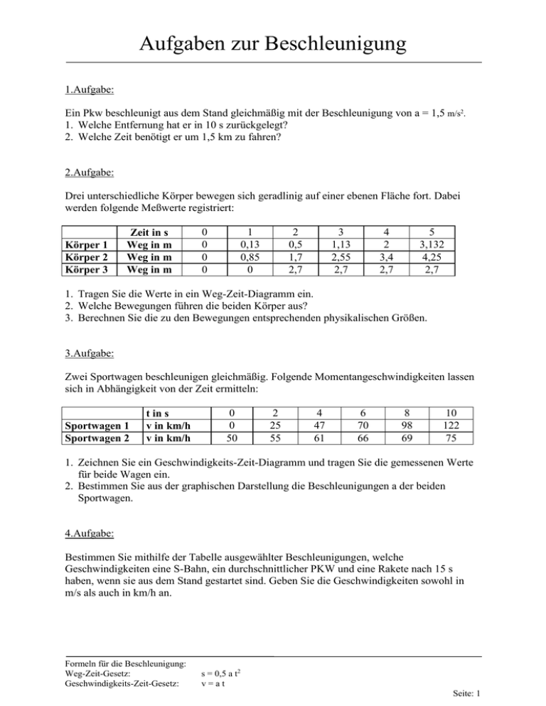 Aufgaben zur Beschleunigung 1.Aufgabe: Ein Pkw beschleunigt aus dem Stand gleichmäßig mit der Beschleunigung von a = 1,5 m/s2. 1. Welche Entfernung hat er in 10 s zurückgelegt? 2. Welche Zeit benötigt er um 1,5 km zu fahren? 2.Aufgabe: Drei unterschiedliche Körper bewegen sich geradlinig auf einer ebenen Fläche fort. Dabei werden folgende Meßwerte registriert: Körper 1 Körper 2 Körper 3 Zeit in s Weg in m Weg in m Weg in m 0 0 0 0 1 0,13 0,85 0 2 0,5 1,7 2,7 3 1,13 2,55 2,7 4 2 3,4 2,7 5 3,132 4,25 2,7 1. Tragen Sie die Werte in ein Weg-Zeit-Diagramm ein. 2. Welche Bewegungen führen die beiden Körper aus? 3. Berechnen Sie die zu den Bewegungen entsprechenden physikalischen Größen. 3.Aufgabe: Zwei Sportwagen beschleunigen gleichmäßig. Folgende Momentangeschwindigkeiten lassen sich in Abhängigkeit von der Zeit ermitteln: Sportwagen 1 Sportwagen 2 t in s v in km/h v in km/h 0 0 50 2 25 55 4 47 61 6 70 66 8 98 69 10 122 75 1. Zeichnen Sie ein Geschwindigkeits-Zeit-Diagramm und tragen Sie die gemessenen Werte für beide Wagen ein. 2. Bestimmen Sie aus der graphischen Darstellung die Beschleunigungen a der beiden Sportwagen. 4.Aufgabe: Bestimmen Sie mithilfe der Tabelle ausgewählter Beschleunigungen, welche Geschwindigkeiten eine S-Bahn, ein durchschnittlicher PKW und eine Rakete nach 15 s haben, wenn sie aus dem Stand gestartet sind. Geben Sie die Geschwindigkeiten sowohl in m/s als auch in km/h an. Formeln für die Beschleunigung: Weg-Zeit-Gesetz: Geschwindigkeits-Zeit-Gesetz: s = 0,5 a t2 v=at Seite: 1 Aufgaben zur Beschleunigung Tabelle ausgewählter Beschleunigungen Beispiel: .....................................................................................a in m/s2 Güterzug .............................................................................................0,1 Personenzug .......................................................................................0,2 S-Bahn ................................................................................................0,5 U-Bahn ...............................................................................................0,8 PKW (60 kW).....................................................................................3,0 Motorrad (15 kW) .................................................................................5 Rennwagen .................................................................................... bis 10 Freier Fall .........................................................................................9,81 Rakete ..................................................................................................50 Geschoß .......................................................................................500000 5.Aufgabe: Ein Motorradfahrer beschleunigt seine Maschine in 3,5 s von 0 auf 100 km/h. 1. Wie groß ist seine Beschleunigung a? 2. Welchen Weg hat er inzwischen zurückgelegt? 3. Welche Geschwindigkeit hätte er nach 25 s? 6.Aufgabe: Ein Pkw hat bei einer Beschleunigung von 3,6 m/s2 aus dem Stand 2 km zurückgelegt. Wie groß ist dann seine Momentangeschwindigkeit? 7.Aufgabe: Eine Lokomotive fährt aus dem Ruhezustand gleichmäßig beschleunigt mit einer Beschleunigung von a = 0,6 m/s2 an. 1. Wie lange dauert es, bis sie die Geschwindigkeit von 80 km/h erreicht hat 2. Wie weit ist sie dann von ihrem Ausgangsort entfernt? 8.Aufgabe: Ein Auto bremst aus voller Fahrt bis zum Stillstand ab. Es wird eine Verzögerung von 5,15 m/s2 angenommen. 1. Wie groß war seine Geschwindigkeit? 2. Wie lang war der Bremsweg? Formeln für die Beschleunigung: Weg-Zeit-Gesetz: Geschwindigkeits-Zeit-Gesetz: s = 0,5 a t2 v=at Seite: 2 Aufgaben zur Beschleunigung 9.Aufgabe: Ein Kraftfahrzeug legt beim Anfahren in 16 s eine Strecke von 120 m zurück. Welche Geschwindigkeit erreicht es in dieser Zeit? 10.Aufgabe: Die höchste Beschleunigung, die ein Mensch während einer geraumen Zeit ertragen kann, ohne gesundheitlichen Schaden zu nehmen, beträgt etwa a = 100 m/s2. Dies entspricht etwa dem 10-fachen der Fallbeschleunigung auf der Erde ( 10 g ). Die Mondfahrer kehrten mit ihrem Raumschiff zur Erde zurück und ihre Rückkehrgeschwindigkeit betrug bei ihrer Ankunft ca. v0 = 11.000 m/s. Unter der Voraussetzung, daß der Abbremsvorgang einer gleichmäßigen Verzögerung entspricht sollen folgende Größen bestimmt werden: 1. Welche Länge hat der Bremsweg, um die Raumkapsel zum Stillstand zu bringen? 2. Welche Zeit nahm der Abbremsvorgang in Anspruch? 11.Aufgabe: Von der US-Air-Force wurden 1954 in Neumexiko auf einer langen Schienenstrecke Beschleunigungsversuche durchgeführt, um die Belastbarkeit des Menschen für Raumfahrtprojekte zu untersuchen. Mithilfe von Raketentriebwerken wurde ein Schlitten längs einer Teilstrecke von 840 m mit der Beschleunigung a = 70 m/s2 angetrieben. Danach bewegte sich der Schlitten 300 m antriebslos weiter. Auf dem dritten Teil der durchfahrenen Strecke von der Länge 210 m wurde der Schlitten mit Bremsschaufeln, die in ein Wasserbecken eintauchten, abgebremst. 1. Skizzieren Sie die drei Bewegungsvorgänge in einem v-t-Diagramm. 2. Welche v1 hatte der Raketenschlitten nach dem Durchfahren der ersten Teilstrecke? 3. Wie lange wurde er längs dieser Teilstrecke beschleunigt? 4. Wie lange bewegte sich der Schlitten antriebslos? 5. Welche Zeit nahm der Bremsvorgang in Anspruch? 6. Mit welcher Beschleunigung wurde der Schlitten gebremst? Formeln für die Beschleunigung: Weg-Zeit-Gesetz: Geschwindigkeits-Zeit-Gesetz: s = 0,5 a t2 v=at Seite: 3 Aufgaben zur Beschleunigung 11.Aufgabe: Bestimmen Sie aus dem unterstehenden Geschwindigkeits-Zeit-Diagramm die entsprechenden Beschleunigungen: Beschleunigte Bewegungen 900 800 700 v 600 i n 500 400 m / s 300 200 100 0 0 10 20 30 40 50 60 70 80 90 100 t in s Formeln für die Beschleunigung: Weg-Zeit-Gesetz: Geschwindigkeits-Zeit-Gesetz: s = 0,5 a t2 v=at Seite: 4