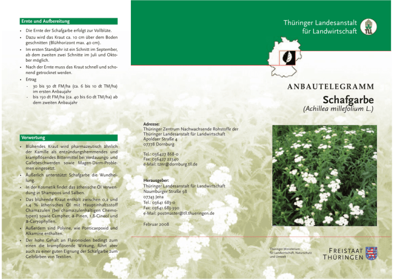 Ernte und Aufbereitung Thüringer Landesanstalt für Landwirtschaft • Die Ernte der Schafgarbe erfolgt zur Vollblüte. • Dazu wird das Kraut ca. 10 cm über dem Boden geschnitten (Blühhorizont max. 40 cm). • Im ersten Standjahr ist ein Schnitt im September, ab dem zweiten zwei Schnitte im Juli und Oktober möglich. • Nach der Ernte muss das Kraut schnell und schonend getrocknet werden. • Ertrag - 30 bis 50 dt FM/ha (ca. 6 bis 10 dt TM/ha) im ersten Anbaujahr - bis 150 dt FM/ha (ca. 40 bis 60 dt TM/ha) ab dem zweiten Anbaujahr ANBAUTELEGRAMM Schafgarbe (Achillea millefolium L.) Verwertung • Blühendes Kraut wird pharmazeutisch ähnlich der Kamille als entzündungshemmendes und krampflösendes Bittermittel bei Verdauungs- und Gallebeschwerden sowie Magen-Darm-Problemen eingesetzt. • Äußerlich unterstützt Schafgarbe die Wundheilung. • In der Kosmetik findet das ätherische Öl Verwendung in Shampoos und Salben. • Das blühende Kraut enthält zwischen 0,2 und 1,4 % ätherisches Öl mit Hauptinhaltsstoff Chamazulen (bei chamazulenhaltigen Chemotypen) sowie Campher, D-Pinen, 1,8-Cineol und D-Caryophyllen. • Außerdem sind Polyine, wie Ponticaepoxid und Alkamine enthalten. • Der hohe Gehalt an Flavonoiden bedingt zum einen die krampflösende Wirkung, führt aber auch zu einer guten Eignung der Schafgarbe zum Gelbfärben von Textilien. Adresse: Thüringer Zentrum Nachwachsende Rohstoffe der Thüringer Landesanstalt für Landwirtschaft Apoldaer Straße 4 07778 Dornburg Tel.: 036427 868-0 Fax: 036427 22340 e-Mail: tznr@dornburg.tll.de Herausgeber: Thüringer Landesanstalt für Landwirtschaft Naumburger Straße 98 07743 Jena Tel.: 03641 683-0 Fax: 03641 683-390 e-Mail: postmaster@tll.thueringen.de Februar 2008 Thüringer Ministerium für Landwirtschaft, Naturschutz und Umwelt Botanik • Schafgarbe ist ein ausdauernder Korbblütler. • Sie bildet einen kriechenden Wurzelstock aus. • Die schwach behaarten, ca. 25 bis 70 cm hohen Stängel tragen in rispigen Scheindolden angeordnete Blüten, die weiß bis zart rosa gefärbt sind. • Die Früchte erreichen ein Tausendkorngewicht (TKG) von ca. 0,16 g. Bodenbearbeitung • Herbstfurche bei Frühjahrspflanzung • feuchtigkeitsbewahrende Saat- bzw. Pflanzenbettbereitung • feinkrümeliges Saat- bzw. Pflanzbett Aussaat / Pflanzung Klimaansprüche • Die Schafgarbe ist in Europa heimisch und somit bestens an die klimatischen Bedingungen angepasst. • Die Pflanze ist auch in Asien und Nordamerika weit verbreitet und hinsichtlich des Klimas anspruchslos. Bodenansprüche • Schafgarbe stellt geringe Anforderungen an den Boden. • Staunasse, sehr feuchte Lagen sind für einen Anbau weniger geeignet. • Bei der Standortwahl sollte die Neigung der Schafgarbe zur Cadmiumakkumulation berücksichtigt werden. Fruchtfolge • Bei der Neuanlage ist auf unkrautunterdrückende Eigenschaften der Vorfrucht zu achten. • Die Bestände sind mehrjährig nutzbar. • Wegen einer eventuellen Durchwuchsgefahr ist Getreide als Nachfrucht gut geeignet. • Pflanzung vorgezogener Jungpflanzen bzw. Stecklinge aus geteilten Wurzelstöcken • Pflanzzeit: April • Pflanzdichte: 50 cm x 30 cm bzw. 40 cm x 40 cm (ca. 65.000 Pflanzen/ha) • Direktsaat mit herkömmlicher Drilltechnik für Feinsämereien August/September (ähnlich Herbstkamille) auf die Bodenoberfläche • Reihenabstand: 30 bis 50 cm • Saatstärke: 3 kg/ha Sortenwahl • Im Handel sind die proazulenreichen Sorten Proa (Deutschland) und Alba (Slowakei) erhältlich. • Wildformen schwanken hinsichtlich des Inhaltsstoffgehaltes und sind für die medizinische Verwendung weniger geeignet. Pflanzenschutz Achtung! Seit dem 01.07.2001 gilt das neue Pflanzenschutzgesetz! Eine Anwendung von Pflanzenschutzmitteln, die nicht für diese Kultur zugelassen sind, ist demzufolge verboten. Über den aktuellen Zulassungsstand bzw. die Möglichkeiten der Erteilung von Genehmigungen der Anwendung von Pflanzenschutzmitteln nach § 18b PflSchG informieren die zuständigen Pflanzenschutzstellen. Unkräuter • Aufgrund der langsamen Jugendentwicklung ist eine mehrmalige Maschinenhacke bis zum Bestandesschluss und gegebenenfalls nach dem 1. Schnitt erforderlich. • Die Bekämpfung von Wurzelunkräutern sollte in der Fruchtfolge vorgenommen werden. Krankheiten und Schädlinge • Mitunter treten Welkeerscheinungen, verursacht durch Cercospora achillae auf. • Durch Blattlausbefall kann es zu Saugschäden an den Triebspitzen kommen. • Der Befall der Wurzeln durch Larven des Kleinschmetterlings Hermimene petiverella führt zur Vergreisung älterer Bestände, ein Absterben des Gesamtbestandes ist möglich. Düngung • Die Düngung sollte anhand der Nährstoffentzüge vorgenommen werden. • Bei einem Ertrag von 50 dt TM/ha (Blühhorizont) ist mit Entzügen von: 150 - 170 kg N/ha 20 - 25 kg P/ha 200 - 230 kg K/ha und 10 - 12 kg Mg/ha zu rechnen. • Die Stickstoffdüngung sollte jährlich zu Vegetationsbeginn und nach dem ersten Schnitt verabreicht werden. • Eine jährliche Grunddüngung mit P und K ist zu empfehlen. • Auf organische Düngung reagiert die Schafgarbe mit einer signifikanten Zunahme an Biomasse und einer Erhöhung des Gehaltes an ätherischem Öl.