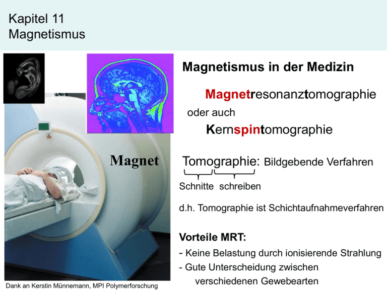 Kapitel 11 Magnetismus Magnetismus in der Medizin Magnetresonanztomographie oder auch Kernspintomographie Magnet Tomographie: Bildgebende Verfahren Schnitte schreiben d.h. Tomographie ist Schichtaufnahmeverfahren Vorteile MRT: - Keine Belastung durch ionisierende Strahlung Dank an Kerstin Münnemann, MPI Polymerforschung - Gute Unterscheidung zwischen verschiedenen Gewebearten Kapitel 11 Magnetismus Zunächst: Magnetismus Beobachtung: Kompassnadel richtet sich in Nord-Süd-Richtung aus Kompass Enden eines Magneten heißen Pole - Jeder Magnet hat genau 2 Pole Am Pol ist das Magnetfeld am stärksten Nordpol: Die nach Norden zeigende Spitze (magnetischer Nordpol liegt in Nähe des geographischen Südpols) Südpol: Die nach Süden zeigende Spitze Verwendung von Magenten zur Navigation bereits im 12. Jahrhundert http://www.chemgapedia.de/vsengine/media/vsc/de/ph/14/ep/einfuehrung/magnetfeld/bilder/erdefeld.png Kapitel 11 Magnetismus Magnetismus (Permanetmagnete) - Farbkonvention Nordpol: rot Südpol: grün oder blau - Gleichnamige Pole ziehen sich an Ungleichnamige Pole stoßen sich ab - Teilt man einen Stabmagneten entstehen zwei kleinere neue Magnete (es gibt keine magnetischen Monopole) N S Kapitel 11 Magnetismus Magnetismus Magnetfeld ๐ฉ: Raum in dem die von einem Magneten ausgehenden Kräfte wirksam sind. magnetische Feldlinien N S Visualisierung des magnetischen Feldes mit Eisenpfeilspäne Kapitel 11 Magnetismus Magnetische Feldlinien: - geben in jedem Punkt die Richtung des Magnetfeldes an. - verlaufen vom Nordpol zum Südpol. - Abstand zwischen benachbarten Feldlinien ist ein Maß für die Stärke des Magnetfeldes: je dichter die Feldlinien, desto stärker das Feld. - Feldlinien sind immer geschlossene Kurven Kapitel 11 Magnetismus Magnetfeld Strom stromdurchflossene Leiter sind von Magnetfeldern umgeben (Oersted 1820) stromdurchflossener Leiter Eisenfeilspäne => Magnetfelder lassen sich durch elektrische Ströme erzeugen! - Feldlinien verlaufen kreisförmig (geschlossene Bahnen) d.h. senkrecht zum Draht, bzw. senkrecht zur Bewegungsrichtung der Elektronen => Nord- oder Südpol existiert nicht. Kapitel 11 Magnetismus Orientierung der Feldlinien abhängig von Stromrichtung I B + - Umpolung der Spannung => Magnetnadeln drehen sich um - rechte Hand Regel: • Daumen zeigt in Richtung der “Stromrichtung” (plus -> minus) (Beachte: Elektronenbewegung: minus -> plus) • gekrümmte Finger geben den Verlauf der magnetischen Feldlinien Kapitel 11 Magnetismus Magnetische Feldstärke • Magnetfelder wirken auf Magnete, Körper aus Eisen,.. und bewegte Lagungsträger • bewegte Ladungsträger eignen sich gut zur Definition der magnetischen Feldstärke, da Stromstärke genau und einfach reproduzierbar messbar ist. - + Magnetische Feldstärke S I variierbar durch Stromstärke im Elektromagneten F B N Leiter steht senkrecht zu den magnetischen Feldlinien Beobachtung: Leiterschleife wird nach links gezogen => Kraft Kapitel 11 Magnetismus Ziel: Nachweis und Messung der Kraft, die von einem Magnetfeld auf einen Leiter ausgeübt wird stromdurchflossener Leiter, steht senkrecht zum Magnetfeld Magnetische Feldstärke ๐ญ variierbar durch Stromstärke Elektromagnet im Elektromagneten. N Beobachtung: Leiterschleife wird nach unten gezogen => Kraft ๐น~๐ผ ๐น ~๐ => ๐น ~ ๐ผ๐ ๐ผ: Stromstärke in Leiterschleife |๐ |: Länge des Leiters bzw.: ๐น ๐ผ๐ ๐ผ ๐ = ๐๐๐๐ ๐ก. Konstante: Maß für Stärke des Magnetfeldes => ๐ต= ๐น ๐ผ๐ Kapitel 11 Magnetismus Ziel: Nachweis und Messung der Kraft, die von einem Magnetfeld auf einen Leiter ausgeübt wird Die magnetische Feldstärke ๐ฉ gibt an, wie ๐น ๐ต= ๐ผ๐ groß die Kraft ๐ญ ist, die von einem Magnetfeld auf einen Leiter der Länge ๐ ausgeübt wird, in dem ein Strom mit der Strom Stärke ๐ฐ fließt. Beachte: magnetische Feldstärke wird auch als magnetische Flussdichte bezeichnet Einheit von [๐ต] ist Tesla wobei 1๐ = 1 ๐ ๐ด๐ Feldstärke des Erdmagnetfeldes (ortsabhängig): 30 μT bis 60 μT = (30 bis 50) 10-6 T Stärkste Magneten: ca. 12 Tesla (Saclay, Frankreich) ๐น ๐ต= ๐ผ๐ Kapitel 11 Magnetismus Wie hängt die Kraft von den Richtungen ab? Betrachte Leiterstück im Magnetfeld ๐ต Beobachtung: • Kraft ist maximal, wenn die magnetische Feldstärke senkrecht zur Bewegungsrichtung der Ladungsträger steht. - - ๐ - - -- - - + - + • Richtung der Kraft folgt der drei Finger Regel der rechten Hand. S Daumen: konventionelle Stromrichtung ( + → - ) F B Zeigefinger: Richtung magnetische Feldlinien Mittelfinger: Richtung der Kraft I N ๐น ๐ต= ๐ผ๐ Kapitel 11 Magnetismus Wie hängt die Kraft von den Richtungen ab? Beobachtung: Kraft ist maximal, wenn die magnetische Feldstärke senkrecht zur Bewegungsrichtung der Ladungsträger steht. => ๐ต - -- - ๐ ๐น = ๐ผ ๐ต × ๐ ≡ ๐ผ ๐ต ๐ ๐ ๐๐๐ ๐ - - -- - - + ๐ -- ++ (Vektorprodukt von ๐ต und ๐ ) ๐ฐ Wobei: ๐ der Winkel zwischen ๐ต und ๐ ist ๐ ein Einheitsvektor in Richtung ๐น ist ๐น Falls ๐ต senkrecht zu ๐ steht, ist ๐ ๐๐๐ = sin90° = 1 ๏ |๐น| = ๐ผ |๐ต| |๐ | = ๐ผ ๐ต ๐ , da ๐ผ > 0, ๐ต > 0 und ๐ > 0 B N Kapitel 11 Magnetismus ๐น =๐ผ๐ต×๐ Lorentz-Kraft - Elektische Ladung bewegt sich im Magnetfeld ๐ต - Annahme: ๐ฉ sei senkrecht zu ๐. - -- - ๏ |๐น| = ๐ผ ๐ต ๐ da ๐ผ = ๐ โ๐ก und ๐ = ๐๐ ๐: Anzahl Elektronen und ๐ = ๐ฃ โ๐ก folgt: ๐น = ๐ผ ๐ต ๐ = => ๐น ๐ ๐ - - -- - - + ๐ ๐ฃ: Geschwindigkeit der Ladungen ๐ ๐ต โ๐ก = ๐ต๐๐ฃ ≡ ๐น๐ฟ ๐ = ๐๐ ๐ต โ๐ก ๐ฃโ๐ก = ๐๐๐ต ๐ฃ ๐น๐ฟ : Lorentz−Kraft Kapitel 11 Magnetismus ๐น =๐ผ๐ต×๐ Lorentz-Kraft: ๐น๐ฟ ๐ต Im Allgemeinen - -- - • ist ๐ฉ nicht sen