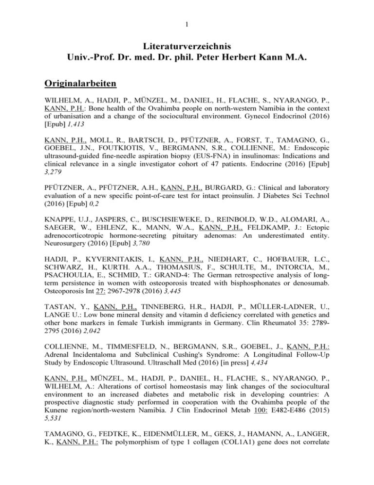 1 Literaturverzeichnis Univ.-Prof. Dr. med. Dr. phil. Peter Herbert Kann M.A. Originalarbeiten WILHELM, A., HADJI, P., MÜNZEL, M., DANIEL, H., FLACHE, S., NYARANGO, P., KANN, P.H.: Bone health of the Ovahimba people on north-western Namibia in the context of urbanisation and a change of the sociocultural environment. Gynecol Endocrinol (2016) [Epub] 1,413 KANN, P.H., MOLL, R., BARTSCH, D., PFÜTZNER, A., FORST, T., TAMAGNO, G., GOEBEL, J.N., FOUTKIOTIS, V., BERGMANN, S.R., COLLIENNE, M.: Endoscopic ultrasound-guided fine-needle aspiration biopsy (EUS-FNA) in insulinomas: Indications and clinical relevance in a single investigator cohort of 47 patients. Endocrine (2016) [Epub] 3,279 PFÜTZNER, A., PFÜTZNER, A.H., KANN, P.H., BURGARD, G.: Clinical and laboratory evaluation of a new specific point-of-care test for intact proinsulin. J Diabetes Sci Technol (2016) [Epub] 0,2 KNAPPE, U.J., JASPERS, C., BUSCHSIEWEKE, D., REINBOLD, W.D., ALOMARI, A., SAEGER, W., EHLENZ, K., MANN, W.A., KANN, P.H., FELDKAMP, J.: Ectopic adrenocorticotropic hormone-secreting pituitary adenomas: An underestimated entity. Neurosurgery (2016) [Epub] 3,780 HADJI, P., KYVERNITAKIS, I., KANN, P.H., NIEDHART, C., HOFBAUER, L.C., SCHWARZ, H., KURTH. A.A., THOMASIUS, F., SCHULTE, M., INTORCIA, M., PSACHOULIA, E., SCHMID, T.: GRAND-4: The German retrospective analysis of longterm persistence in women with osteoporosis treated with bisphosphonates or denosumab. Osteoporosis Int 27: 2967-2978 (2016) 3,445 TASTAN, Y., KANN, P.H., TINNEBERG, H.R., HADJI, P., MÜLLER-LADNER, U., LANGE U.: Low bone mineral density and vitamin d deficiency correlated with genetics and other bone markers in female Turkish immigrants in Germany. Clin Rheumatol 35: 27892795 (2016) 2,042 COLLIENNE, M., TIMMESFELD, N., BERGMANN, S.R., GOEBEL, J., KANN, P.H.: Adrenal Incidentaloma and Subclinical Cushing's Syndrome: A Longitudinal Follow-Up Study by Endoscopic Ultrasound. Ultraschall Med (2016) [in press] 4,434 KANN, P.H., MÜNZEL, M., HADJI, P., DANIEL, H., FLACHE, S., NYARANGO, P., WILHELM, A.: Alterations of cortisol homeostasis may link changes of the sociocultural environment to an increased diabetes and metabolic risk in developing countries: A prospective diagnostic study performed in cooperation with the Ovahimba people of the Kunene region/north-western Namibia. J Clin Endocrinol Metab 100: E482-E486 (2015) 5,531 TAMAGNO, G., FEDTKE, K., EIDENMÜLLER, M., GEKS, J., HAMANN, A., LANGER, K., KANN, P.H.: The polymorphism of type 1 collagen (COL1A1) gene does not correlate 2 with an increased risk of foot ulcers in patients with diabetes mellitus. Exp Clin Endocrinol Diabetes 123: 240-245 (2015) 1,665 SCHNEIDER, H.J., BUCHFELDER, M., WALLASCHOFSKI, H., LUGER, A., JOHANNSSON, G., KANN, P.H., MATTSSON, A.: Proposal of a clinical response score and predictors of clinical response to 2 years GH replacement therapy in adult GHD. Eur J Endocrinol 173: 843-851 (2015) 3,892 SCHÖFL, C., GRUSSENDORF, M., HONEGGER, J., TÖNJES, A., THYROKEGRONOSTAY, D., MAYR, B., SCHOPOHL, J., ALLOLIO, B., BADENHOOP, K., BENDER, G., BIERING, H., BOGNER, U., BORNSTEIN, S.R., CISSEWSKI, K., DEMTRÖDER, F., DIETRICH, J.W., DROSTE, M., ENGELBACH, M., FELDKAMP, J., FINKE, R., FRIESENHAHN-OCHS, B., FÜHRER-SAKEL, D., GALLWITZ, B., GERHARDT, A., GRUBER, M., GRUSSENDORF, M., HAASER, D., HEIKE, M., HERING, S., HONEGGER, J., JACOBS, B., JAURSCH-HANCKE, C., JUNGINGER, S., JUNGMANN, E., KAJDAN, U., KANN, P., KARGES, W., KASPERK, C., KLEIN, H., KLINGMÜLLER, D., KNAUERHASE, A., KORNELY, E., LAMMERT, F., LEHNERT, H., LERCH, M.M., LÖSSNER, C., LÜBBREN, J., MANN, A., MERTENS, P.R., MEUSER, J., MEYER, A., MÖNIG, H., MÜLLER, U.A., MÜLLER-ESCH, G., PICHL, J., PLÖCKINGER, U., PLONER, O., POHLMEYER, P., QUINKLER, M., REINCKE, M., RESCHKE, K., SCHÄFFLER, A., SCHARF, J.G., SCHÖFL, C., SCHOPOHL, J., SCHOTT, M., SEUFERT, J., SIGGELKOW, H., STALLA, G.K., STEVELING, A., STREETZ-VAN, C., STRASBURGER, C.J., STUMVOLL, M., TEICHMANN, J., TÖNJES, A., WEBER, M.M., WIEDEMANN, B., WILLENBERG, H.S., ZIMMERMANN, A., ZUMBUSCH, K.: Failure to achieve disease control in acromegaly: cause analysis by a registry-based survey. Eur J Endocrinol 172: 351-356 (2015) 3,892 PFÜTZNER, A., HERMANNS, I., RAMLJAK, S., DEMIRCIK, F., PFÜTZNER, A.H., KANN, P.H., WEBER, M.M..: Elevated Intact Proinsulin Levels During an Oral Glucose Challenge Indicate Progressive ß-Cell Dysfunction and May Be Predictive for Development of Type 2 Diabetes. J Diabetes Sci Technol 9: 1307-1312 (2015) 0,2 HADJI, P., KAUKA, A., ZILLER, M., BIRKHOLZ, K, BAIER, M., MUTH, M., KANN, P.: Effect of adjuvant endocrine therapy on hormonal levels in premenopausal women with breast cancer: the ProBONE II study. Breast Cancer Res Treat 144: 343-351 (2014) 3,940 BARTSCH, D.K., SLATER, E.P., ALBERS, M., KNOOP, R., CHALOUPKA, B., LOPEZ, C.L., FENDRICH, V., KANN, P.H., WALDMANN, J.: Higher risk of aggressive pancreatic neuroendocrine tumors in MEN1 patients with MEN1 mutations affecting the CHES1 interacting MENIN domain. J Clin Endocrinol Metab 99: E2387-E2391 (2014) 6,209 UITZ, P.M., HARTLEB, S., SCHAEFER, S., AL-FAKHRI, N., KANN, P.H.: Pituitary function in patients with hereditary haemochromatosis. Horm Metab Res 45: 54-61 (2013) 2,038 KÄMMERER, P.W., KUMAR, V.V., BRÜLLMANN, D., GÖTZ, H., KANN, P.H., ALNAWAS, B., KLEIN, M.O.: Evaluation of ultrasound transmission velocity and 3dimensional radiology in different bone types for dental implantology: a comparative ex vivo study. Oral Surg Oral Med Oral Pathol Oral Radiol 116: e77-e84 (2013) 1,495 3 LOPEZ, C.L., FALCONI, M., WALDMANN, J., BONINSEGNA, L., FENDRICH, V., GORETZKI, P.K., LANGER, P., KANN, P.H., PARTELLI, S., BARTSCH, D.K.: Partial pancreaticoduodenectomy can provide cure for duodenal gastrinoma associated with multiple endocrine neoplasia type 1. Ann Surg 257: 308-314 (2013) 6,329 UNGER, M.M., EKMANN, R., BJÖRKLUND, A.K., KARLSSON, G., ANDERSSON, C., MANKEL, K., BOHNE, K., TEBBE, J.J., S