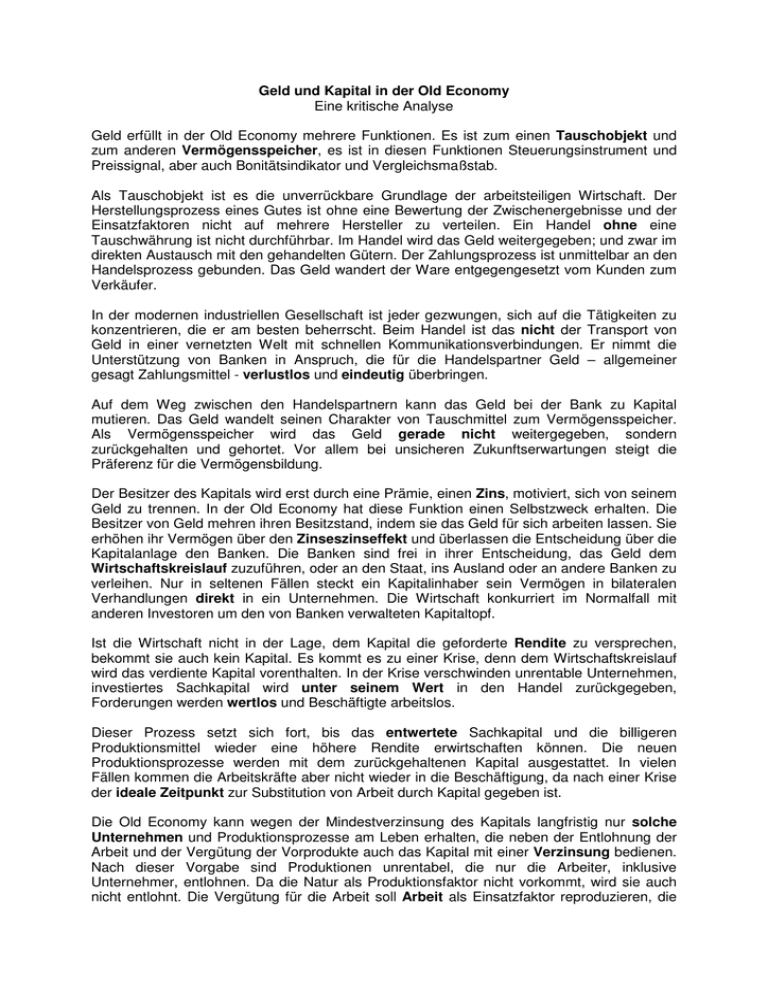 Geld und Kapital in der Old Economy Eine kritische Analyse Geld erfüllt in der Old Economy mehrere Funktionen. Es ist zum einen Tauschobjekt und zum anderen Vermögensspeicher, es ist in diesen Funktionen Steuerungsinstrument und Preissignal, aber auch Bonitätsindikator und Vergleichsmaßstab. Als Tauschobjekt ist es die unverrückbare Grundlage der arbeitsteiligen Wirtschaft. Der Herstellungsprozess eines Gutes ist ohne eine Bewertung der Zwischenergebnisse und der Einsatzfaktoren nicht auf mehrere Hersteller zu verteilen. Ein Handel ohne eine Tauschwährung ist nicht durchführbar. Im Handel wird das Geld weitergegeben; und zwar im direkten Austausch mit den gehandelten Gütern. Der Zahlungsprozess ist unmittelbar an den Handelsprozess gebunden. Das Geld wandert der Ware entgegengesetzt vom Kunden zum Verkäufer. In der modernen industriellen Gesellschaft ist jeder gezwungen, sich auf die Tätigkeiten zu konzentrieren, die er am besten beherrscht. Beim Handel ist das nicht der Transport von Geld in einer vernetzten Welt mit schnellen Kommunikationsverbindungen. Er nimmt die Unterstützung von Banken in Anspruch, die für die Handelspartner Geld – allgemeiner gesagt Zahlungsmittel - verlustlos und eindeutig überbringen. Auf dem Weg zwischen den Handelspartnern kann das Geld bei der Bank zu Kapital mutieren. Das Geld wandelt seinen Charakter von Tauschmittel zum Vermögensspeicher. Als Vermögensspeicher wird das Geld gerade nicht weitergegeben, sondern zurückgehalten und gehortet. Vor allem bei unsicheren Zukunftserwartungen steigt die Präferenz für die Vermögensbildung. Der Besitzer des Kapitals wird erst durch eine Prämie, einen Zins, motiviert, sich von seinem Geld zu trennen. In der Old Economy hat diese Funktion einen Selbstzweck erhalten. Die Besitzer von Geld mehren ihren Besitzstand, indem sie das Geld für sich arbeiten lassen. Sie erhöhen ihr Vermögen über den Zinseszinseffekt und überlassen die Entscheidung über die Kapitalanlage den Banken. Die Banken sind frei in ihrer Entscheidung, das Geld dem Wirtschaftskreislauf zuzuführen, oder an den Staat, ins Ausland oder an andere Banken zu verleihen. Nur in seltenen Fällen steckt ein Kapitalinhaber sein Vermögen in bilateralen Verhandlungen direkt in ein Unternehmen. Die Wirtschaft konkurriert im Normalfall mit anderen Investoren um den von Banken verwalteten Kapitaltopf. Ist die Wirtschaft nicht in der Lage, dem Kapital die geforderte Rendite zu versprechen, bekommt sie auch kein Kapital. Es kommt es zu einer Krise, denn dem Wirtschaftskreislauf wird das verdiente Kapital vorenthalten. In der Krise verschwinden unrentable Unternehmen, investiertes Sachkapital wird unter seinem Wert in den Handel zurückgegeben, Forderungen werden wertlos und Beschäftigte arbeitslos. Dieser Prozess setzt sich fort, bis das entwertete Sachkapital und die billigeren Produktionsmittel wieder eine höhere Rendite erwirtschaften können. Die neuen Produktionsprozesse werden mit dem zurückgehaltenen Kapital ausgestattet. In vielen Fällen kommen die Arbeitskräfte aber nicht wieder in die Beschäftigung, da nach einer Krise der ideale Zeitpunkt zur Substitution von Arbeit durch Kapital gegeben ist. Die Old Economy kann wegen der Mindestverzinsung des Kapitals langfristig nur solche Unternehmen und Produktionsprozesse am Leben erhalten, die neben der Entlohnung der Arbeit und der Vergütung der Vorprodukte auch das Kapital mit einer Verzinsung bedienen. Nach dieser Vorgabe sind Produktionen unrentabel, die nur die Arbeiter, inklusive Unternehmer, entlohnen. Da die Natur als Produktionsfaktor nicht vorkommt, wird sie auch nicht entlohnt. Die Vergütung für die Arbeit soll Arbeit als Einsatzfaktor reproduzieren, die Verzinsung steigert den Faktor Kapital, die fehlende Vergütung für den Naturverbrauch schafft keine Möglichkeit, die Natur zu regenerieren. Der immanente Trend in diesem System sorgt also für die Vermehrung des Kapitals, für Arbeitslosigkeit nach jedem Wirtschaftsabschwung und für unumkehrbaren Naturverbrauch. Die Vermögensfunktion des Geldes ist nicht der einzige Grund für diese Entwicklung, aber sie ist sicher eine gewichtige Einflussgröße. Die Definition des Geldes als Maßstab für die Bonität seines Besitzers, als relative Größe sozialer Wertschätzung unabhängig von der Herkunft des Vermögens, als Barometer der Macht einer Wirtschaft, ist ein fundamentaler Bestandteil der industriellen Kultur. Seine Bedeutung für die gesellschaftlich anerkannten Konventionen haben es zu einem Kulturbestandteil gemacht. Es hat sich nicht selbst definiert, sondern ist zum Symbol der westlichen Gesellschaften geworden. Ohne die Hortung von Geld fehlt der Gesellschaft ein Bestandteil ihrer Definition. Ein Produktionsprozess ohne Kapitaleinsatz kommt in der Old Economy nicht mehr vor. Angefangen von der Befriedigung der Grundbedürfnisse in der landwirtschaftlichen Erzeugung über die Herstellung von Investitionsgütern bis zur Produktion von Konsumgütern bringt die Wirtschaft materielle Güter an den Markt, die nach einem Absatz suchen. Außerhalb der Tauschfunktion bewirkt der Zwang zur Verzinsung des eingesetzten Kapitals die Umkehrung der ursprünglichen Idee von der Bedarfsorientierung der Wirtschaft. Materielle Güter müssen erzeugt werden um sie anschließend zu verkaufen. Die Waren müssen über ein Push Marketing an den Verbraucher gebracht werden, um ihm sein Geld für den Konsum zu entlocken. Nach diesem Mechanismus ist die Arbeitslosigkeit ebenso wie der Naturverbrauch systemimmanent. Bei dem Naturverbrauch ist das unmittelbar nachzuvollziehen, denn ein freies Gut, wie saubere Luft, Wälder oder Flüsse verdient keine Entlohnung, hat also auch keinen Ertrag, mit dem der Einsatzfaktor regeneriert werden kann. Bei der Arbeit als bezahltem Einsatzfaktor ist der Zusammenhang nicht so offensichtlich. Arbeit wird mit dem großen Kapitalstock substituiert. Der Einsatz der Arbeit wird also selbst bei wachsender Wirtsc