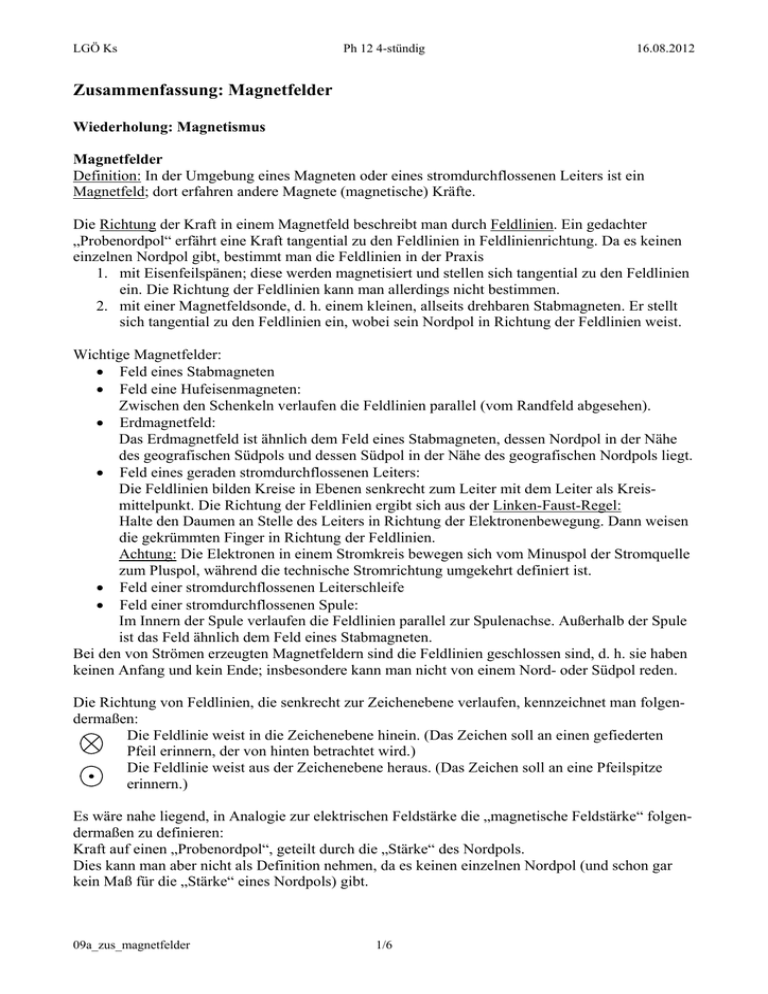 LGÖ Ks Ph 12 4-stündig 16.08.2012 Zusammenfassung: Magnetfelder Wiederholung: Magnetismus Magnetfelder Definition: In der Umgebung eines Magneten oder eines stromdurchflossenen Leiters ist ein Magnetfeld; dort erfahren andere Magnete (magnetische) Kräfte. Die Richtung der Kraft in einem Magnetfeld beschreibt man durch Feldlinien. Ein gedachter „Probenordpol“ erfährt eine Kraft tangential zu den Feldlinien in Feldlinienrichtung. Da es keinen einzelnen Nordpol gibt, bestimmt man die Feldlinien in der Praxis 1. mit Eisenfeilspänen; diese werden magnetisiert und stellen sich tangential zu den Feldlinien ein. Die Richtung der Feldlinien kann man allerdings nicht bestimmen. 2. mit einer Magnetfeldsonde, d. h. einem kleinen, allseits drehbaren Stabmagneten. Er stellt sich tangential zu den Feldlinien ein, wobei sein Nordpol in Richtung der Feldlinien weist. Wichtige Magnetfelder: • Feld eines Stabmagneten • Feld eine Hufeisenmagneten: Zwischen den Schenkeln verlaufen die Feldlinien parallel (vom Randfeld abgesehen). • Erdmagnetfeld: Das Erdmagnetfeld ist ähnlich dem Feld eines Stabmagneten, dessen Nordpol in der Nähe des geografischen Südpols und dessen Südpol in der Nähe des geografischen Nordpols liegt. • Feld eines geraden stromdurchflossenen Leiters: Die Feldlinien bilden Kreise in Ebenen senkrecht zum Leiter mit dem Leiter als Kreismittelpunkt. Die Richtung der Feldlinien ergibt sich aus der Linken-Faust-Regel: Halte den Daumen an Stelle des Leiters in Richtung der Elektronenbewegung. Dann weisen die gekrümmten Finger in Richtung der Feldlinien. Achtung: Die Elektronen in einem Stromkreis bewegen sich vom Minuspol der Stromquelle zum Pluspol, während die technische Stromrichtung umgekehrt definiert ist. • Feld einer stromdurchflossenen Leiterschleife • Feld einer stromdurchflossenen Spule: Im Innern der Spule verlaufen die Feldlinien parallel zur Spulenachse. Außerhalb der Spule ist das Feld ähnlich dem Feld eines Stabmagneten. Bei den von Strömen erzeugten Magnetfeldern sind die Feldlinien geschlossen sind, d. h. sie haben keinen Anfang und kein Ende; insbesondere kann man nicht von einem Nord- oder Südpol reden. Die Richtung von Feldlinien, die senkrecht zur Zeichenebene verlaufen, kennzeichnet man folgendermaßen: Die Feldlinie weist in die Zeichenebene hinein. (Das Zeichen soll an einen gefiederten Pfeil erinnern, der von hinten betrachtet wird.) Die Feldlinie weist aus der Zeichenebene heraus. (Das Zeichen soll an eine Pfeilspitze erinnern.) Es wäre nahe liegend, in Analogie zur elektrischen Feldstärke die „magnetische Feldstärke“ folgendermaßen zu definieren: Kraft auf einen „Probenordpol“, geteilt durch die „Stärke“ des Nordpols. Dies kann man aber nicht als Definition nehmen, da es keinen einzelnen Nordpol (und schon gar kein Maß für die „Stärke“ eines Nordpols) gibt. 09a_zus_magnetfelder 1/6 LGÖ Ks Ph 12 4-stündig 16.08.2012 Kraft auf einen stromdurchflossenen Leiter im Magnetfeld und magnetische Flussdichte Ein stromdurchflossener Leiter, der senkrecht zu den Feldlinien eines Magnetfelds verläuft, erfährt eine Kraft, die senkrecht zum Leiter und senkrecht zu den Feldlinien wirkt. Die Richtung der Kraft ergibt sich aus der Dreifingerregel der linken Hand: Halte den Daumen an Stelle des Leiters in Richtung der Elektronenbewegung und den Zeigefinger in Richtung der Magnetfeldlinien. Dann zeigt der Mittelfinger in Richtung der Kraftwirkung. Zwei Anwendungen dieser Kraftwirkung sind der Elektromotor und der Lautsprecher. Zur Untersuchung des Betrags der Kraft befestigt man eine rechteckige Leiterschleife an einem empfindlichen Kraftmesser. Der untere Teil der Leiterschleife wird senkrecht von einem räumlich begrenzten Magnetfeld durchsetzt, dessen Feldlinien horizontal verlaufen. Die Kräfte F1 und F2 auf die seitlichen Leiterabschnitte heben sich gegenseitig auf. Wirksam ist nur die auf den unteren Leiterabschnitt wirkende Kraft F . Für die Kraftwirkung spielt also nur die Länge dieses Leiterabschnitts, die sog. „wirksame F1 Leiterlänge“ s, eine Rolle. Man weist mit dieser Anordnung nach, dass der Betrag F der Kraft • proportional zu wirksamen Leiterlänge s ist (das ist auch anschaulich klar) und • proportional zur Stromstärke I ist Also gilt F ∼ Is bzw. F = Proportionalitätsfaktor ⋅ Is . I F2 F s Der Proportionalitätsfaktor in dieser Beziehung ist ein Maß für die Stärke des Magnetfelds. Aus historischen Gründen nennt man ihn nicht „magnetische Feldstärke“, sondern „magnetische Flussdichte“: Definition: Ein von einem Strom I durchflossener Leiter der wirksamen Leiterlänge s, der senkrecht zu den Feldlinien eines Magnetfelds verläuft, erfährt eine Kraft F. Der Quotient F B= Is heißt Betrag der magnetischen Flussdichte. N Einheit: 1 T = 1 (Tesla) Am Definition: Die magnetische Flussdichte B ist eine Vektorgröße, deren 1. Betrag gerade definiert wurde; 2. Richtung in einem Feldpunkt die Richtung der Kraft auf einen gedachten Probenordpol an diesem Feldpunkt ist. Merke: Der Betrag von B ist über die Kraftwirkung auf einen stromdurchflossenen Leiter definiert, und die Richtung von B ist über die Kraftwirkung auf einen gedachten Probenordpol definiert. Ein Magnetfeld heißt homogen, wenn die Flussdichte B (nach Betrag und Richtung) überall gleich ist. Beispielsweise ist das Magnetfeld im Innern einer langgestreckten Spule homogen. 09a_zus_magnetfelder 2/6 LGÖ Ks Ph 12 4-stündig 16.08.2012 Aus der Definition des Betrags der magnetischen Flussdichte folgt unmittelbar: Ein von einem Strom I durchflossener Leiter der wirksamen Leiterlänge s, der senkrecht zu den Feldlinien eines Magnetfelds der Flussdichte B verläuft, erfährt die Kraft F = IBs . Merke: „Fibs“ Verläuft ein stromdurchflossener Leiter in einem Magnetfeld nicht senkrecht zu den Feldlinien, dann gilt: • Verläuft der Leiter parallel zu den Feldlinien, dann erfährt er keine Kraft. • Verläuft der Leiter schräg zu den