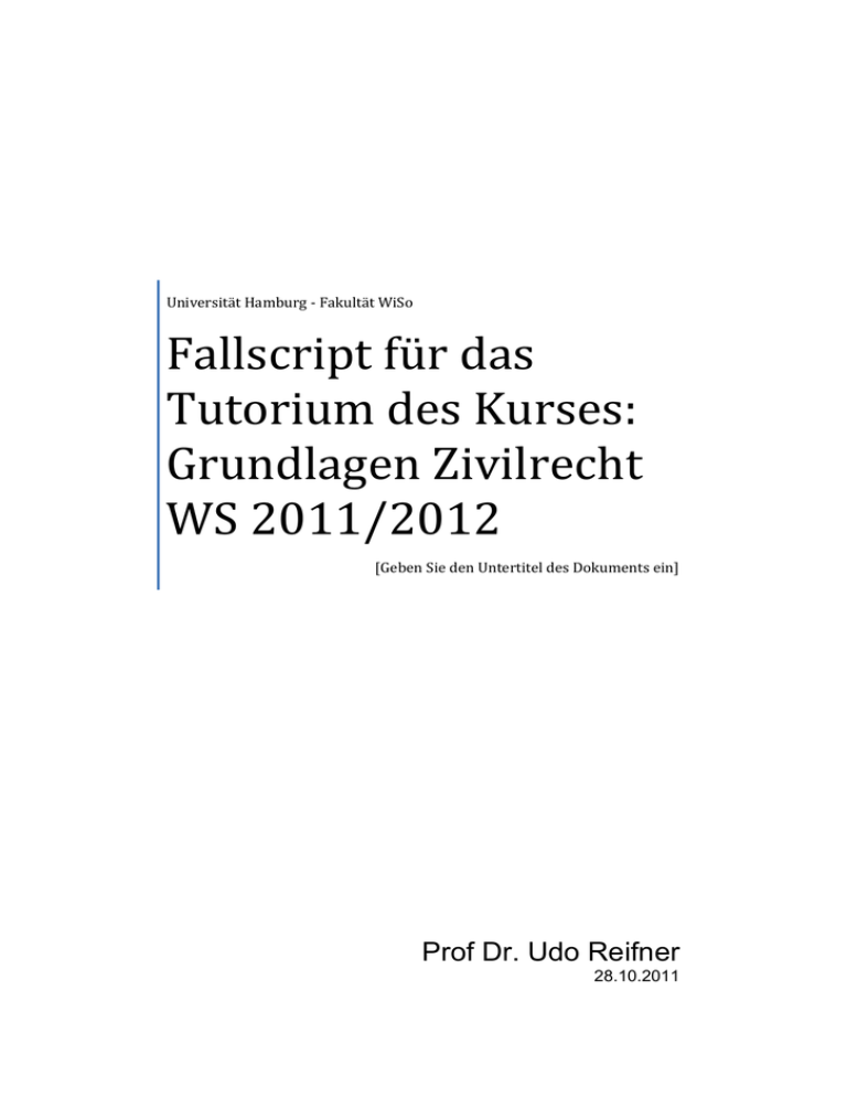 Universität Hamburg - Fakultät WiSo Fallscript für das Tutorium des Kurses: Grundlagen Zivilrecht WS 2011/2012 [Geben Sie den Untertitel des Dokuments ein] Prof Dr. Udo Reifner 28.10.2011 Fallscript zum Tutorium WS 2011/2012 Prof. Dr. Udo Reifner Inhalt Fall 1: Die zerstörte Vase- Schadensersatz statt Leistung ............................................................ 3 Fall 2: Am Ende wird aufgerechnet- Aufrechnungsrecht ................................................................ 4 Fall 3: Gebrauchter Porsche ............................................................................................................... 5 Fall 4: Der eifrige Meier- Vertretung .................................................................................................. 6 Fall 5: Der Konzertflügel ...................................................................................................................... 7 Fall 6: Das Sektenmitglied- Arbeitsvertrag ....................................................................................... 8 Fall 7: Versprechen ins Blaue ............................................................................................................. 9 Fall 8:Schlechte Konjunktur .............................................................................................................. 10 Fall 9: Die Bürgschaft ......................................................................................................................... 11 Fall 10:Freie Preisbildung .................................................................................................................. 12 Fall 11: Die falsche Handtasche....................................................................................................... 13 Fall 12: Die falschen Schuhe ............................................................................................................ 14 Fall 13: Advent Advent ....................................................................................................................... 15 Fall 14: Abgebrannt ............................................................................................................................ 16 Fall 15: Die Wochenendfahrt ............................................................................................................ 17 Fall 16: Kurzfristiger Lokführerstreik ................................................................................................ 18 Fall 17: Die Bananenschale .............................................................................................................. 19 Fall 18: Das Sonnenverdeck ............................................................................................................. 20 Fall 19: Versprechen ins Blaue II (2) ............................................................................................... 21 Fall 20: iPod- Minderjährigenrecht/ Geschäftsfähigkeit I .............................................................. 22 Fall 21: Die Vespa- Minderjährigenrecht/ Geschäftsfähigkeit II .................................................. 23 Fall 22: Minderjährigenrecht/Geschäftsfähigkeit III ....................................................................... 24 Fall 23: Minderjährigenrecht/ Geschäftsfähigkeit IV ...................................................................... 25 Fall 24: Das Arbeitsverhältnis des Minderjährigen ........................................................................ 26 Fall 25:Minderjährigenrecht/ Empfangszuständigkeit ................................................................... 27 Fall 26: Sittenwidrigkeit ...................................................................................................................... 28 Fall 27: Irrtumsanfechtung I .............................................................................................................. 29 Fall 28: Irrtumsanfechtung II ............................................................................................................. 30 Fall 29: Irrtumsanfechtung III ............................................................................................................ 31 Fall 30: Irrtumsanfechtung IV ............................................................................................................ 32 Fall 31: Anfechtung I .......................................................................................................................... 33 Fall 32: Anfechtung II ......................................................................................................................... 34 Fall 33:Anfechtung III ......................................................................................................................... 35 Fall 34: Widerrufsrecht ....................................................................................................................... 36 Fallscript zum Tutorium WS 2011/2012 Prof. Dr. Udo Reifner Fallscript zum Tutorium WS 2011/2012 Prof. Dr. Udo Reifner Fall 1: Die zerstörte Vase- Schadensersatz statt Leistung Am 1. Oktober 2007 betritt der K den Laden des Antiquitätenhändlers V. K ist ein Liebhaber chinesischer Vasen und hat schon zahlreiche Exemplare bei V gekauft. Aufgrund der langjährigen Geschäftsbeziehung räumt V dem K des Öfteren Sonderkonditionen ein. Der Blick des K bei Betreten des Geschäfts fällt sofort auf eine chinesische Vase, die zu einem Preis von 120,- € ausgeschildert ist. K glaubt, dass es sich um ein besonders wertvolles Exemplar mit einem Wert von mindestens 5.000,€ handelt, was V offensichtlich entgangen ist. Als gewiefter Geschäftsmann fragt er nach dem Preis und verdreht kunstvoll die Augen, als V die ausgeschilderte Summe nennt. V, der die Vase fürchterlich kitschig findet und befürchtet, sie nicht los zu werden, äußert daraufhin: „Na gut, für Sie als treuer Kunde mache ich einen Sonderpreis: 100