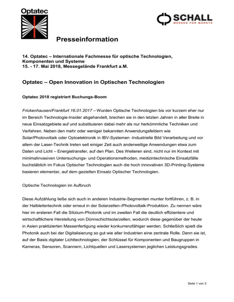 Presseinformation 14. Optatec – Internationale Fachmesse für optische Technologien, Komponenten und Systeme 15. - 17. Mai 2018, Messegelände Frankfurt a.M. Optatec – Open Innovation in Optischen Technologien Optatec 2018 registriert Buchungs-Boom Frickenhausen/Frankfurt 16.01.2017 – Wurden Optische Technologien bis vor kurzem eher nur im Bereich Technologie-Insider abgehandelt, brechen sie in den letzten Jahren in aller Breite in neue Einsatzgebiete auf und substituieren dabei mehr als nur herkömmliche Techniken und Verfahren. Neben den mehr oder weniger bekannten Anwendungsfeldern wie Solar/Photovoltaik oder Optoelektronik in IBV-Systemen -Industrielle Bild Verarbeitung und vor allem der Laser-Technik treten seit einiger Zeit auch anderweitige Anwendungen etwa zum Daten und Licht – Energietransfer, auf den Plan. Des Weiteren sind, nicht nur im Kontext mit minimalinvasiven Untersuchungs- und Operationsmethoden, medizintechnische Einsatzfälle buchstäblich im Fokus Optischer Technologien auch die hoch innovativen 3D-Printing-Systeme basieren elementar, auf dem gezielten Einsatz Optischer Technologien. Optische Technologien im Aufbruch Diese Aufzählung ließe sich auch in anderen Industrie-Segmenten munter fortführen, z. B. in der Halbleitertechnik oder erneut in der Solarzellen-/Photovoltaik-Produktion. Zu nennen wäre hier im ersteren Fall die Silizium-Photonik und im zweiten Fall die deutlich effizientere und wirtschaftlichere Herstellung von Dünnschichtsolarzellen, wodurch diese gegenüber der heute in Asien praktizierten Massenfertigung wieder konkurrenzfähiger werden. Schließlich spielt die Photonik auch bei der Digitalisierung so gut wie aller Industrien eine zentrale Rolle. Denn sie ist, auf der Basis digitaler Lichttechnologien, der Schlüssel für Komponenten und Baugruppen in Kameras, Sensoren, Scannern, Lichtquellen und Lasersystemen jeglichen Leistungsgrades. Seite 1 von 3 Presseinformation Neue Anwendungen als Markttreiber Ein bisschen scheint es aktuell so, also ob sich neben den besagten Technologie-Insidern nun auch andere Industriebereiche ernsthaft für die Einsatz- und Anwendungs-Möglichkeiten Optischer Technologien interessieren. Dadurch gerät der Markt ordentlich in Bewegung, wie auch die „Macher“ der Optatec – Internationale Fachmesse für Optische Technologien, Komponenten und Systeme, erfreut feststellen durften und dürfen: „Die 14. Optatec findet ja erst wieder vom 15. bis 17. Mai 2018 im Messezentrum Frankfurt statt, also in 16 Monaten, und doch können wir bis heute zum Jahresanfang 2017, ausgehend von der sehr guten AusstellerAnzahl der Optatec 2016, bereits rund 60% erneute Anmeldungen verbuchen. Die HallenAufplanung ist im vollem Gange und wir sind zuversichtlich, dass Ergebnis der vergangenen 13. Optatec mit gut 570 Ausstellern aus 31 Ländern überbieten zu können.“, so die Projektleiterin der Optatec, Karen Waldow. Konsequentes Festhalten am Zukunftsmarkt für Optische Technologien Stand heute sind bereits Hersteller und Anbieter aus 22 Nationen vertreten, wobei sich vor allem Aussteller aus Deutschland und aus dem asiatischen Raum mit schnellen Buchungen hervortun. Ganz offensichtlich sehen sie sich mit ihrem Angebot an Optischen Komponenten, Materialien, Beschichtungen und Systemen, für das sich 73% der zuletzt mehr als 5.600 Fachbesucher aus 55 Nationen interessierten, bestens aufgestellt, um beim anspruchsvollen Fachpublikum der weltweit führenden Fachmesse Optatec erneut reüssieren zu können. Nicht zuletzt zahlt sich auch der „lange Atem“ des privaten Messeunternehmen P. E. Schall GmbH & Co. KG aus, die Fachveranstaltung Optatec fortwährend voranzutreiben, ob schon „Optische Technologien“ lange Zeit als „exotische Technologien“ angesehen waren, aus denen sich nur im begrenzten Rahmen ein neuer und zukunftsträchtiger Markt entwickeln lässt. Kontakt: P.E. Schall GmbH & Co.KG Sekretariat Irene Maria Blankenhorn www.schall-messen.de Tel.: +49 (0)7025 / 9206-612 blankenhorn@schall-messen.de Abdruck honorarfrei – Belegexemplar erbeten Seite 2 von 3 Presseinformation Schall-Firmengruppe Das Messeunternehmen P. E. Schall GmbH & Co. KG und die Messe Sinsheim GmbH der Firmengruppe Schall veranstalten wegweisende technische Fachmessen und zugkräftige Publikumsausstellungen. Je nach Rhythmus werden pro Jahr national und global 16 internationale Fachmessen und in Deutschland sechs renommierte Ausstellungen im Freizeitbereich durchgeführt. Fachmessen der P. E. Schall GmbH & Co. KG: Die Control, Motek, Bondexpo und Optatec sind weltweit führend und nehmen den Status einer Weltleitmesse ein. Die Fakuma und die Blechexpo/Schweisstec sind ebenfalls international etabliert und nehmen im globalen Ranking jeweils den zweiten Rang ein. Ausstellungen der Messe Sinsheim GmbH: Echtdampf-Hallentreffen (Karlsruhe), Faszination Modellbahn (Sinsheim), Faszination Modelltech (Sinsheim) Agri Historica (Sinsheim), Faszination Modellbau Friedrichshafen, Modellbahn Köln. Die Schall-Firmengruppe hat ihren Ursprung im Jahr 1962 und entwickelte sich zu einer international hoch geachteten Keimzelle für die Vermarktung technischer Themen. Kontakt: P.E. Schall GmbH & Co.KG Sekretariat Irene Maria Blankenhorn www.schall-messen.de Tel.: +49 (0)7025 / 9206-612 blankenhorn@schall-messen.de Abdruck honorarfrei – Belegexemplar erbeten Seite 3 von 3