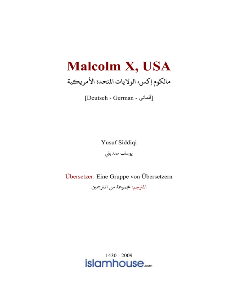 Malcolm X, USA مالكوم إكس ،الواليات املتحدة األمريكية ]ألماني [Deutsch - German - Yusuf Siddiqi يوسف صدييق Übersetzer: Eine Gruppe von Übersetzern املرتجم :جمموعة من املرتمجني 1430 - 2009 Malcolm X, USA )(teil 1 von 2 مالكوم إكس ،الواليات املتحدة األمريكية (اجلزء 1من )2 ]ألماني [Deutsch - German - Beschreibung: Die Geschichte, wie einer der berühmtesten afro-amerikanischen revolutionären Männer den wahren Islam entdeckt und wie dies das Problem des Rassismus löst. Teil 1: Die Nation des Islam und die Hağğ. “Ich bin Muslim und werde immer ein Muslim sein. Meine Religion ist der Islam.” -Malcolm X Frühes Leben Malcolm X, geboren als Malcolm Little am 19. Mai 1925 in Omaha, Nebraska. Seine Mutter, Louis Norton Little, war Hausfrau, die sich um ihre acht Kinder kümmerte. Sein Vater, Earl Little, war Geistlicher der Baptisten und begieriger Unterstützer des Führers der Black Nationalists (der Schwarzen Nationalisten) Marcus Garvey. Earls Bürgerrechtsaktivismus zog Morddrohungen von der weißen Überlegenheitsorganisation Schwarze Legion nach sich, die die Familie dazu zwang, zweimal vor Malcolms viertem Geburtstag umzuziehen. Trotz Littles Anstrengungen der Legion auszuweichen, brannte 1929 ihr Heim in Lansing, Michigan, bis auf den Grund nieder und zwei Jahre später fand man Earls verstümmelten Körper auf den Bahngleisen der Stadt liegen, als Malcolm erst sechs war. Louise hatte mehrere Jahre nach dem Tod ihres Ehemannes einen emotionalen Zusammenbruch und wurde in eine Nervenheilanstalt eingewiesen. Ihre Kinder wurden auf verschiedene Pflegeheime und Waisenhäuser verteilt. Malcolm war ein tüchtiger, strebsamer Student und absolvierte die Junior Highschool als Klassenbester. Als einer seiner Lieblingslehrer ihm allerdings erzählte, dass Malcolms Traum, Rechtsanwalt zu werden, kein realistisches Ziel für einen Nigger sei, verlor Malcolm das Interesse an der Schule und gab sie im Alter von 15 auf. Das Leben der Straße kennenlernend, wurde Malcolm mit Gangstern, Dieben, Rauschgifthändlern und Strichjungen vertraut. Im Alter von zwanzig wegen Einbruch und Diebstahl verurteilt, verbrachte er die Jahre bis er siebenundzwanzig war im Gefängnis. Während seines Aufenthalts im Gefängnis, versuchte er, sich selbst zu weiterzubilden. Außerdem erfuhr er während der Zeit im Gefängnis von der Nation des Islam und trat ihr bei, studierte die Lehren von Elijah Muhammad vollständig. 1952 wurde er als völlig veränderter Mann entlassen. Die ´Nation des Islam´ Nach seiner Entlassung ging Malcolm nach Detroit, beteiligte sich an den täglichen Aktivitäten der Sekte und wurde von Elijah Muhammad persönlich eingewiesen. Malcolms persönliches Engagement half dabei, die Organisation weltweit aufzubauen, wobei er zu einer internationalen Persönlichkeit wurde. 3 Er wurde von großen Fernsehprogrammen und Magazinen interviewt und sprach im ganzen Land an verschiedenen Universitäten und auf anderen Foren. Seine Kraft lag in seinen Worten, die so lebendig die Lage der Schwarzen beschrieben und die Weißen so vehement beschuldigten. Wenn eine weiße Person die Tatsache zitierte, dass manche südliche Universitäten schwarze Neulinge ohne Bayonet eingeschrieben hatten, reagierte Malcolm mit Verachtung: "Als ich hindurchschlüpfte, beeilte sich der Programmmanager, mich zu trietzen: ´Ahhh! Wirklich, Mr. Malcolm X – sie können nicht leugnen, dass dies ein Forschritt für ihre Rasse ist!´ Ich konnte mich nicht umdrehen, ohne etwas von einigen ´Fortschritten in Bürgerrechten´ zu hören! Weiße Menschen scheinen zu denken, der schwarze Mann sollte ´Hallelujah´ ausrufen! Vierhundert Jahre lang hat der weiße Mann sein einen Fuß langes Messer in den Rücken des schwarzen Mannes gestochen – und jetzt beginnt der weiße Mann, das Messer herauszudrehen, vielleicht fünfzehn Zentimeter! Es wird erwartet, dass der schwarze Mann ihnen Dankbarkeit erweist? Warum? Selbst wenn der weiße Mann das Messer ganz herausziehen würde, würde es immer noch eine Narbe hinterlassen!" Obwohl Malcolms Worte häufig mit den Ungerechtigkeiten gegen schwarze in Amerika stachen, hielten ihn die auf gleicher Weise rassistischen Ansichten der Nation des Islam davon ab, jegliche Weißen als aufrichtig anzuerkennen oder in der Lage, ihnen in der Situation hilfreich beiseite stehen zu können. Zwölf Jahre lang predigte er, dass der weiße Mann der Teufel war und der ehrenwerte Elijah Muhammad der Gesandte Gottes. Unglücklicherweise konzentriert sich das Bild der meisten heutzutage auf diesen Zeitabschnitt in Malcolms Leben, obwohl ihm die Veränderungen, die er durchmachte, eine völlig andere und wesentlich wichtigere Botschaft für das amerikanische Volk gegeben haben. Der Wechsel zum wahren Islam Am 12.März 1964 verließ Malcolm die Nation des Islam, abgestoßen von den internen Eifersüchteleien und den Enthüllungen von Elijah Muhammads sexueller Unmoral mit der Absicht, eine eigene Organisation zu gründen: "Ich fühle mich wie ein Mann, der lange unter der Kontrolle eines anderen geschlafen hat. Ich fühle, was ich jetzt denke und sage, ist für mich selbst. Vorher war es für und durch die Anleitung eines anderen gewesen, jetzt aber denke ich mit meinem eigenen Verstand." Malcolm war achtunddreißig Jahre alt, als er Elijah Muhammads Nation des Islam verließ. Über seine Überlegungen nachdenkend, die er vor seinem Austritt angestellt hatte, sagte er: "An dem einen oder anderen Vortrag an einem College oder einer Universität kamen normalerweise, nachdem ich gesprochen hatte, vielleicht ein 4 Dutzend vorwiegend weiß-erscheinende Menschen zu mir, die sich als arabische, mittelöstliche oder aus nordafrikanische Muslime zu erkennen gaben, die die Vereinigten Staaten besuchten, dort studierten oder lebten. Sie hatten mir gesagt, dass sie ungeachtet meiner die Weißen anklagenen