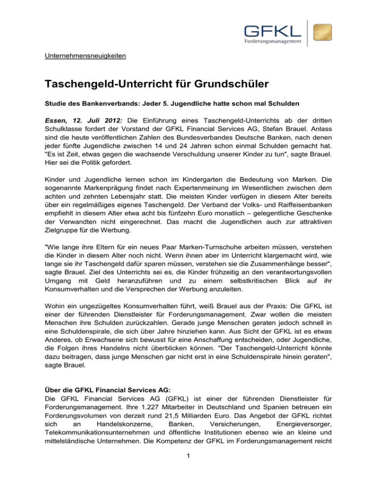 Unternehmensneuigkeiten Taschengeld-Unterricht für Grundschüler Studie des Bankenverbands: Jeder 5. Jugendliche hatte schon mal Schulden Essen, 12. Juli 2012: Die Einführung eines Taschengeld-Unterrichts ab der dritten Schulklasse fordert der Vorstand der GFKL Financial Services AG, Stefan Brauel. Anlass sind die heute veröffentlichen Zahlen des Bundesverbandes Deutsche Banken, nach denen jeder fünfte Jugendliche zwischen 14 und 24 Jahren schon einmal Schulden gemacht hat. "Es ist Zeit, etwas gegen die wachsende Verschuldung unserer Kinder zu tun", sagte Brauel. Hier sei die Politik gefordert. Kinder und Jugendliche lernen schon im Kindergarten die Bedeutung von Marken. Die sogenannte Markenprägung findet nach Expertenmeinung im Wesentlichen zwischen dem achten und zehnten Lebensjahr statt. Die meisten Kinder verfügen in diesem Alter bereits über ein regelmäßiges eigenes Taschengeld. Der Verband der Volks- und Raiffeisenbanken empfiehlt in diesem Alter etwa acht bis fünfzehn Euro monatlich – gelegentliche Geschenke der Verwandten nicht eingerechnet. Das macht die Jugendlichen auch zur attraktiven Zielgruppe für die Werbung. "Wie lange ihre Eltern für ein neues Paar Marken-Turnschuhe arbeiten müssen, verstehen die Kinder in diesem Alter noch nicht. Wenn ihnen aber im Unterricht klargemacht wird, wie lange sie ihr Taschengeld dafür sparen müssen, verstehen sie die Zusammenhänge besser", sagte Brauel. Ziel des Unterrichts sei es, die Kinder frühzeitig an den verantwortungsvollen Umgang mit Geld heranzuführen und zu einem selbstkritischen Blick auf ihr Konsumverhalten und die Versprechen der Werbung anzuleiten. Wohin ein ungezügeltes Konsumverhalten führt, weiß Brauel aus der Praxis: Die GFKL ist einer der führenden Dienstleister für Forderungsmanagement. Zwar wollen die meisten Menschen ihre Schulden zurückzahlen. Gerade junge Menschen geraten jedoch schnell in eine Schuldenspirale, die sich über Jahre hinziehen kann. Aus Sicht der GFKL ist es etwas Anderes, ob Erwachsene sich bewusst für eine Anschaffung entscheiden, oder Jugendliche, die Folgen ihres Handelns nicht überblicken können. "Der Taschengeld-Unterricht könnte dazu beitragen, dass junge Menschen gar nicht erst in eine Schuldenspirale hinein geraten", sagte Brauel. Über die GFKL Financial Services AG: Die GFKL Financial Services AG (GFKL) ist einer der führenden Dienstleister für Forderungsmanagement. Ihre 1.227 Mitarbeiter in Deutschland und Spanien betreuen ein Forderungsvolumen von derzeit rund 21,5 Milliarden Euro. Das Angebot der GFKL richtet sich an Handelskonzerne, Banken, Versicherungen, Energieversorger, Telekommunikationsunternehmen und öffentliche Institutionen ebenso wie an kleine und mittelständische Unternehmen. Die Kompetenz der GFKL im Forderungsmanagement reicht 1 von der treuhänderischen Betreuung von Handels- und Kreditforderungen bis zur Bewertung, Übernahme und Abwicklung von Konsumenten- und Immobiliendarlehen. Dabei steht die GFKL für kundenerhaltendes Forderungsmanagement mit hohem Qualitätsanspruch. Das bestätigt die Ratingagentur Standard & Poor’s und verleiht der GFKL das höchste Ranking als Servicer: „Strong, Outlook Stable“. Pressekontakt: GFKL Financial Services AG Rebecca Engels Pressesprecherin Limbecker Platz 1 45127 Essen Tel.: +49 201 102-1194 Fax: +49 201 102 1102-094 E-Mail: rebecca.engels@gfkl.com Internet: www.gfkl.com 2