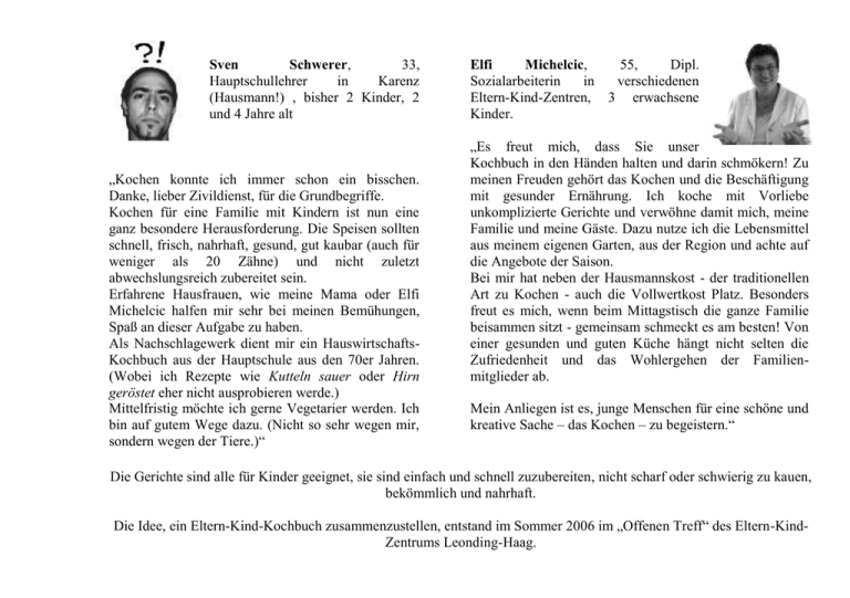 Sven Schwerer, 33, Hauptschullehrer in Karenz (Hausmann!) , bisher 2 Kinder, 2 und 4 Jahre alt Elfi Michelcic, 55, Dipl. Sozialarbeiterin in verschiedenen Eltern-Kind-Zentren, 3 erwachsene Kinder. „Es freut mich, dass Sie unser Kochbuch in den Händen halten und darin schmökern! Zu meinen Freuden gehört das Kochen und die Beschäftigung mit gesunder Ernährung. Ich koche mit Vorliebe unkomplizierte Gerichte und verwöhne damit mich, meine Familie und meine Gäste. Dazu nutze ich die Lebensmittel aus meinem eigenen Garten, aus der Region und achte auf die Angebote der Saison. Bei mir hat neben der Hausmannskost - der traditionellen Art zu Kochen - auch die Vollwertkost Platz. Besonders freut es mich, wenn beim Mittagstisch die ganze Familie beisammen sitzt - gemeinsam schmeckt es am besten! Von einer gesunden und guten Küche hängt nicht selten die Zufriedenheit und das Wohlergehen der Familienmitglieder ab. „Kochen konnte ich immer schon ein bisschen. Danke, lieber Zivildienst, für die Grundbegriffe. Kochen für eine Familie mit Kindern ist nun eine ganz besondere Herausforderung. Die Speisen sollten schnell, frisch, nahrhaft, gesund, gut kaubar (auch für weniger als 20 Zähne) und nicht zuletzt abwechslungsreich zubereitet sein. Erfahrene Hausfrauen, wie meine Mama oder Elfi Michelcic halfen mir sehr bei meinen Bemühungen, Spaß an dieser Aufgabe zu haben. Als Nachschlagewerk dient mir ein HauswirtschaftsKochbuch aus der Hauptschule aus den 70er Jahren. (Wobei ich Rezepte wie Kutteln sauer oder Hirn geröstet eher nicht ausprobieren werde.) Mittelfristig möchte ich gerne Vegetarier werden. Ich bin auf gutem Wege dazu. (Nicht so sehr wegen mir, sondern wegen der Tiere.)“ Mein Anliegen ist es, junge Menschen für eine schöne und kreative Sache – das Kochen – zu begeistern.“ Die Gerichte sind alle für Kinder geeignet, sie sind einfach und schnell zuzubereiten, nicht scharf oder schwierig zu kauen, bekömmlich und nahrhaft. Die Idee, ein Eltern-Kind-Kochbuch zusammenzustellen, entstand im Sommer 2006 im „Offenen Treff“ des Eltern-KindZentrums Leonding-Haag. 0 1 Tipps zur Haushaltsführung 3 2 Beikost und Breikost 7 3 Suppen 9 4 Topfenteig 15 5 Pizza 18 6 Knödel 19 7 Nudeln 22 8 Gerichte mit Fleisch und Fisch 25 9 „Herausbacken“ 30 10 Aufläufe 31 11 Beilagen 35 12 Salate 37 13 Jause 38 14 Für kleine Gäste 43 1 Das Kochbuch kommt neben den gängigen Maßeinheiten mit 3 Abkürzungen (TL – Teelöffel, EL – Esslöffel, Pkg. – Packung) aus. Es empfiehlt sich, nicht nur bei diesem Kochbuch, alle Rezepte vor dem Kochen ganz durchzulesen um sich einen Zeitplan zu überlegen und um sicher zu gehen, dass alle Zutaten vorrätig sind. Weiters empfehlen wir, bei der Küchenausrüstung auf Qualität zu achten, ein gutes Messer und eine massive, beschichtete Pfanne sparen Zeit und Nerven. Meistens gleicht sich höherer Kaufpreis durch längere Lebensdauer locker aus! Und noch einige Informationen zu den Autoren: Hascheeknödel, Grammelknödel Butterschmalz Weinessig Karten spielen Petersilie, Rosmarin Wein Schlagobers eigener Garten Gusseisengeschirr der Volleyballverein meines Sohnes Kardinal König Klassik Auto fahren Ski fahren walken Südoststeiermark 2 Sushi Olivenöl Apfelessig Basteln Schnittlauch Bier Sauerrahm Biokiste Achleitner Kelomat LASK Linz Ute Bock Punk-Rock Rad fahren Rad fahren Rad fahren Dänemark 1. Tipps zur Haushaltsführung Kaum eine andere Arbeit ist so aufwändig und vielseitig in ihren Anforderungen wie jene im Haushalt. Hier eine kleine Liste mit Rationalisierung der Hausarbeit. Vorschlägen zur Einkaufen - - - einkaufen nur mit Einkaufsliste gewissenhaft mit Sonderangeboten oder Vorratspackungen umgehen, nicht zuviel kaufen immer den Vorrat zu Hause überprüfen, bei einigen Dingen kann es sehr unangenehm sein, wenn sie ausgehen: Milch, Mehl, Salz, Eier, Säfte, Windeln, Klopapier, Küchenrolle, ... nie hungrig einkaufen gehen Einkaufskorb ist praktischer als Säcke oder Taschen Joghurt-Becher und ähnliches immer oben in den Einkaufskorb, schwere Sachen nach unten Bio, regional und Fair-Trade Neben kurzen Lieferwegen und biologischer Erzeugung ist für mich – etwa bei Kaffee, Orangensaft, Reis, Bananen – das „Fair Trade“Siegel sehr wichtig. Alle diese Produkte sind zwar etwas teurer, aber regen dadurch auch zum sorgsamen Umgang an. Es wird kaum weggeworfen oder verschwendet! Wäsche - Ich kaufe hauptsächlich regionale Erzeugnisse und immer öfter BioProdukte. 3 beim Einkauf bereits darauf achten, dass die Wäsche keine Spezialreinigung benötigt vor dem Aufhängen durchschütteln und in Form bringen, spart enorm viel Bügelarbeit falls gebügelt wird, die Wäsche nicht zu lange trocknen lassen die Wäsche nicht zu lange im Wäschekorb lassen - Kochen - vielleicht schon am Vorabend entscheiden, was gekocht wird Kochbücher zur Inspiration durchblättern einfache Gerichte kochen, die schmecken meist genauso gut auf Notfälle vorbereitet sein, Tiefkühltruhe nutzen vernünftige Vorräte anlegen Organisation, Tagesablauf - - Essen und Trinken nur bei Tisch, spart enorm viel Putz-Zeit ständige „Zwischenmahlzeiten“, wie Knabbereien sind absolut entbehrlich für unsere Kinder abends immer die Küche aufräumen rechtzeitig aufstehen Kinder dürfen und sollen mithelfen (dann allerdings etwas mehr Zeit einplanen) Putzen - eine gewisse Regelmäßigkeit, einen gewissen Plan entwickeln sparsam mit Putzmitteln umgehen 4 - die Fenster beim Putzen keinen direkten Sonnenstrahlen aussetzen Keine zu hohen Ansprüche an sich stellen, oft kommt Besuch, wenn totales Chaos herrscht, aber nicht vergessen: den anderen geht es genauso! Vorräte Hier zählt vor allem die eigene Erfahrung, da jeder Haushalt unterschiedliche Ansprüche hat. Kühlschrank, Tiefkühltruhe, Vakuum-Verpackungen und Dosen erleichtern die Vorratshaltung ungemein. In Erwartung kleinerer Notfälle oder Zeitengpässe sollte man auf 3-4 Tage ohne Einkaufen vorbereitet sein. Wir ha