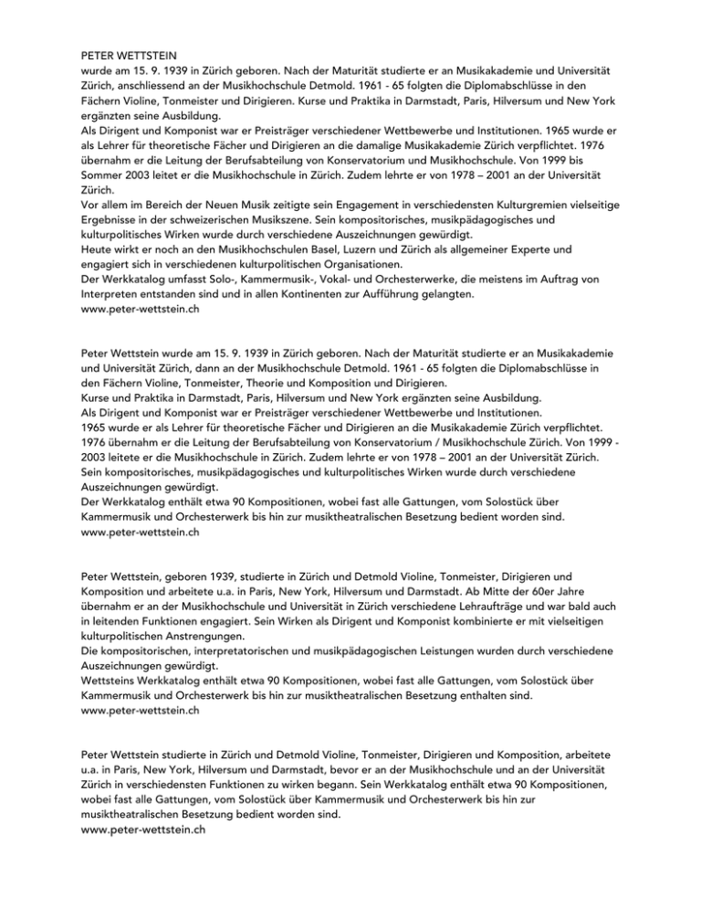 PETER WETTSTEIN wurde am 15. 9. 1939 in Zürich geboren. Nach der Maturität studierte er an Musikakademie und Universität Zürich, anschliessend an der Musikhochschule Detmold. 1961 - 65 folgten die Diplomabschlüsse in den Fächern Violine, Tonmeister und Dirigieren. Kurse und Praktika in Darmstadt, Paris, Hilversum und New York ergänzten seine Ausbildung. Als Dirigent und Komponist war er Preisträger verschiedener Wettbewerbe und Institutionen. 1965 wurde er als Lehrer für theoretische Fächer und Dirigieren an die damalige Musikakademie Zürich verpflichtet. 1976 übernahm er die Leitung der Berufsabteilung von Konservatorium und Musikhochschule. Von 1999 bis Sommer 2003 leitet er die Musikhochschule in Zürich. Zudem lehrte er von 1978 – 2001 an der Universität Zürich. Vor allem im Bereich der Neuen Musik zeitigte sein Engagement in verschiedensten Kulturgremien vielseitige Ergebnisse in der schweizerischen Musikszene. Sein kompositorisches, musikpädagogisches und kulturpolitisches Wirken wurde durch verschiedene Auszeichnungen gewürdigt. Heute wirkt er noch an den Musikhochschulen Basel, Luzern und Zürich als allgemeiner Experte und engagiert sich in verschiedenen kulturpolitischen Organisationen. Der Werkkatalog umfasst Solo-, Kammermusik-, Vokal- und Orchesterwerke, die meistens im Auftrag von Interpreten entstanden sind und in allen Kontinenten zur Aufführung gelangten. www.peter-wettstein.ch Peter Wettstein wurde am 15. 9. 1939 in Zürich geboren. Nach der Maturität studierte er an Musikakademie und Universität Zürich, dann an der Musikhochschule Detmold. 1961 - 65 folgten die Diplomabschlüsse in den Fächern Violine, Tonmeister, Theorie und Komposition und Dirigieren. Kurse und Praktika in Darmstadt, Paris, Hilversum und New York ergänzten seine Ausbildung. Als Dirigent und Komponist war er Preisträger verschiedener Wettbewerbe und Institutionen. 1965 wurde er als Lehrer für theoretische Fächer und Dirigieren an die Musikakademie Zürich verpflichtet. 1976 übernahm er die Leitung der Berufsabteilung von Konservatorium / Musikhochschule Zürich. Von 1999 2003 leitete er die Musikhochschule in Zürich. Zudem lehrte er von 1978 – 2001 an der Universität Zürich. Sein kompositorisches, musikpädagogisches und kulturpolitisches Wirken wurde durch verschiedene Auszeichnungen gewürdigt. Der Werkkatalog enthält etwa 90 Kompositionen, wobei fast alle Gattungen, vom Solostück über Kammermusik und Orchesterwerk bis hin zur musiktheatralischen Besetzung bedient worden sind. www.peter-wettstein.ch Peter Wettstein, geboren 1939, studierte in Zürich und Detmold Violine, Tonmeister, Dirigieren und Komposition und arbeitete u.a. in Paris, New York, Hilversum und Darmstadt. Ab Mitte der 60er Jahre übernahm er an der Musikhochschule und Universität in Zürich verschiedene Lehraufträge und war bald auch in leitenden Funktionen engagiert. Sein Wirken als Dirigent und Komponist kombinierte er mit vielseitigen kulturpolitischen Anstrengungen. Die kompositorischen, interpretatorischen und musikpädagogischen Leistungen wurden durch verschiedene Auszeichnungen gewürdigt. Wettsteins Werkkatalog enthält etwa 90 Kompositionen, wobei fast alle Gattungen, vom Solostück über Kammermusik und Orchesterwerk bis hin zur musiktheatralischen Besetzung enthalten sind. www.peter-wettstein.ch Peter Wettstein studierte in Zürich und Detmold Violine, Tonmeister, Dirigieren und Komposition, arbeitete u.a. in Paris, New York, Hilversum und Darmstadt, bevor er an der Musikhochschule und an der Universität Zürich in verschiedensten Funktionen zu wirken begann. Sein Werkkatalog enthält etwa 90 Kompositionen, wobei fast alle Gattungen, vom Solostück über Kammermusik und Orchesterwerk bis hin zur musiktheatralischen Besetzung bedient worden sind. www.peter-wettstein.ch