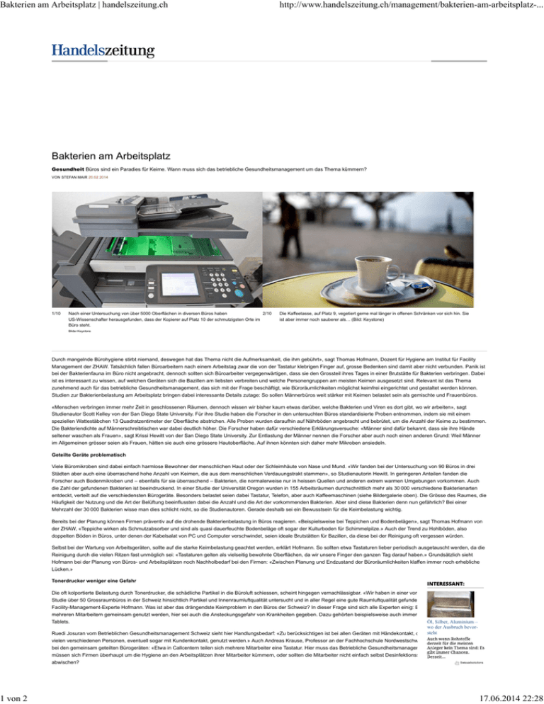 Bakterien am Arbeitsplatz | handelszeitung.ch 1 von 2 http://www.handelszeitung.ch/management/bakterien-am-arbeitsplatz-... Bakterien am Arbeitsplatz Gesundheit Büros sind ein Paradies für Keime. Wann muss sich das betriebliche Gesundheitsmanagement um das Thema kümmern? VON STEFAN MAIR 20.02.2014 1/10 Nach einer Untersuchung von über 5000 Oberflächen in diversen Büros haben 2/10 US-Wissenschafter herausgefunden, dass der Kopierer auf Platz 10 der schmutzigsten Orte im Büro steht. Die Kaffeetasse, auf Platz 9, vegetiert gerne mal länger in offenen Schränken vor sich hin. Sie ist aber immer noch sauberer als… (Bild: Keystone) Bilder Keystone Durch mangelnde Bürohygiene stirbt niemand, deswegen hat das Thema nicht die Aufmerksamkeit, die ihm gebührt», sagt Thomas Hofmann, Dozent für Hygiene am Institut für Facility Management der ZHAW. Tatsächlich fallen Büroarbeitern nach einem Arbeitstag zwar die von der Tastatur klebrigen Finger auf, grosse Bedenken sind damit aber nicht verbunden. Panik ist bei der Bakterienfauna im Büro nicht angebracht, dennoch sollten sich Büroarbeiter vergegenwärtigen, dass sie den Grossteil ihres Tages in einer Brutstätte für Bakterien verbringen. Dabei ist es interessant zu wissen, auf welchen Geräten sich die Bazillen am liebsten verbreiten und welche Personengruppen am meisten Keimen ausgesetzt sind. Relevant ist das Thema zunehmend auch für das betriebliche Gesundheitsmanagement, das sich mit der Frage beschäftigt, wie Büroräumlichkeiten möglichst keimfrei eingerichtet und gestaltet werden können. Studien zur Bakterienbelastung am Arbeitsplatz bringen dabei interessante Details zutage: So sollen Männerbüros weit stärker mit Keimen belastet sein als gemischte und Frauenbüros. «Menschen verbringen immer mehr Zeit in geschlossenen Räumen, dennoch wissen wir bisher kaum etwas darüber, welche Bakterien und Viren es dort gibt, wo wir arbeiten», sagt Studienautor Scott Kelley von der San Diego State University. Für ihre Studie haben die Forscher in den untersuchten Büros standardisierte Proben entnommen, indem sie mit einem speziellen Wattestäbchen 13 Quadratzentimeter der Oberfläche abstrichen. Alle Proben wurden daraufhin auf Nährböden angebracht und bebrütet, um die Anzahl der Keime zu bestimmen. Die Bakteriendichte auf Männerschreibtischen war dabei deutlich höher. Die Forscher haben dafür verschiedene Erklärungsversuche: «Männer sind dafür bekannt, dass sie ihre Hände seltener waschen als Frauen», sagt Krissi Hewitt von der San Diego State University. Zur Entlastung der Männer nennen die Forscher aber auch noch einen anderen Grund: Weil Männer im Allgemeinen grösser seien als Frauen, hätten sie auch eine grössere Hautoberfläche. Auf ihnen könnten sich daher mehr Mikroben ansiedeln. Geteilte Geräte problematisch Viele Büromikroben sind dabei einfach harmlose Bewohner der menschlichen Haut oder der Schleimhäute von Nase und Mund. «Wir fanden bei der Untersuchung von 90 Büros in drei Städten aber auch eine überraschend hohe Anzahl von Keimen, die aus dem menschlichen Verdauungstrakt stammen», so Studienautorin Hewitt. In geringeren Anteilen fanden die Forscher auch Bodenmikroben und – ebenfalls für sie überraschend – Bakterien, die normalerweise nur in heissen Quellen und anderen extrem warmen Umgebungen vorkommen. Auch die Zahl der gefundenen Bakterien ist beeindruckend. In einer Studie der Universität Oregon wurden in 155 Arbeitsräumen durchschnittlich mehr als 30 000 verschiedene Bakterienarten entdeckt, verteilt auf die verschiedensten Bürogeräte. Besonders belastet seien dabei Tastatur, Telefon, aber auch Kaffeemaschinen (siehe Bildergalerie oben). Die Grösse des Raumes, die Häufigkeit der Nutzung und die Art der Belüftung beeinflussten dabei die Anzahl und die Art der vorkommenden Bakterien. Aber sind diese Bakterien denn nun gefährlich? Bei einer Mehrzahl der 30 000 Bakterien wisse man dies schlicht nicht, so die Studienautoren. Gerade deshalb sei ein Bewusstsein für die Keimbelastung wichtig. Bereits bei der Planung können Firmen präventiv auf die drohende Bakterienbelastung in Büros reagieren. «Beispielsweise bei Teppichen und Bodenbelägen», sagt Thomas Hofmann von der ZHAW, «Teppiche wirken als Schmutzabsorber und sind als quasi dauerfeuchte Bodenbeläge oft sogar der Kulturboden für Schimmelpilze.» Auch der Trend zu Hohlböden, also doppelten Böden in Büros, unter denen der Kabelsalat von PC und Computer verschwindet, seien ideale Brutstätten für Bazillen, da diese bei der Reinigung oft vergessen würden. Selbst bei der Wartung von Arbeitsgeräten, sollte auf die starke Keimbelastung geachtet werden, erklärt Hofmann. So sollten etwa Tastaturen lieber periodisch ausgetauscht werden, da die Reinigung durch die vielen Ritzen fast unmöglich sei: «Tastaturen gelten als vielseitig bewohnte Oberflächen, da wir unsere Finger den ganzen Tag darauf haben.» Grundsätzlich sieht Hofmann bei der Planung von Büros- und Arbeitsplätzen noch Nachholbedarf bei den Firmen: «Zwischen Planung und Endzustand der Büroräumlichkeiten klaffen immer noch erhebliche Lücken.» Tonerdrucker weniger eine Gefahr Die oft kolportierte Belastung durch Tonerdrucker, die schädliche Partikel in die Büroluft schiessen, scheint hingegen vernachlässigbar. «Wir haben in einer vor kurzem abgeschlossenen Studie über 50 Grossraumbüros in der Schweiz hinsichtlich Partikel und Innenraumluftqualität untersucht und in aller Regel eine gute Raumluftqualität gefunden», erklärt der Hygiene- und Facility-Management-Experte Hofmann. Was ist aber das drängendste Keimproblem in den Büros der Schweiz? In dieser Frage sind sich alle Experten einig: Es sind Geräte, die von mehreren Mitarbeitern gemeinsam genutzt werden, hier sei auch die Ansteckungsgefahr von Krankheiten gegeben. Dazu gehörten beispielsweise auch immer öfter gemeinsam genutzte Tablets. Öl, Silber, Aluminium – wo der Ausbr