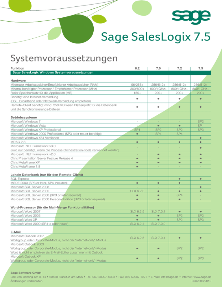 Sage SalesLogix 7.5 Systemvoraussetzungen Funktion 6.2 7.0 7.2 7.5 Sage SalesLogix Windows Systemvoraussetzungen Hardware Minimaler Arbeitsspeicher/Empfohlener Arbeitsspeicher (RAM) 96/256+ 256/512+ 256/512+ Minimal benötigter Prozessor / Empfohlener Prozessor (MHz) 300/800+ 800/1GHz+ 800/1GHz+ Freier Speicherplatz für die Applikation (MB) 150+ 200+ 200+ Benötigt eine Internet-Verbindung (DSL, Broadband oder Netzwerk-Verbindung empfohlen) Remote-Client benötigt mind. 250 MB freien Plattenplatz für die Datenbank und die Synchronisierungs-Dateien Betriebssysteme Microsoft Windows 7 - - - Microsoft Windows Vista - Microsoft Windows XP Professional SP1 SP2 SP2 Microsoft Windows 2000 Professional (SP3 oder neuer benötigt) SP4 SP4 Microsoft Windows X64 Versionen - - - MDAC 2.8 Microsoft .NET Framework v3.0 - - - (wird nur benötigt, wenn die Process-Orchestration-Tools verwendet werden) Microsoft .NET Framework v2.0 - Citrix Presentation Server Feature Release 4 Citrix MetaFrame XP Citrix MetaFrame 1.8 - - Lokale Datenbank (nur für den Remote-Client) SQL Express - - MSDE 2000 (SP3 or later, SP4 included) Microsoft SQL Server 2008 - - - Microsoft SQL Server 2005 SLX 6.2.3 Microsoft SQL Server 2000 (SP3 or later required) SP4 Microsoft SQL Server 2000 Personal Edition (SP3 or later required) Word-Prozessor (für die Mail-Merge Funktionalitäten) Microsoft Word 2007 SLX 6.2.5 SLX 7.0.1 Microsoft Word 2003 SP2 Microsoft Word XP SP2 Microsoft Word 2000 (SR1-a oder neuer) SLX 6.2.4 SLX 7.0.0 - E-Mail Microsoft Outlook 2007 SLX 6.2.5 SLX 7.0.1 Workgroup oder Corporate-Modus, nicht der "Internet-only" Modus Microsoft Outlook 2003 Workgroup oder Corporate-Modus, nicht der "Internet-only"-Modus SP2 Word is nicht empfohlen als E-Mail-Editor zusammen mit Outlook Microsoft Outlook XP SP2 Workgroup oder Corporate-Modus, nicht der "Internet-only"-Modus 256/512+ 800/1GHz+ 200+ SP2 SP1 SP3 - - - - SP2 SP3 - SP2 SP3 Sage Software GmbH Emil-von-Behring-Str. 8–14 • 60439 Frankfurt am Main • Tel.: 069 50007- 6333 • Fax: 069 50007-7277 • E-Mail: info@sage.de • Internet: www.sage.de Änderungen vorbehalten. Stand 08/2010 Sage SalesLogix 7.5 Systemvoraussetzungen Funktion 6.2 7.0 7.2 Microsoft Outlook 2000 (SR-1a oder neuer benötigt) SLX 6.2.4 nur Workgroup oder Corporate-Modus, nicht der "Internet-only"-Modus und früher SLX 7.0.0 Word is nicht empfohlen als E-Mail-Editor zusammen mit Outlook Sage SalesLogix Mail Client (liegt bei) Sage SalesLogix Mail Client unterstützt Internet mail, Lotus Notes R5 im "Office Modus", und GroupWise 5.5 und 6.0 Reporting Crystal Reports Professional 8.5 XI R2 XI R2 Fax Microsoft Fax Service Browser Microsoft Internet Explorer 7.0 SLX 6.2.5 SLX 7.0.1 Microsoft Internet Explorer 6.01 Microsoft Internet Explorer 5.5 Synchronisation zu "Personal Information Managers", die Intellisync für Sage SalesLogix nutzen (enthalten) Microsoft Outlook 2007 SLX 6.2.5 SLX 7.0.1 SLX 6.2.4 nur Microsoft Outlook 2000 (SR-1a oder neuer benötigt) - oder früher SLX 7.0.0 Microsoft Outlook XP SP2 Microsoft Outlook 2003 (SR-1a oder neuer benötigt) SP2 Lotus Notes 6.5 im “Office Modus” Lotus Notes 5.x im “Office Modus” Novell GroupWise 5.5 (nur Export von Sage SalesLogix zu GroupWise) Synchronisation zu mobilen Endgeräten Es ist möglich, zu mobilen Endgeräten von Palm OS, RIM Blackberry, Pocket PC und anderen kompatiblem Endgeräten zu synchroniseren. Mit Intellisync für Sage SalesLogix und der Nokia Intellisync Version (nicht enthalten) ist es möglich, zwischen den folgenden Endgeräten zu synchronisieren: - Palm Powered Handheld Synchronisation - Pocket PC Synchonisation 7.5 - XI R2 SP3 - SP3 SP2 - Sage Software GmbH Emil-von-Behring-Str. 8–14 • 60439 Frankfurt am Main • Tel.: 069 50007- 6333 • Fax: 069 50007-7277 • E-Mail: info@sage.de • Internet: www.sage.de Änderungen vorbehalten. Stand 08/2010 Sage SalesLogix 7.5 Systemvoraussetzungen Funktion 6.2 7.0 7.2 7.5 Sage SalesLogix Administrations Workstation Voraussetzungen Hardware Minimaler Arbeitsspeicher/Empfohlener Arbeitsspeicher (RAM) 128/256+ 256/512+ 256/512+ Empfohlender Speicher für Architect Customization und Development (MB) 384+ 1GB+ 1GB+ Minimal benötigter Prozessor / Empfohlener Prozessor (MHz) 300/800+ 800/1GHz+ 800/1GHz+ Freier Speicherplatz für die Applikation (MB) 500+ 500+ 500+ Betriebssysteme Microsoft Windows 7 - - - Microsoft Windows Vista - Microsoft Windows XP Professional SP1 SP2 SP2 Microsoft Windows 2000 Professional (SP3 oder neuer benötigt) SP4 SP4 MDAC 2.8 Word-Prozessor (für die Mail-Merge Template Funktionalitäten) Microsoft Word 2007 SLX 6.2.5 SLX 7.0.1 Microsoft Word 2003 SP2 Microsoft Word XP SP2 Microsoft Word 2000 (SR1-a oder neuer) SLX 6.2.4 SLX 7.0.0 - Reporting Crystal Reports Professional 8.5 XI R2 XI R2 Browser Microsoft Internet Explorer 7.0 SLX 6.2.5 SLX 7.0.1 Microsoft Internet Explorer 6.01 Microsoft Internet Explorer 5.5 512/1G+ 1GB+ 800/1GHz+ 500+ SP2 SP1 SP3 - SP2 SP3 - XI R2 SP3 - Sage SalesLogix Host Datenbank Server Voraussetzungen Hardware Minimaler Arbeitsspeicher/Empfohlener Arbeitsspeicher (RAM) 256/512+ 256/1GB+ 256/1GB+ Minimal benötigter Prozessor / Empfohlener Prozessor (MHz) 450/800+ 800/1.5G+ 800/1.5G+ Freier Speicherplatz für die Applikation (MB) 2000+ 2000+ 2000+ Betriebssysteme Microsoft Windows 2008 R2 Server - - - Microsoft Windows 2008 Server - - - Microsoft Windows 2003 Server (SP1 oder neuer benötigt) SP1 SP1 SP2 Microsoft Windows 2000 Server und Advanced Server (SP3 oder neuer benötigt) SP4 SP4 MDAC 2.8 (enthalten) 1GB/4GB+ 800/1.5G+ 2000+ SP2 SP2 - Sage Software GmbH Emil-von-Behring-Str. 8–14 • 60439 Frankfurt am Main • Tel.: 069 50007- 6333 • Fax: 069 50007-7277 • E-Mail: info@sage.de • Internet: www.sage.de Änderungen vorbehalten. Stand 08/2010 Sage SalesLogix 7.5 Systemvoraussetzungen Funktion 6.2 7.0 7.2 Relationales Datenbank Management System (RDBMS) Microsoft SQL-Server 2008 - - - Microsoft SQL-Server 2005